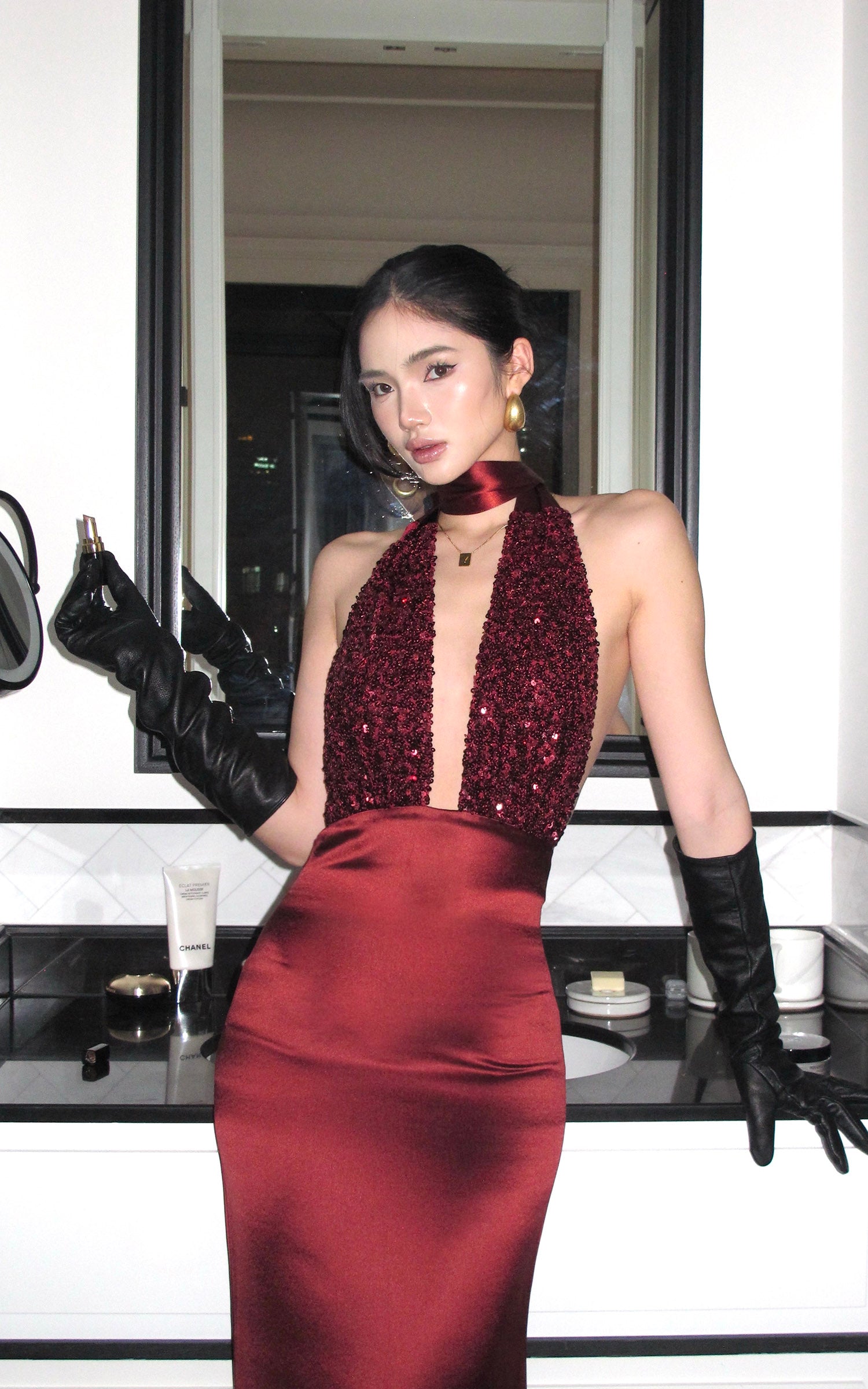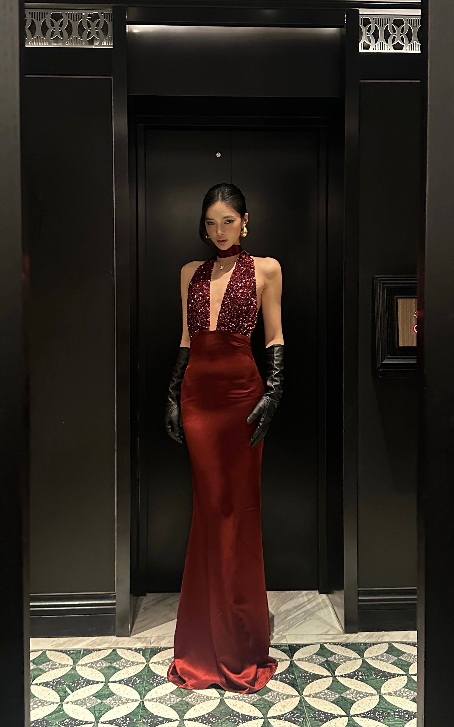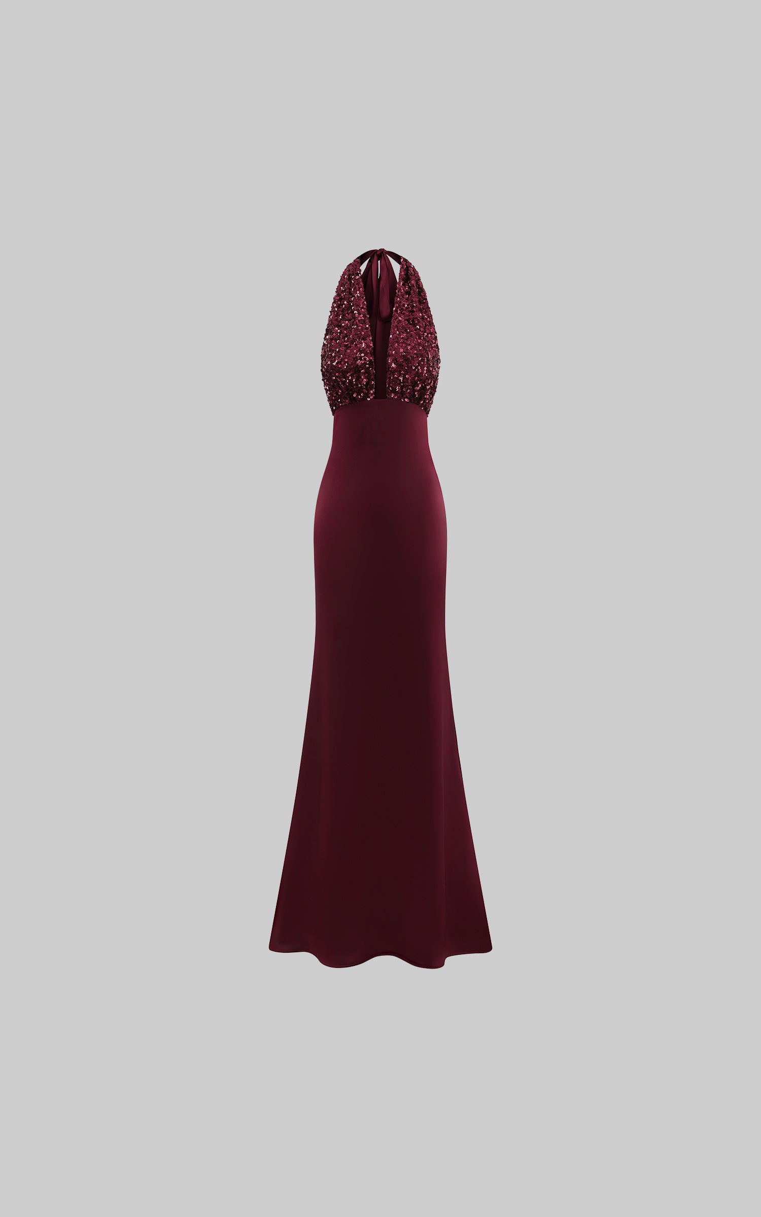 ROVENTE Deep V Halter Sequin Open-Back Maxi Dress