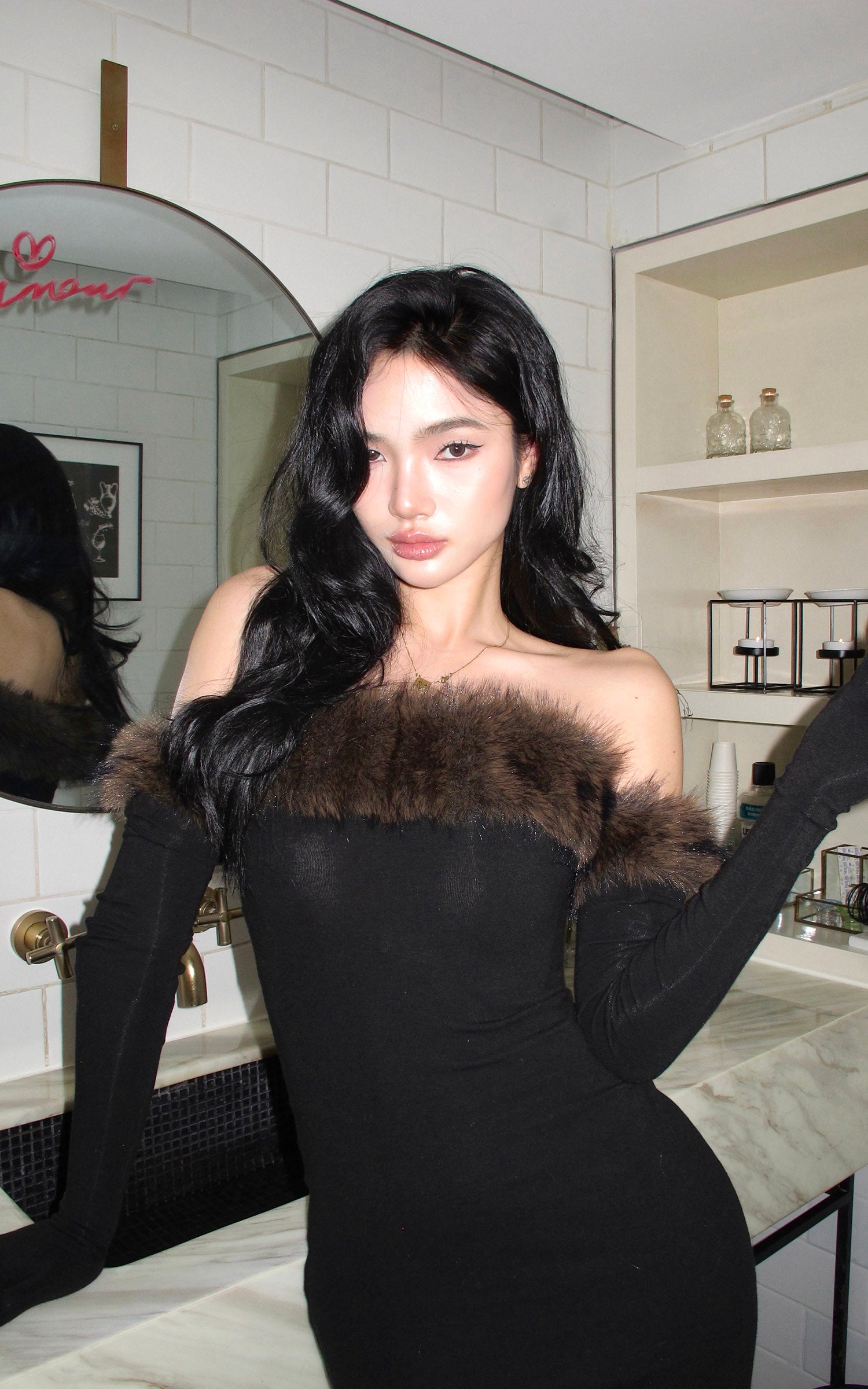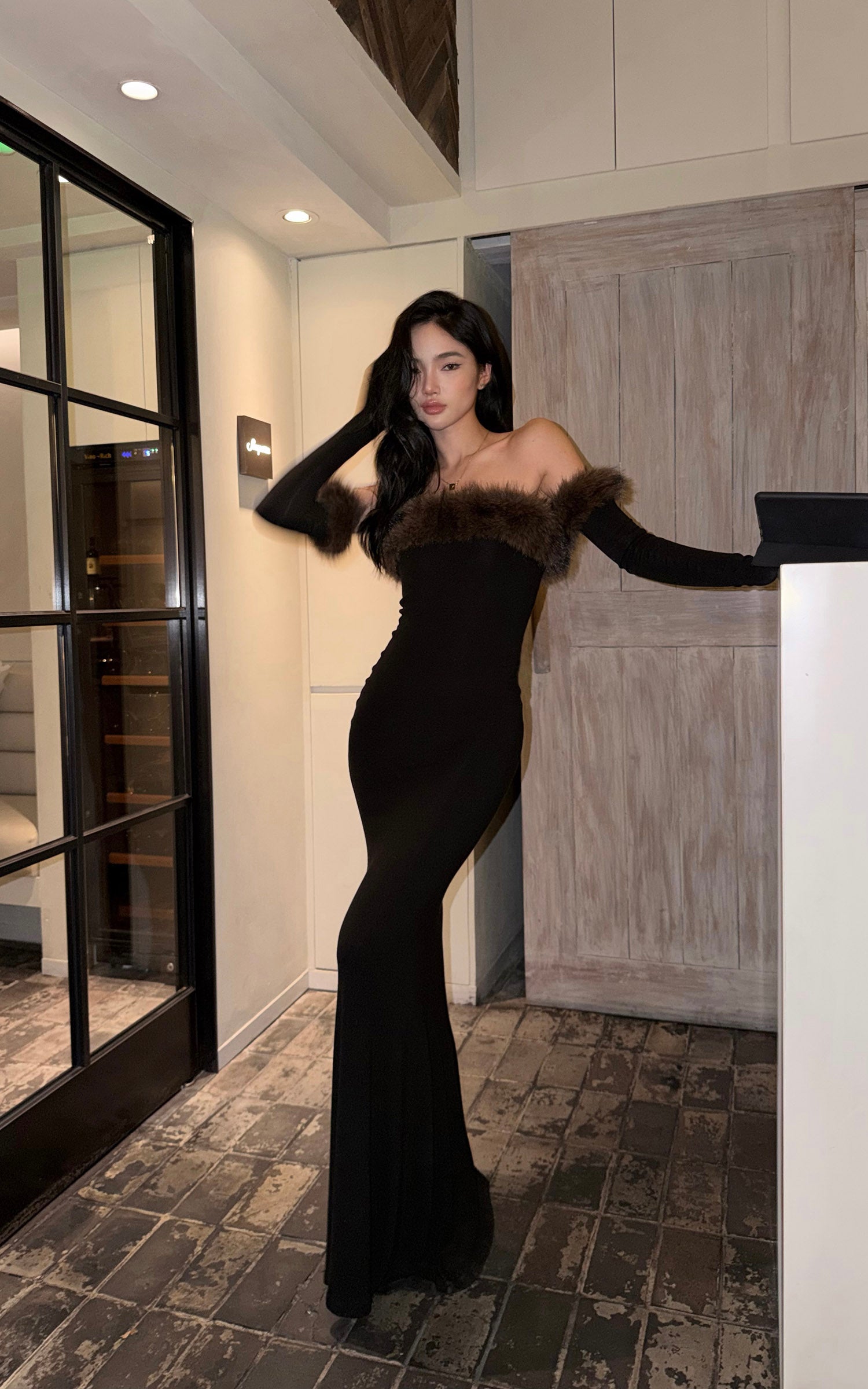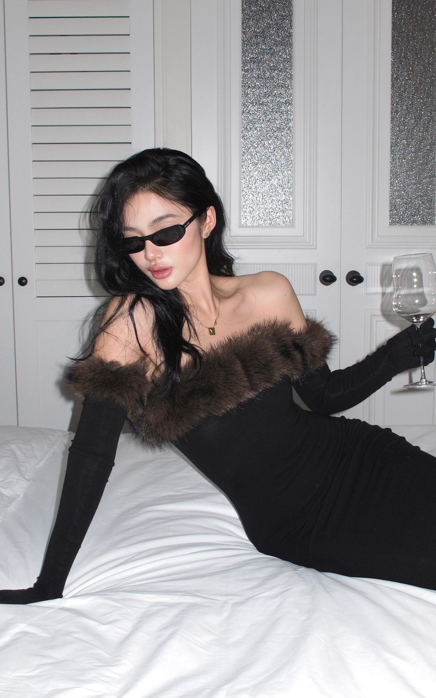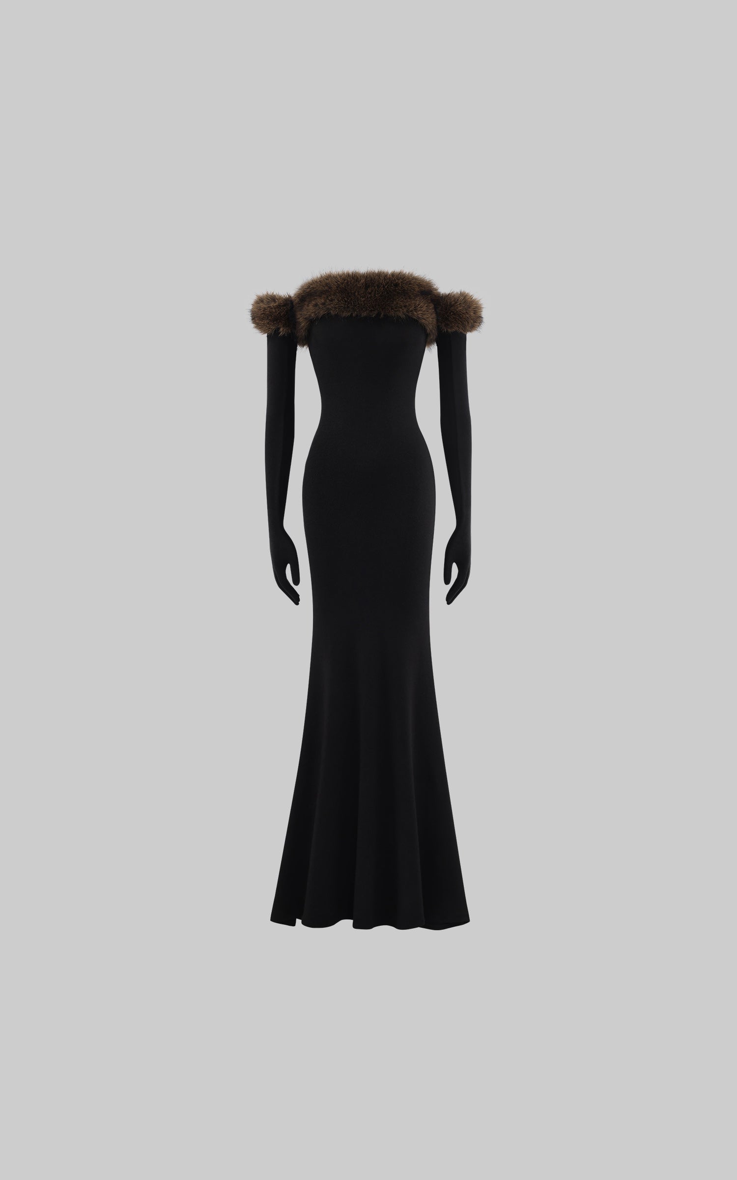 ROVENTE Faux Fur Off-Shoulder Long Dress