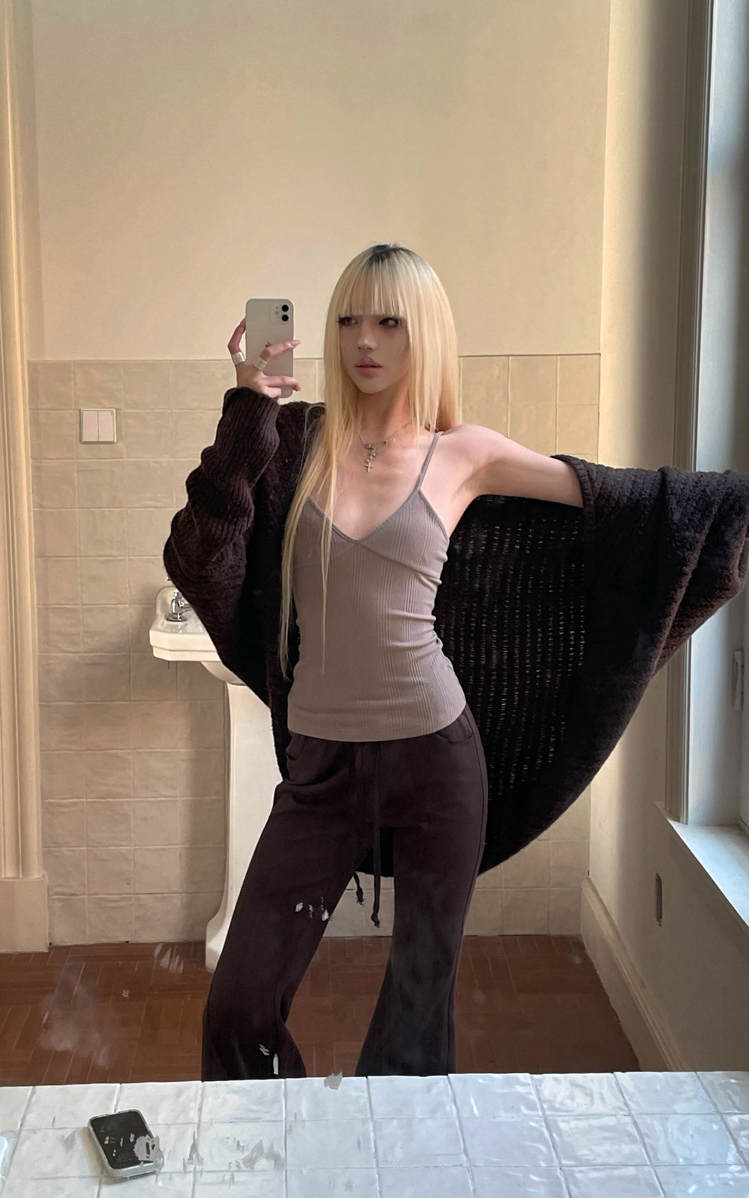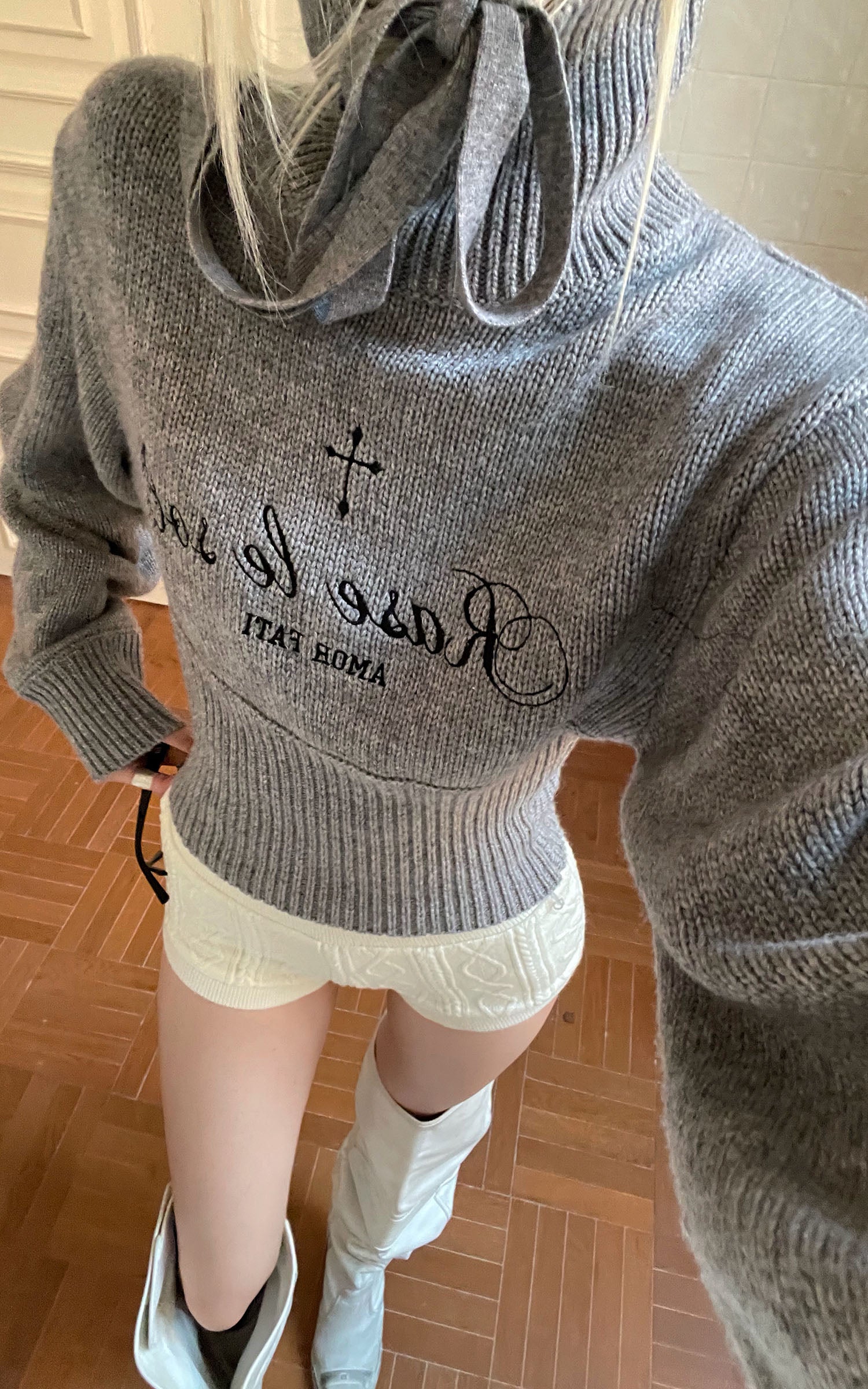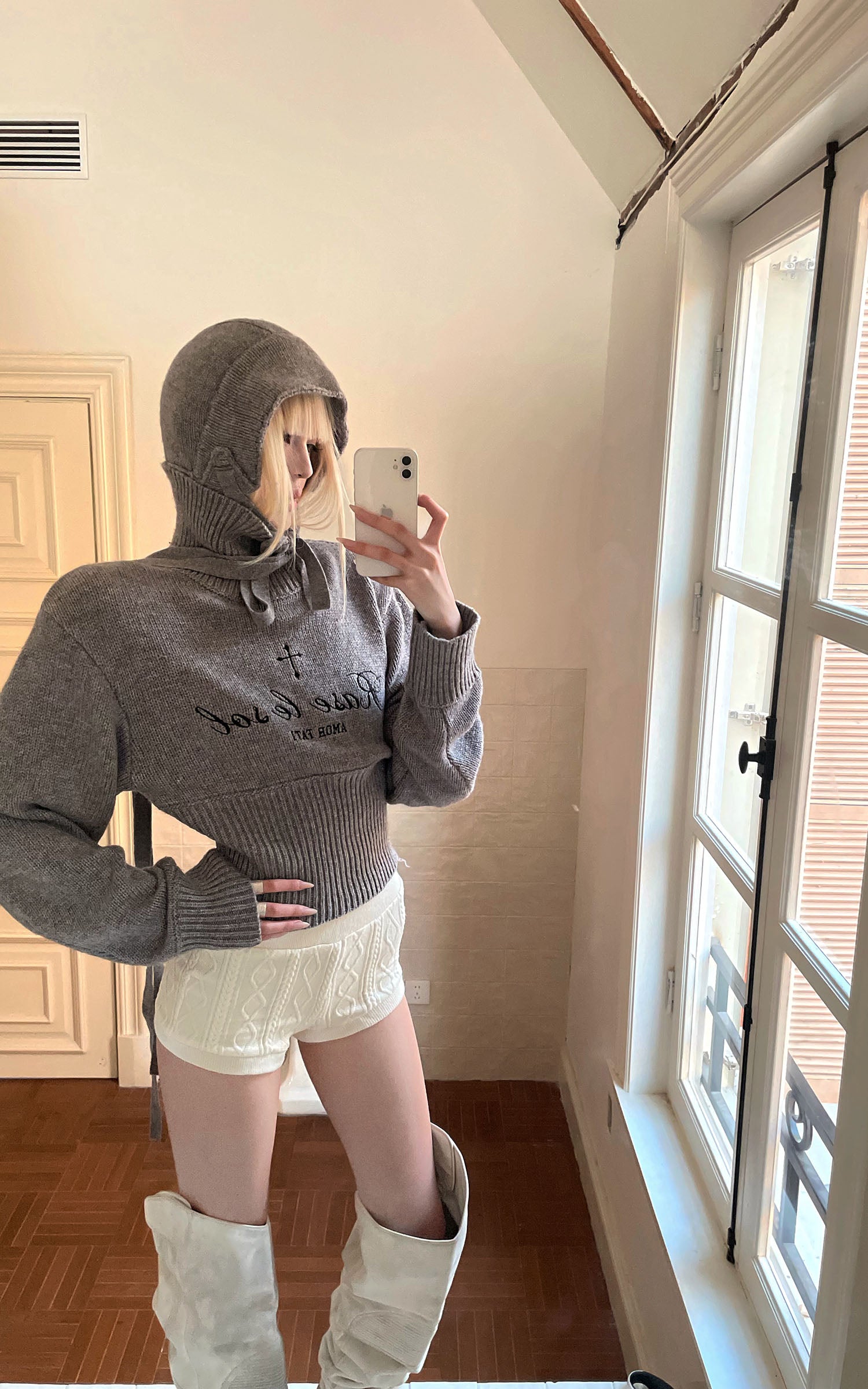 Rase le sol Grey Knit Sheer Long Sleeve Top with Minimalist Bra Layered Set