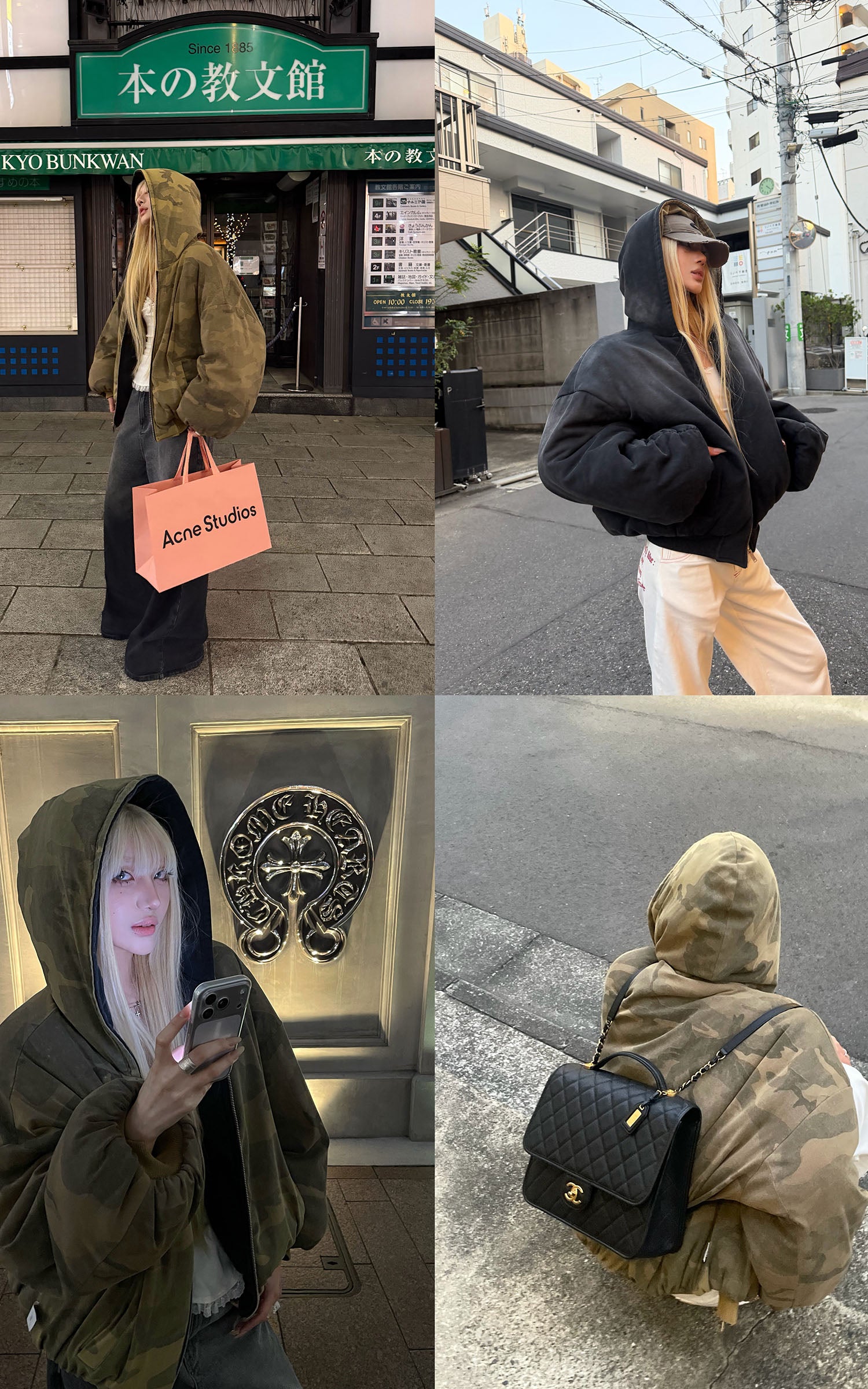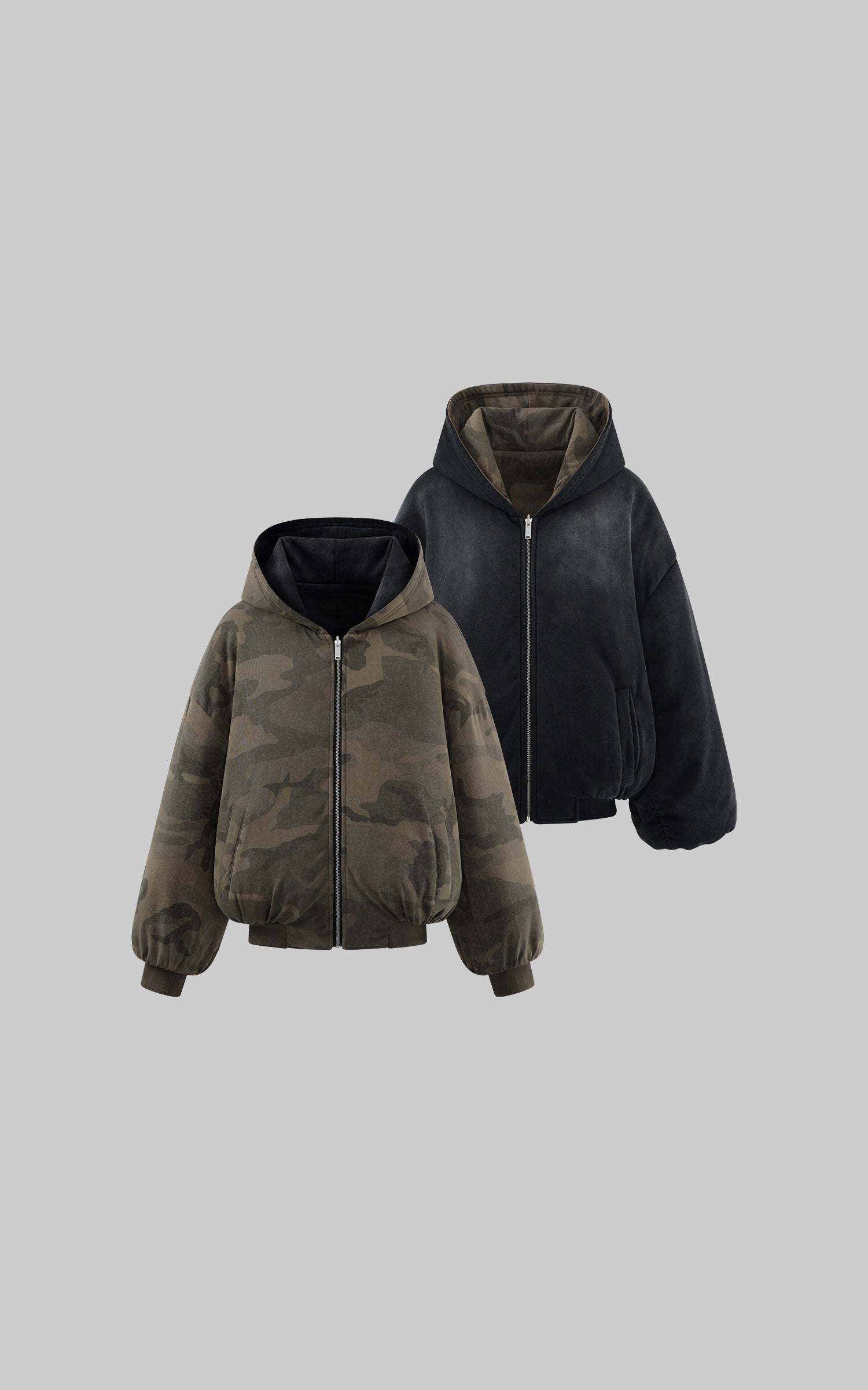 Rase le sol Reversible Hooded Puffer Jacket with Camo and Solid Color Sides