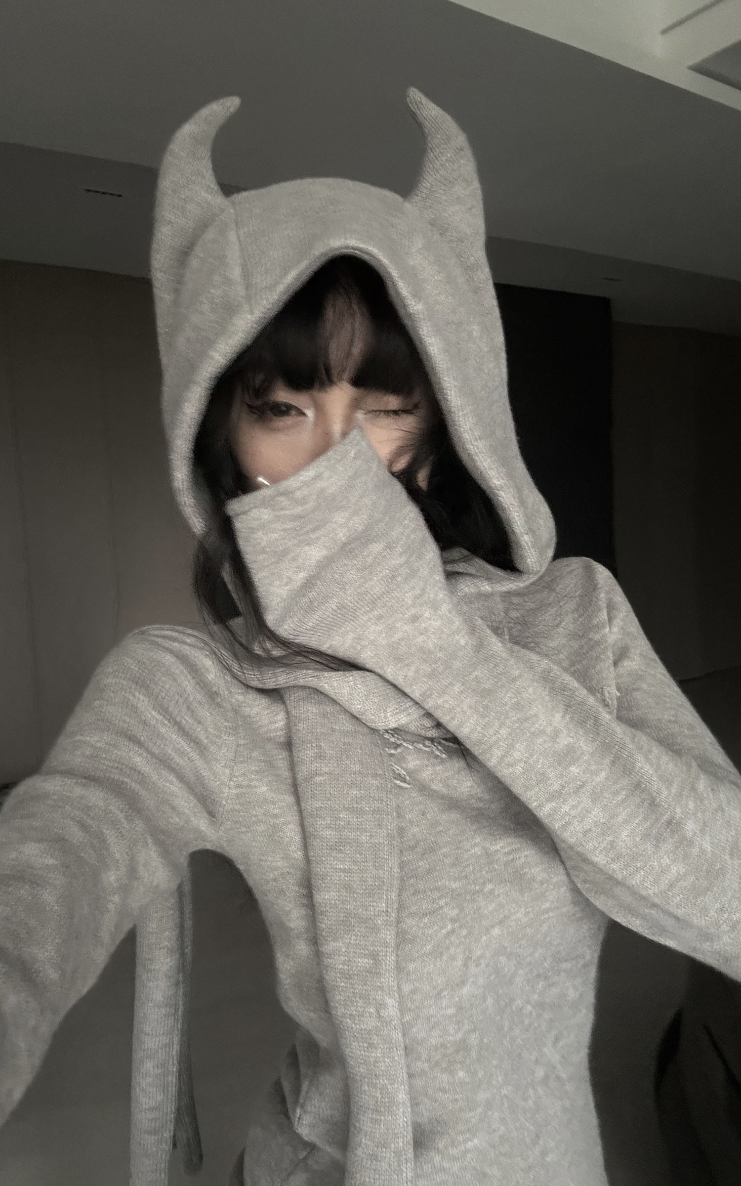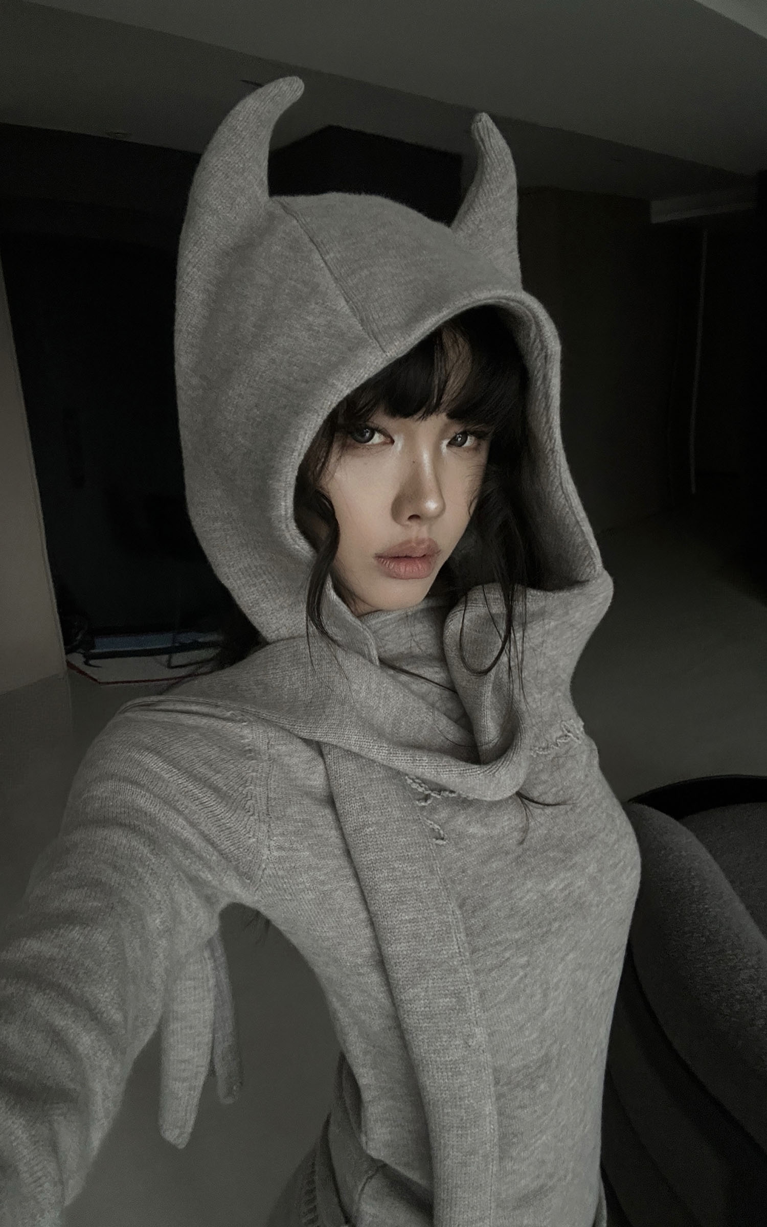 WARDEN EDGE Devil-Horn Knit Hood with Extended Scarf Detail