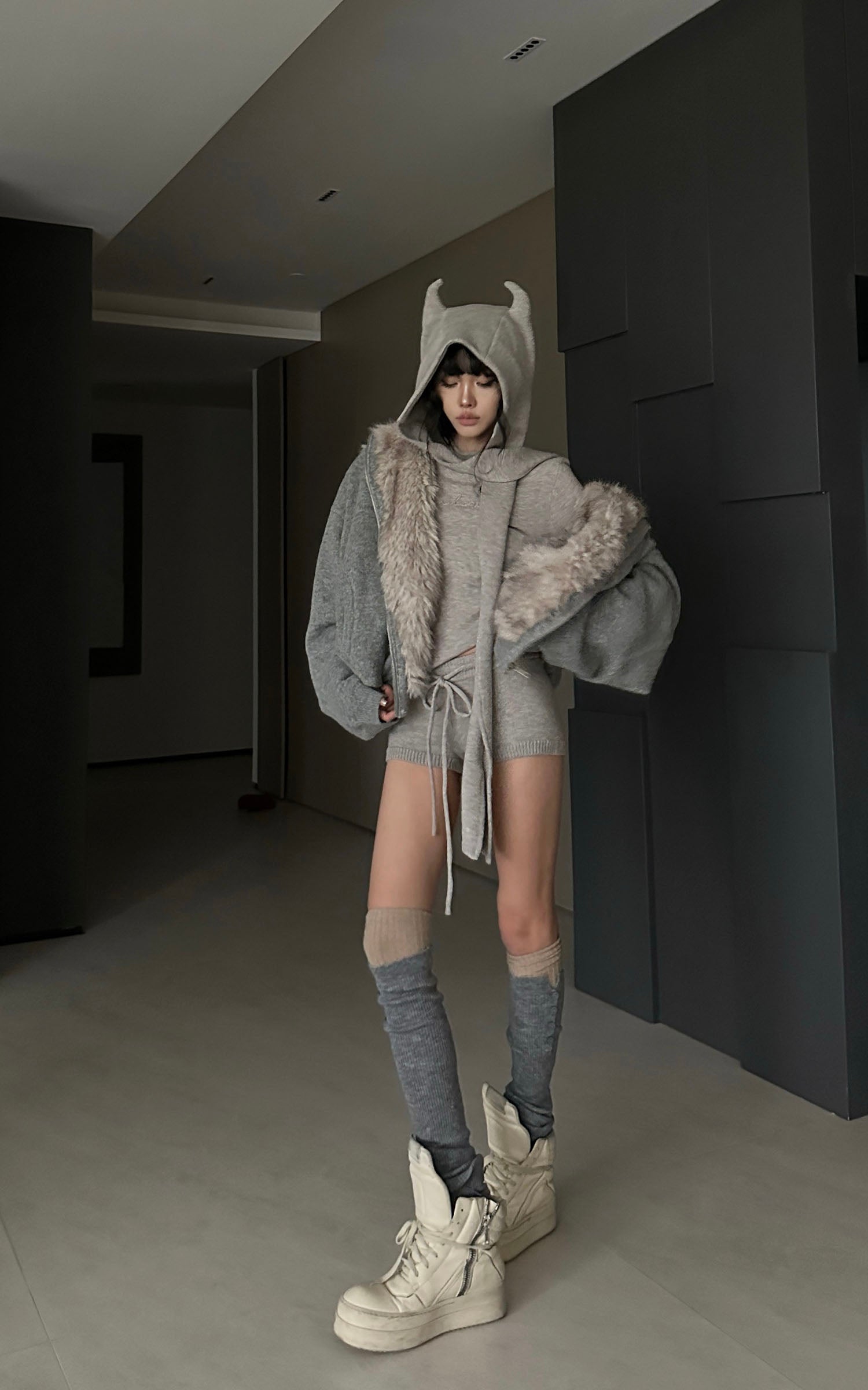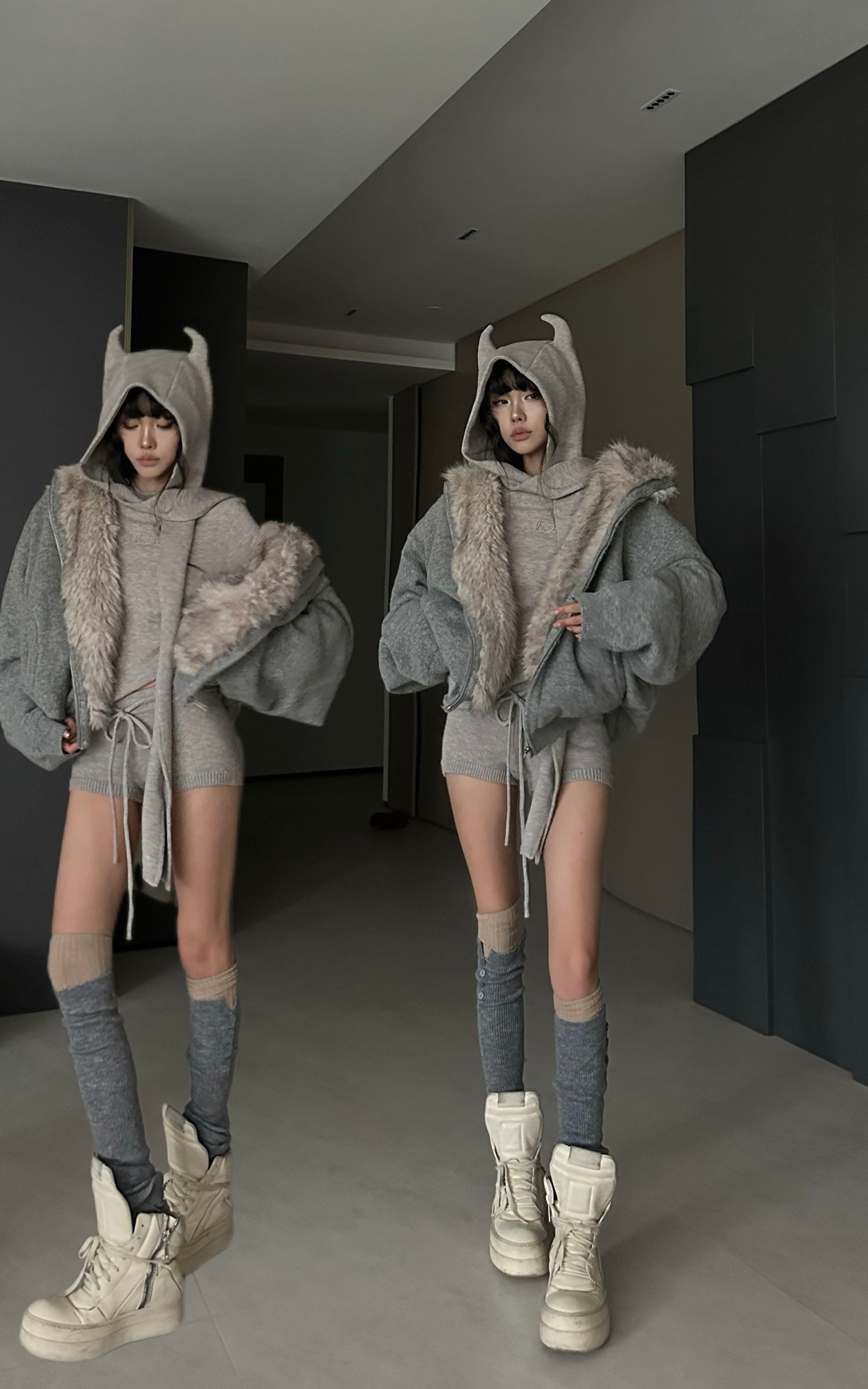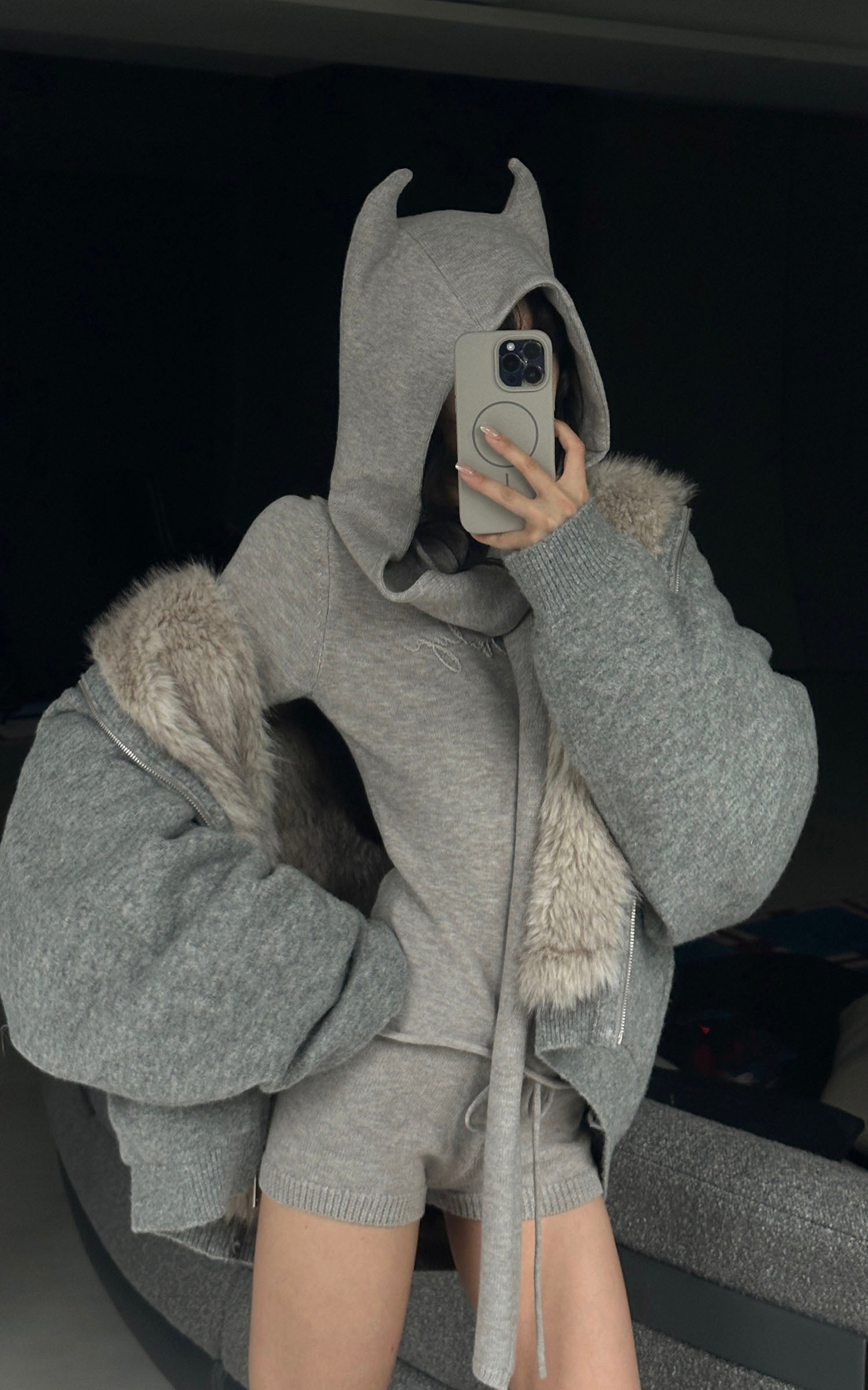 WARDEN EDGE Furry Hood Jacket & Knit Hood Hat Set with Slim Top and Drawstring Shorts