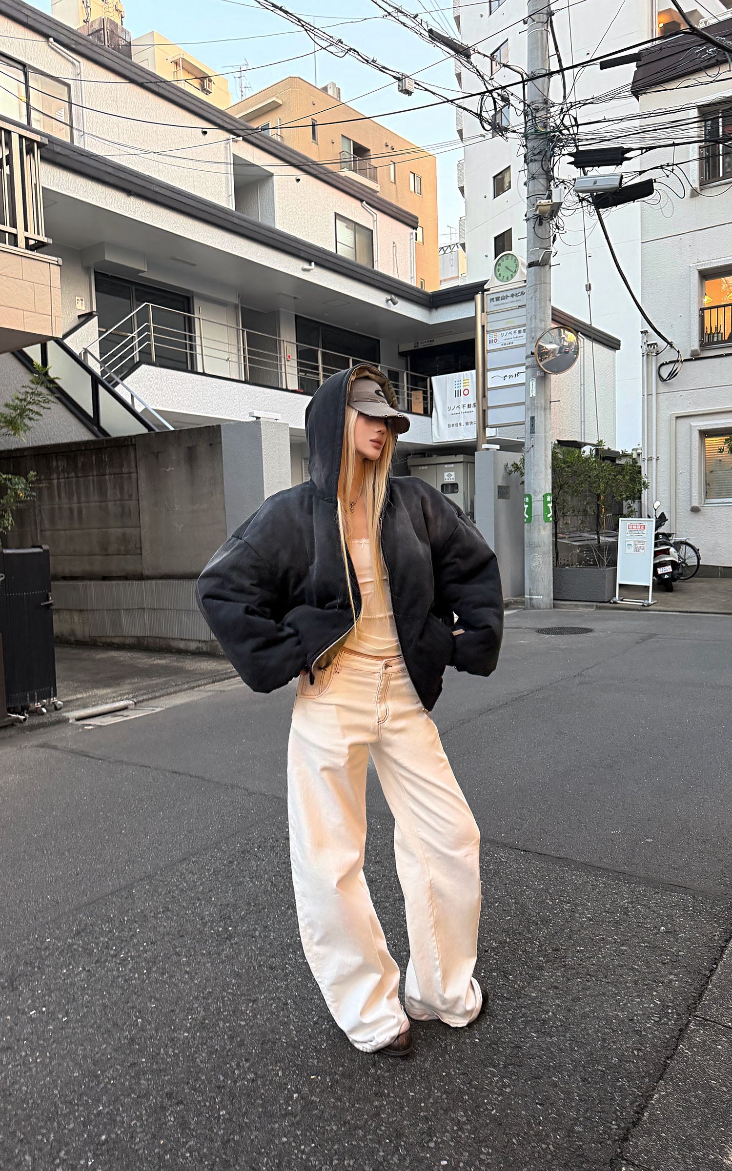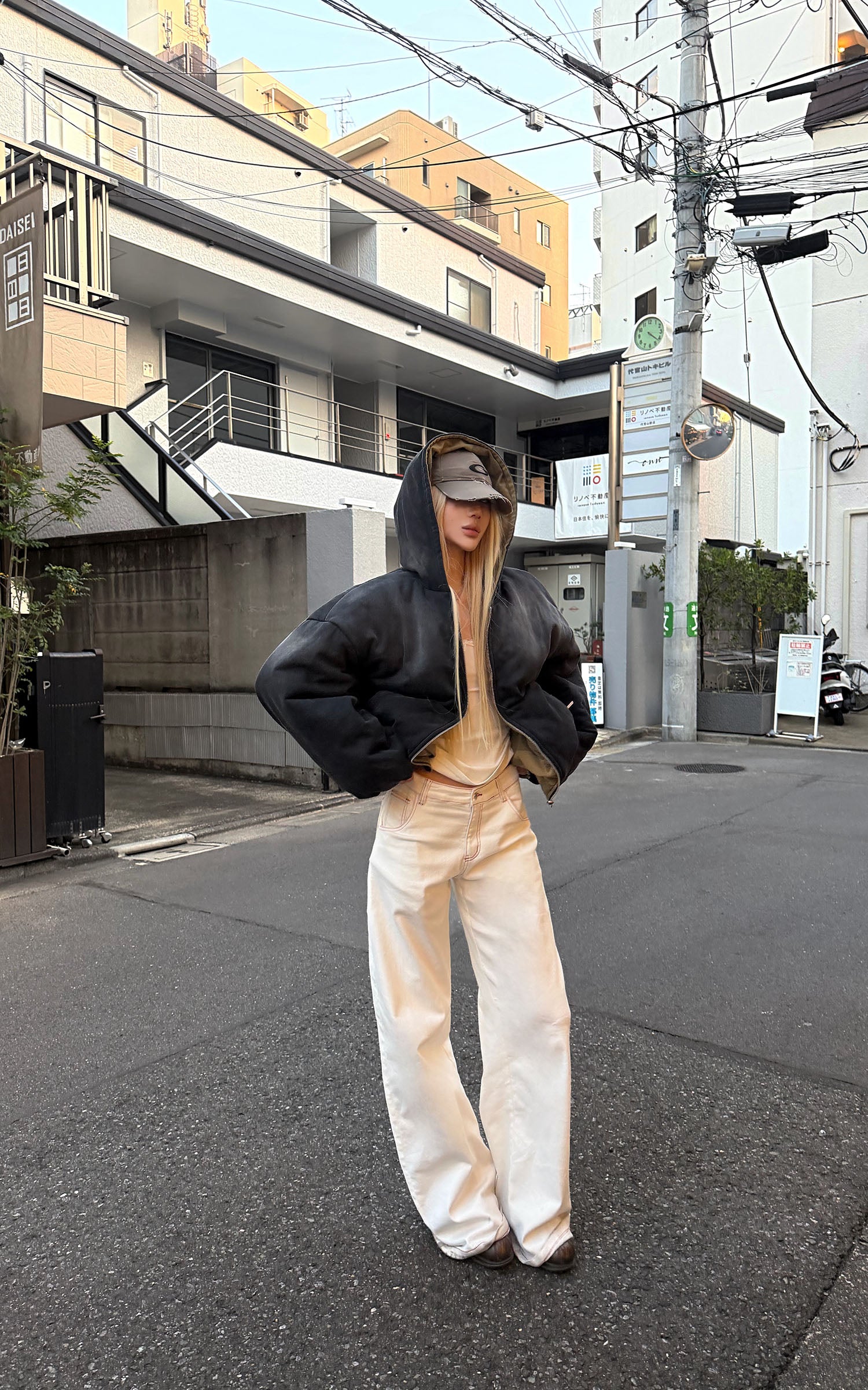 IAMXIAA Cropped Puffer Jacket with Faux Fur Hood and Button Detail
