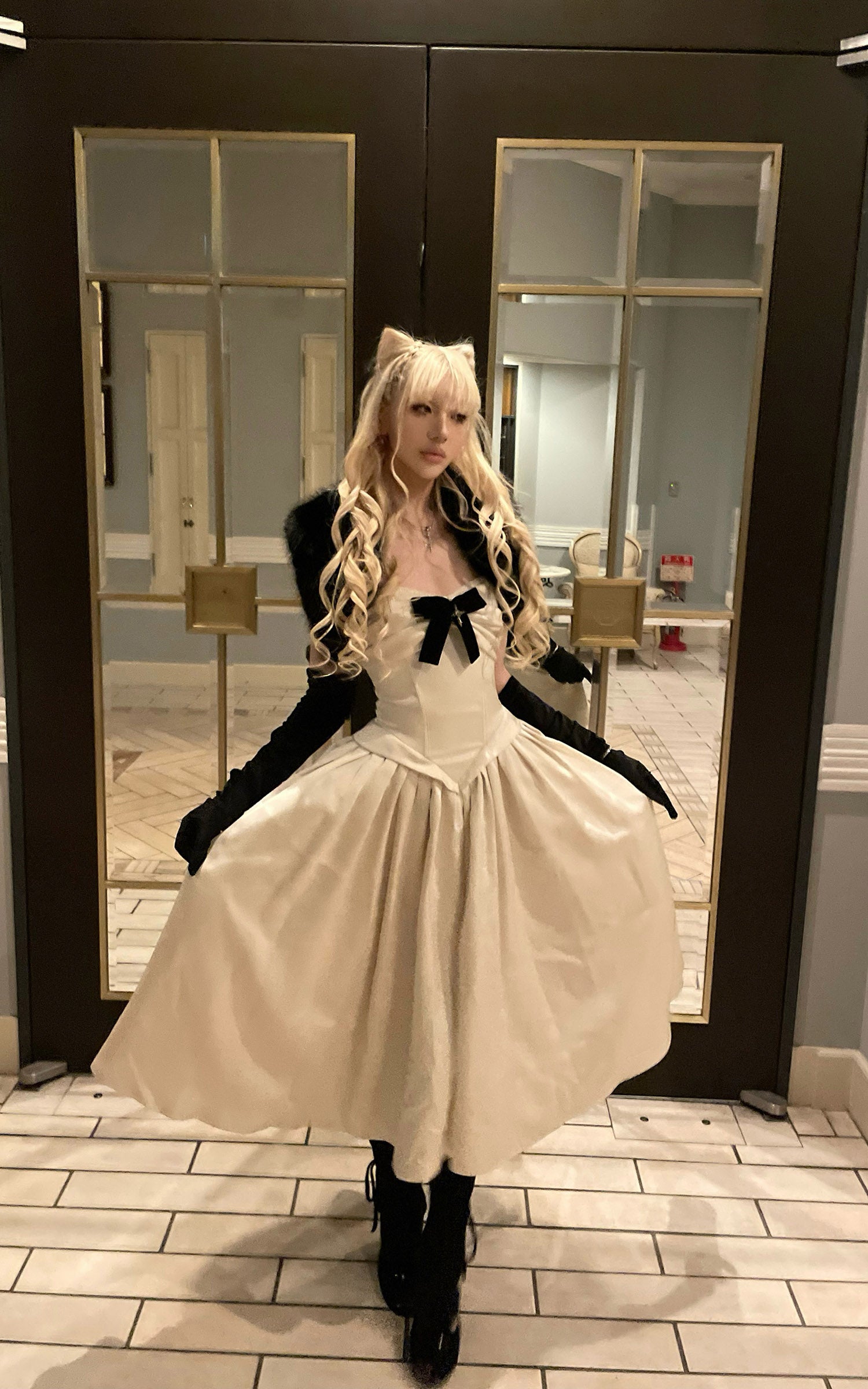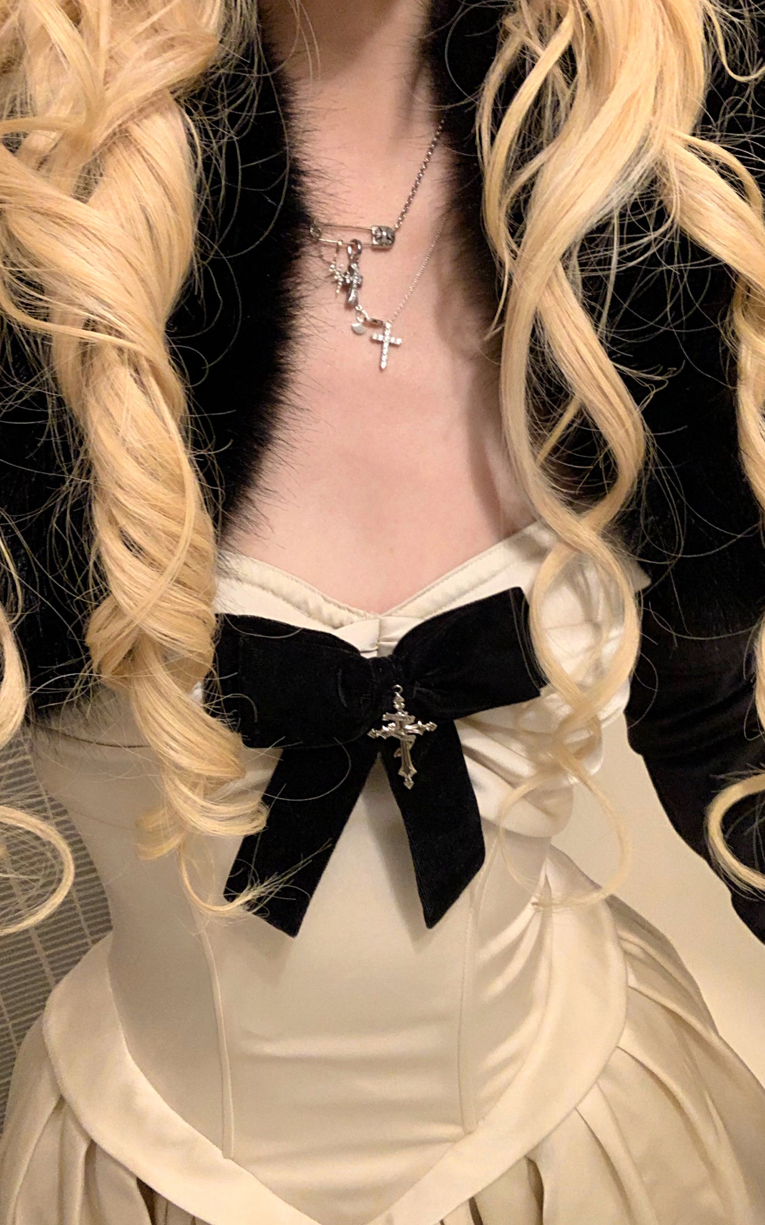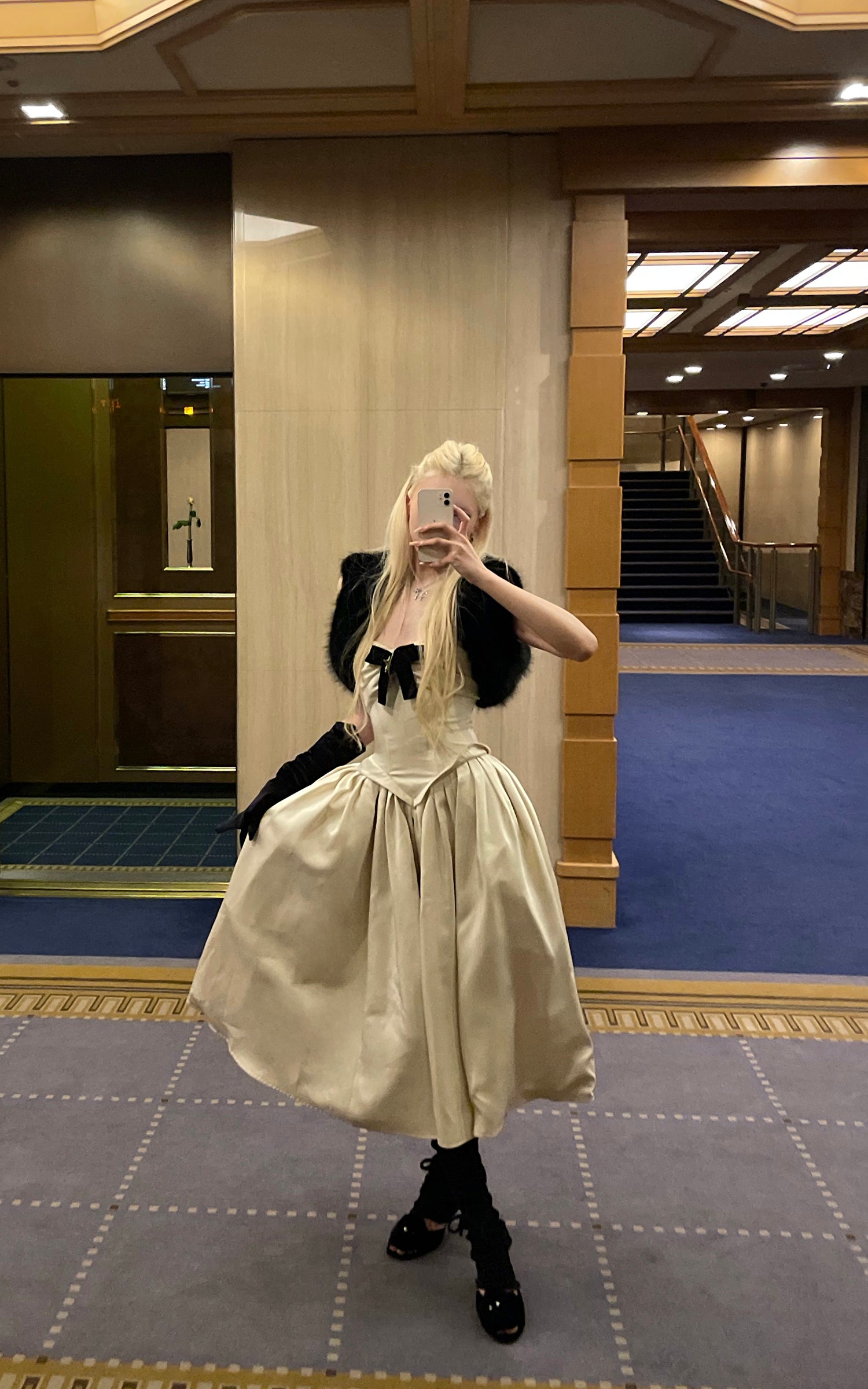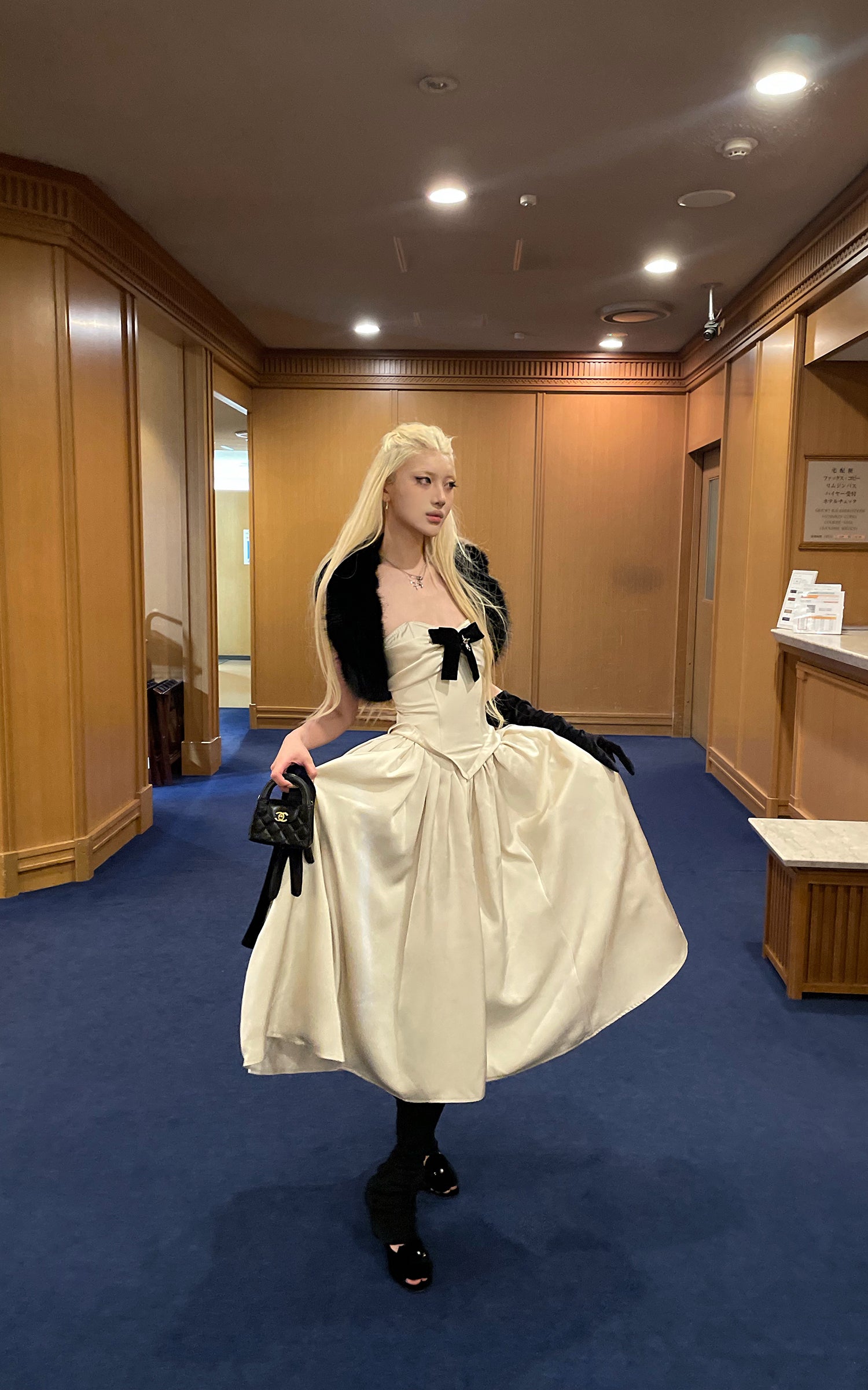 Rase Le Sol Strapless Dress Set With Gloves And Faux Fur Bolero