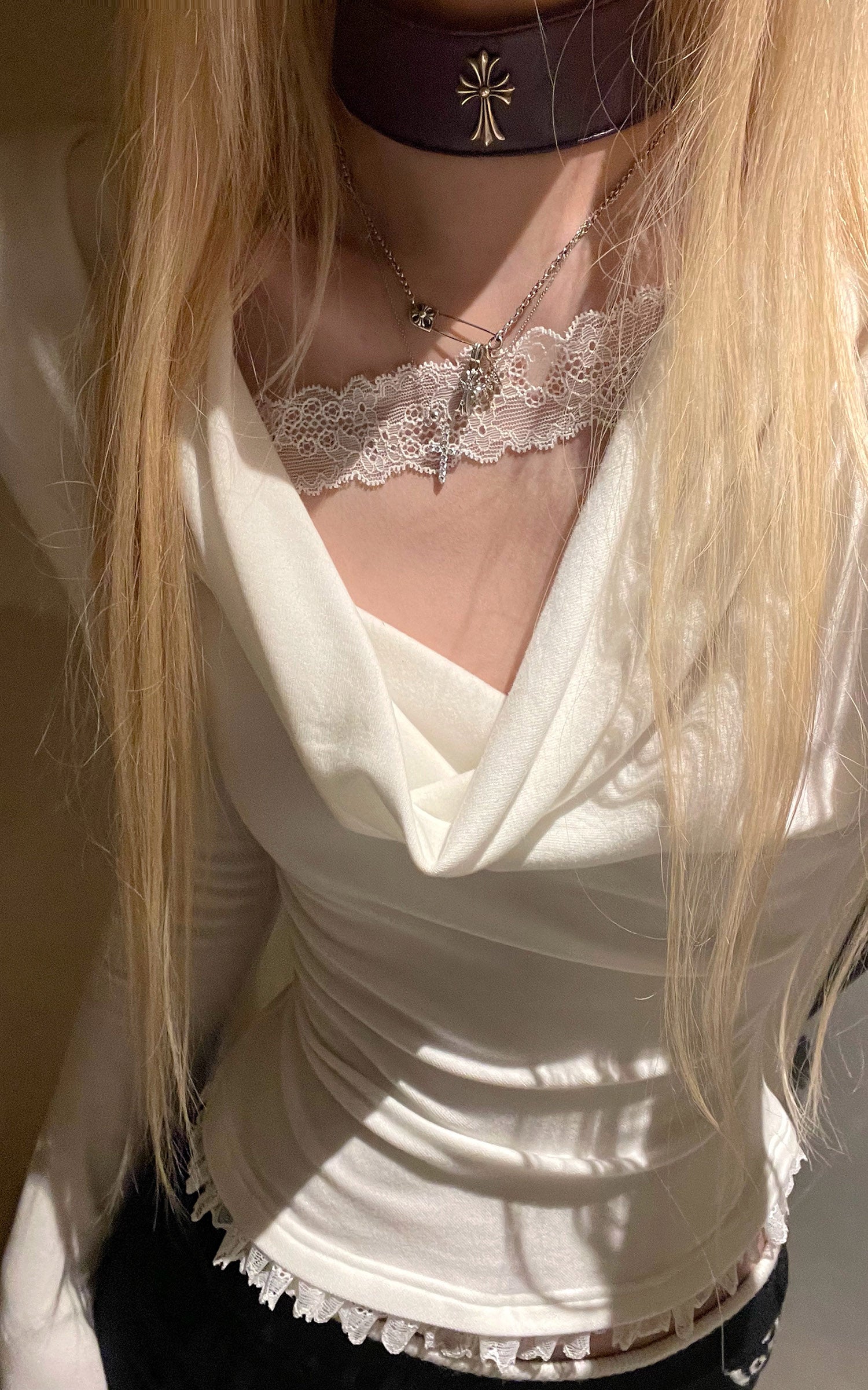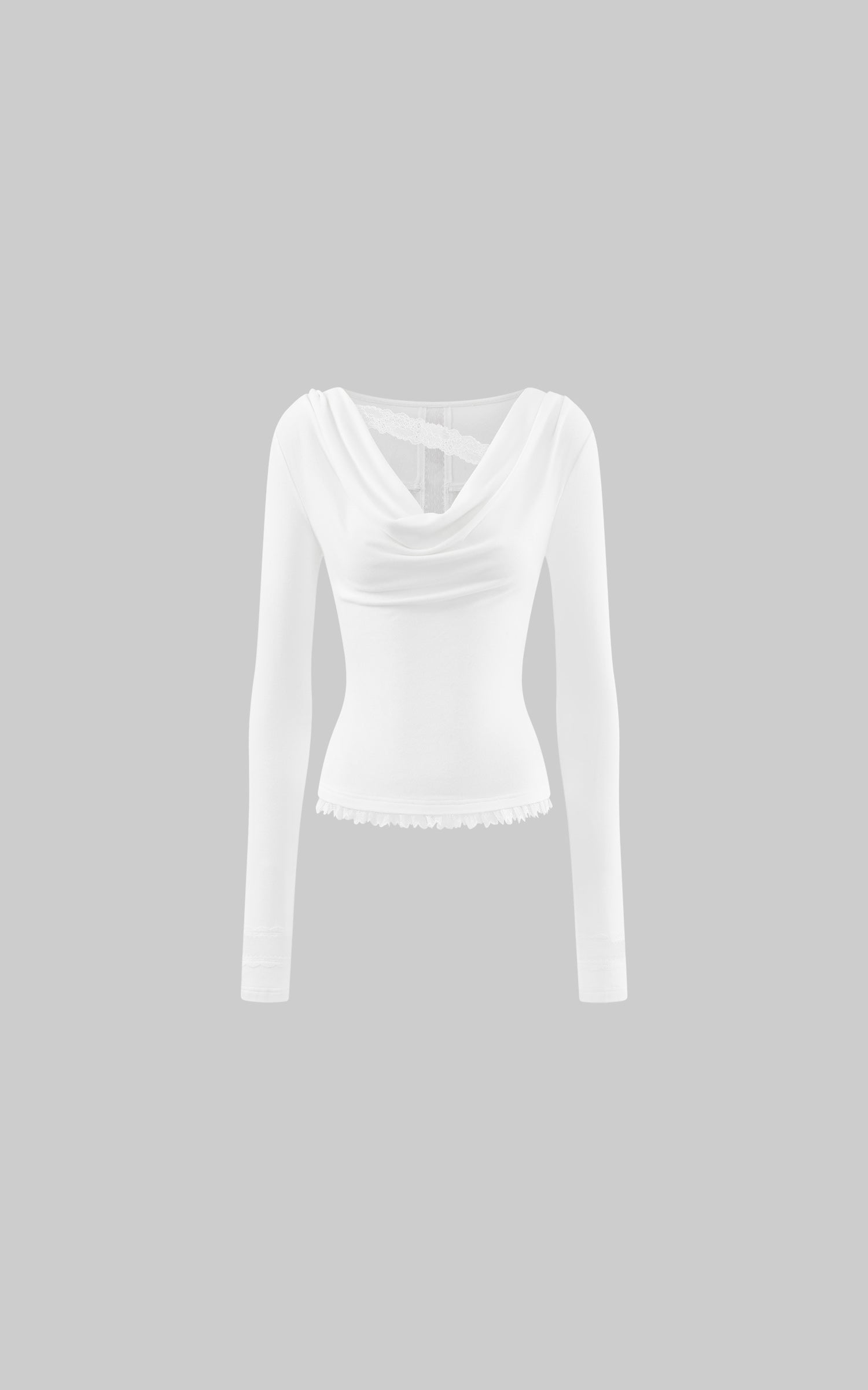 Rase Le Sol Draped Neck Long Sleeve Top With Lace Insets And Mesh Panel
