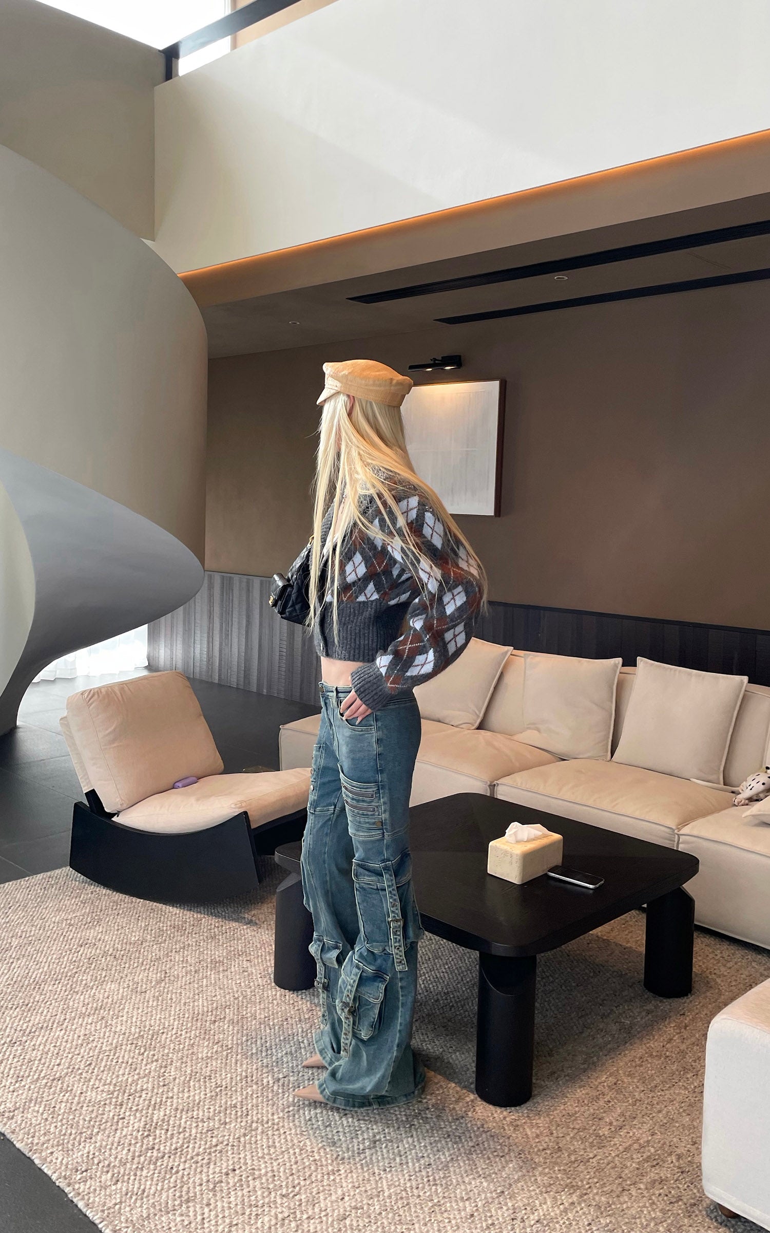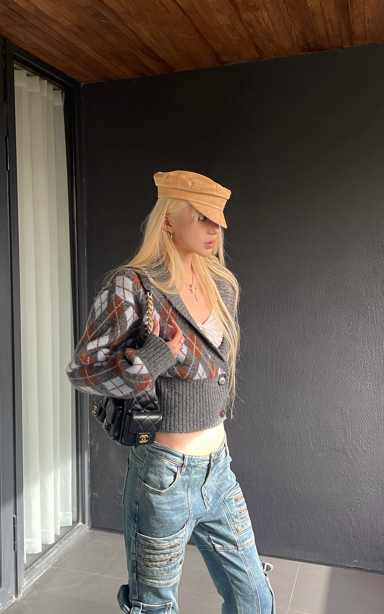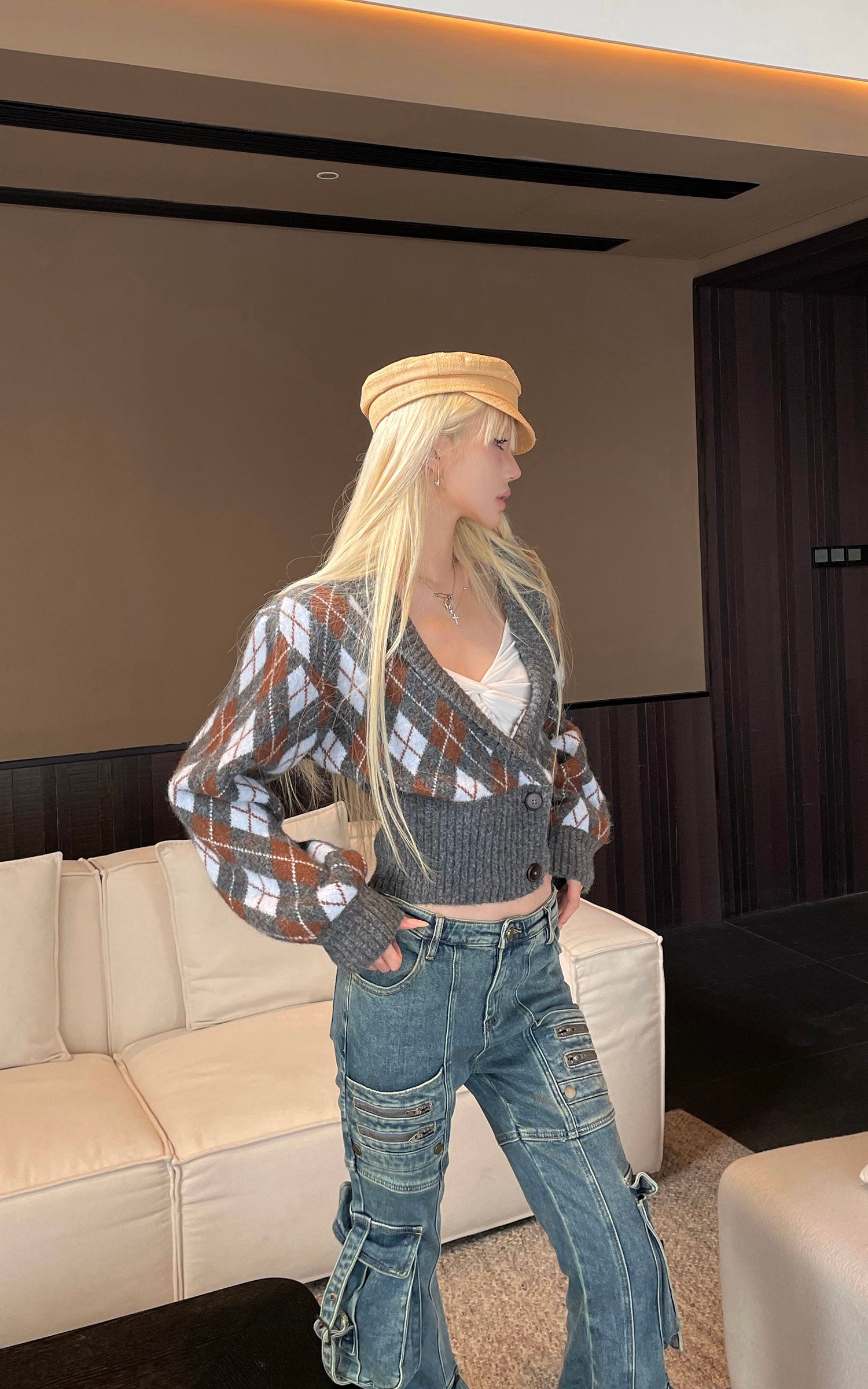Rase le sol Argyle Knit Cropped Cardigan with Double Button Waist Design