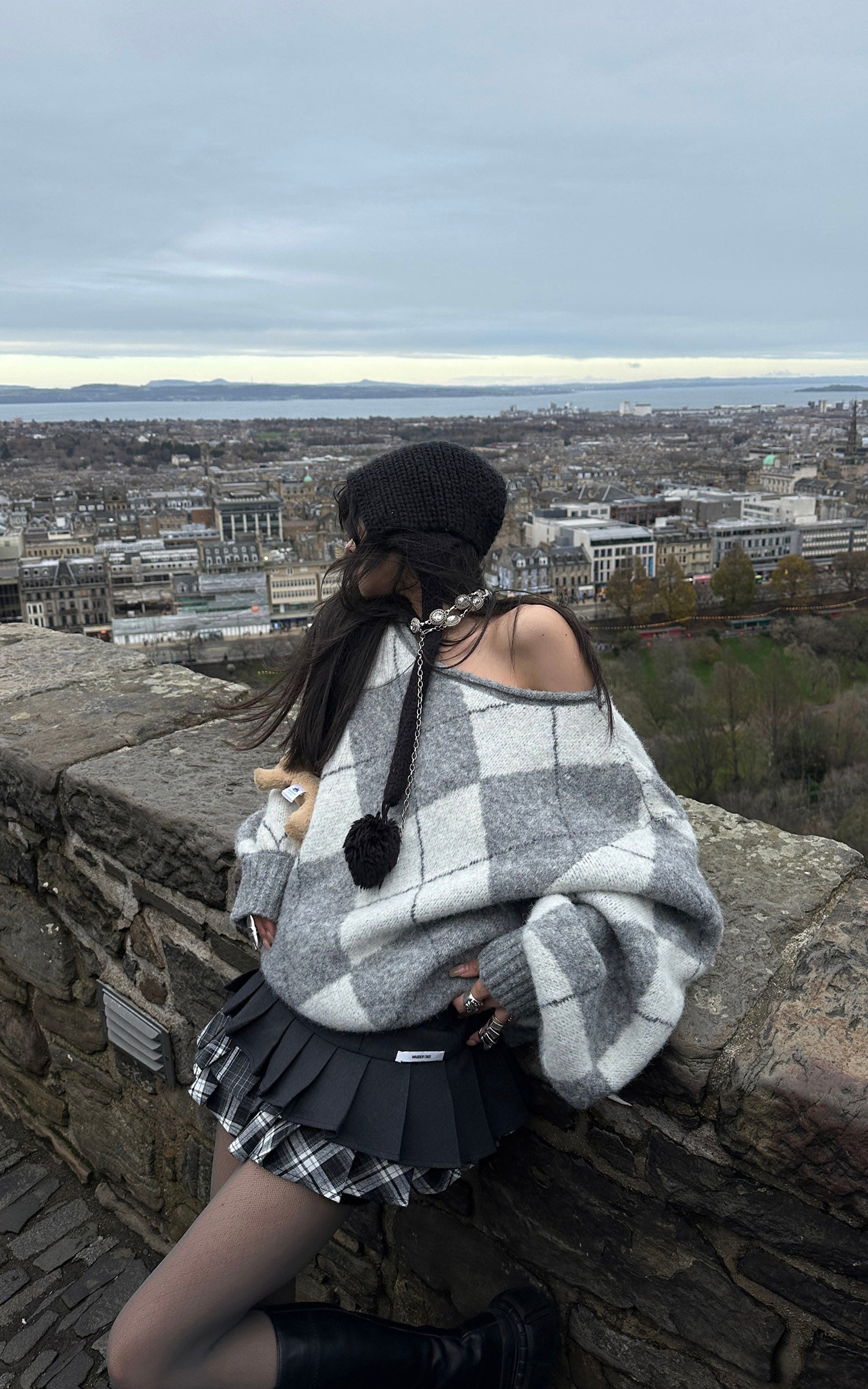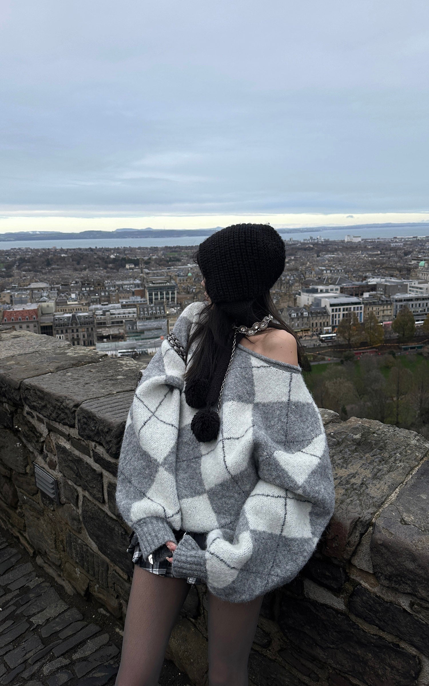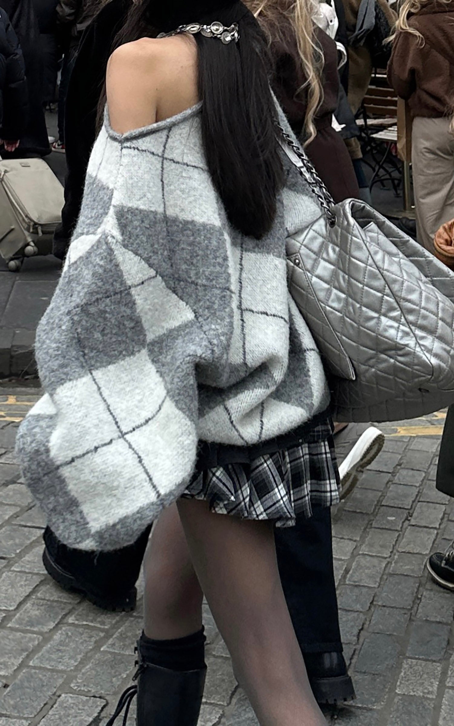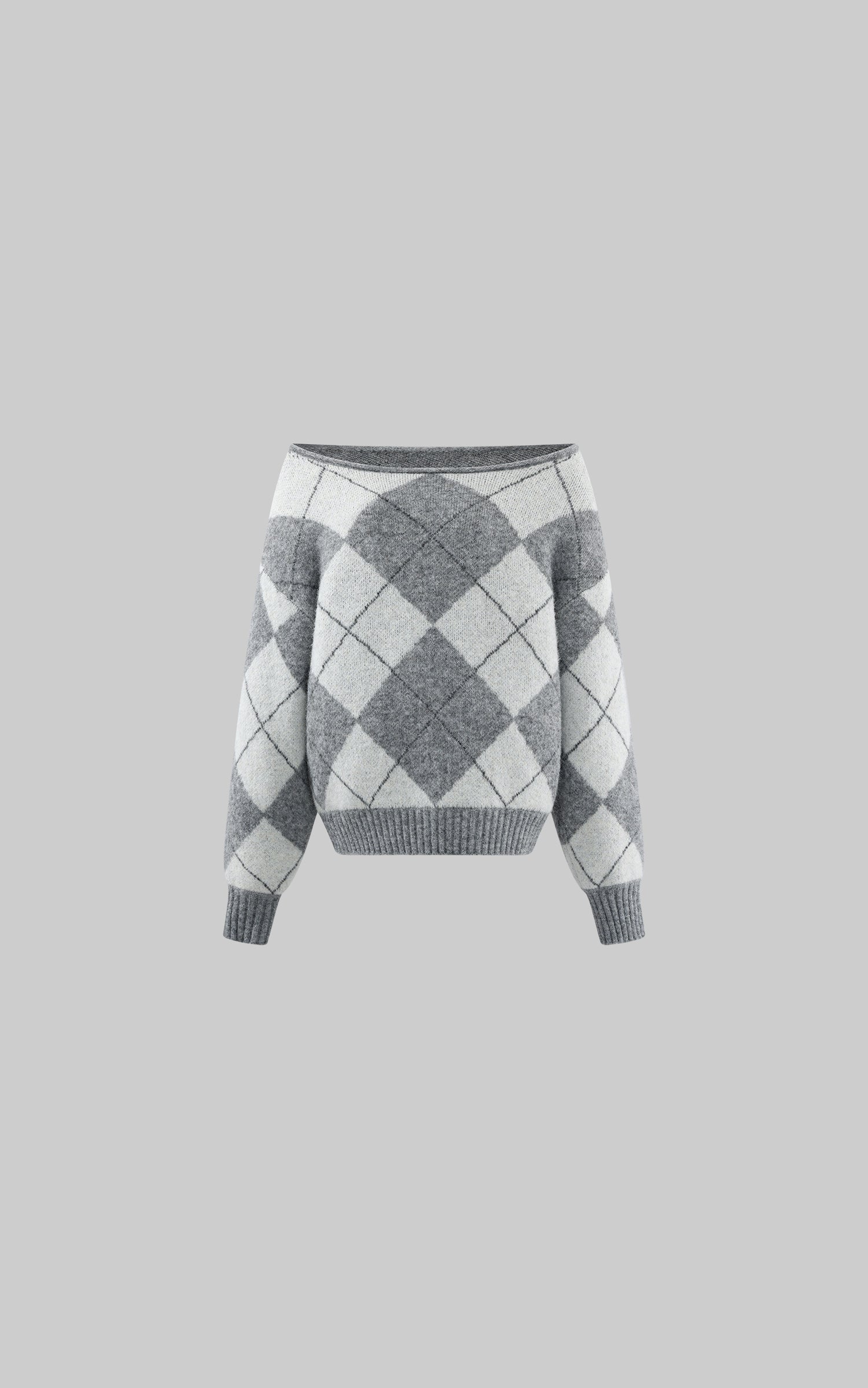 WARDEN EDGE Argyle Off Shoulder Oversized Knit Sweater