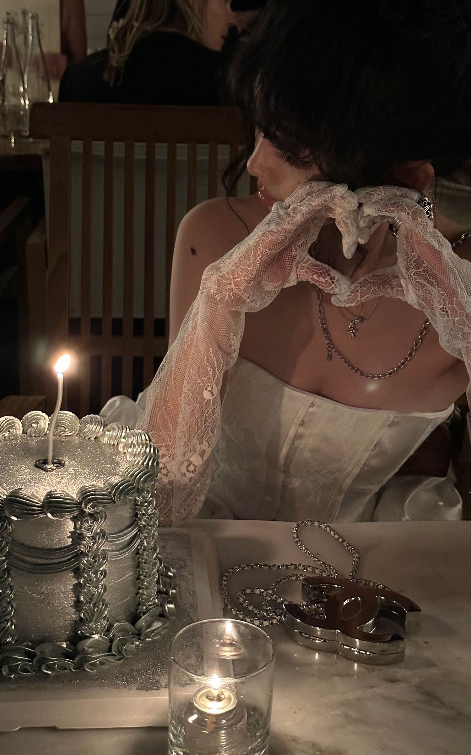 Rase Le Sol Knit Cardigan And Cami Top Two-Piece Set With Asymmetric Lace Midi Skirt