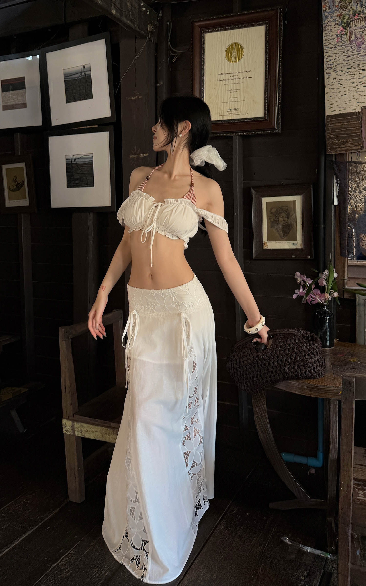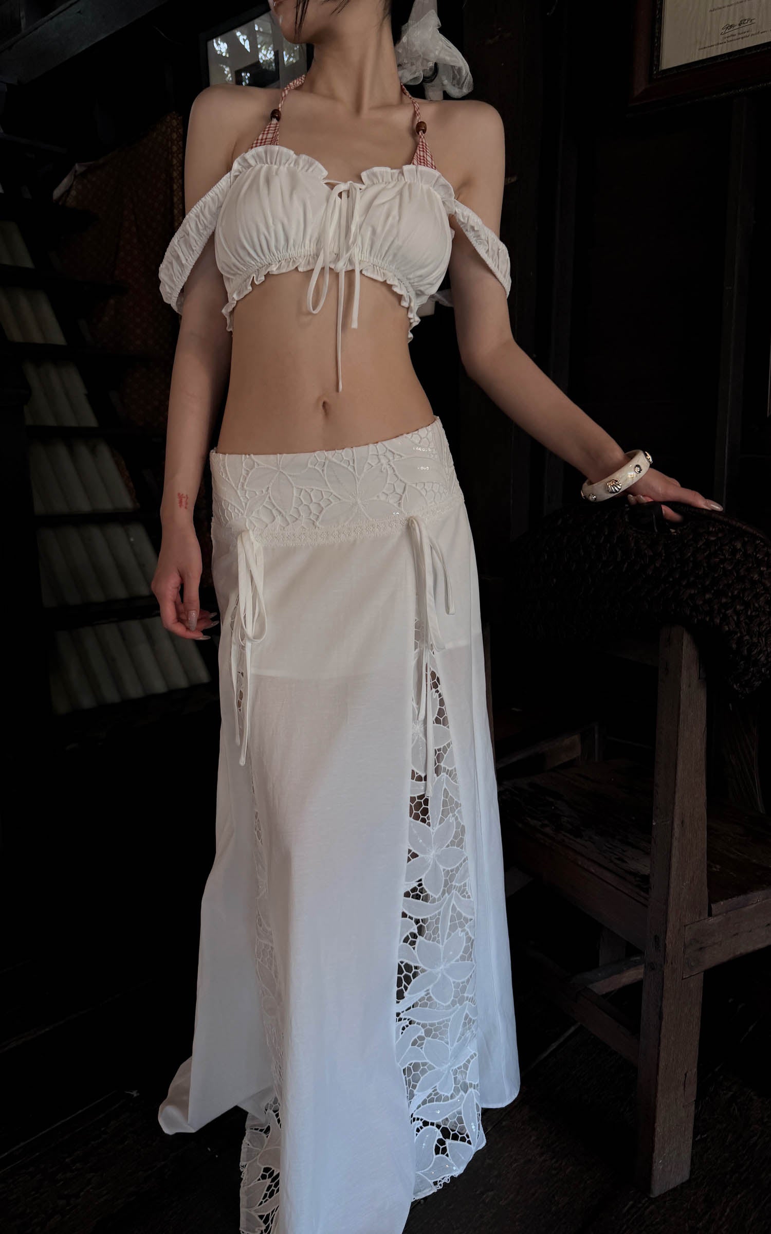 Hydrae Lace Panel Tie-Waist Maxi Skirt