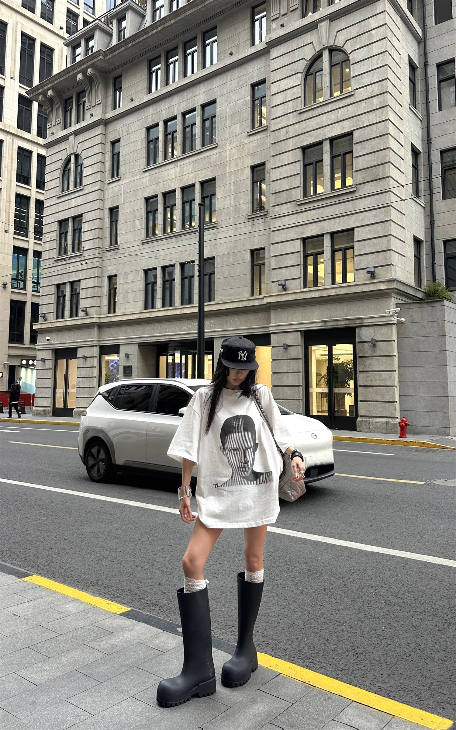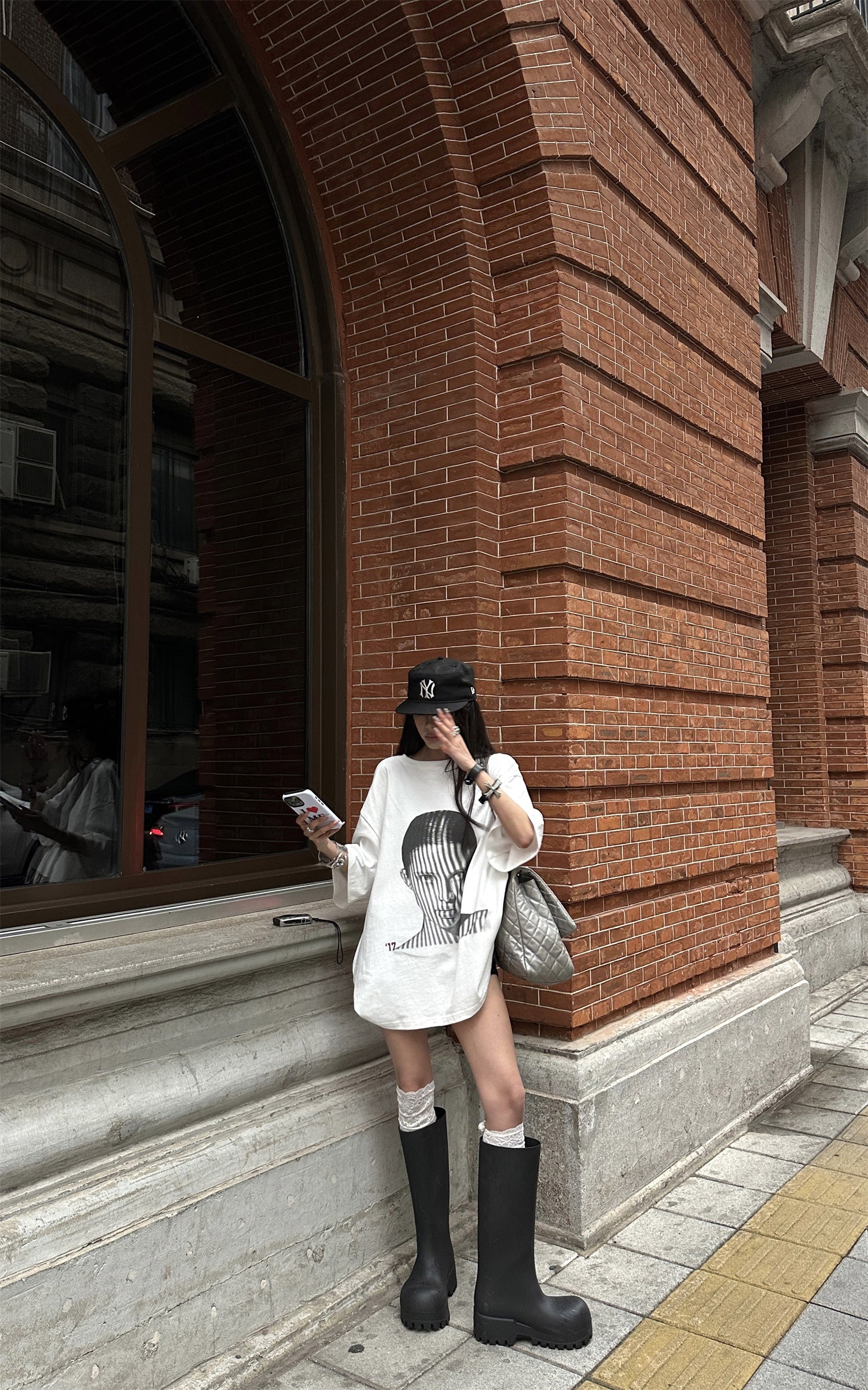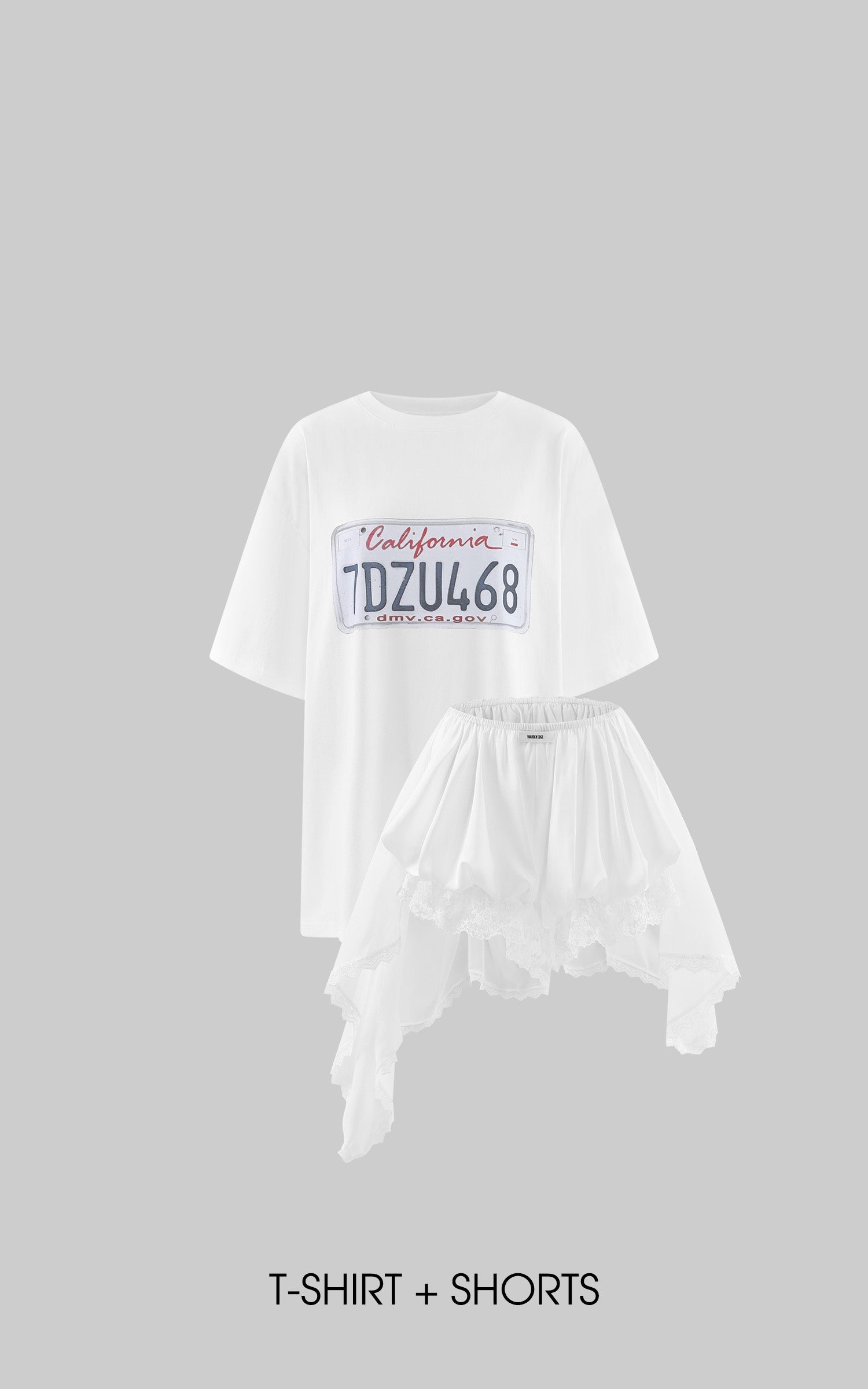 WARDEN EDGE Oversized License Plate Graphic T-Shirt & Layered Lace Shorts Stockings Set