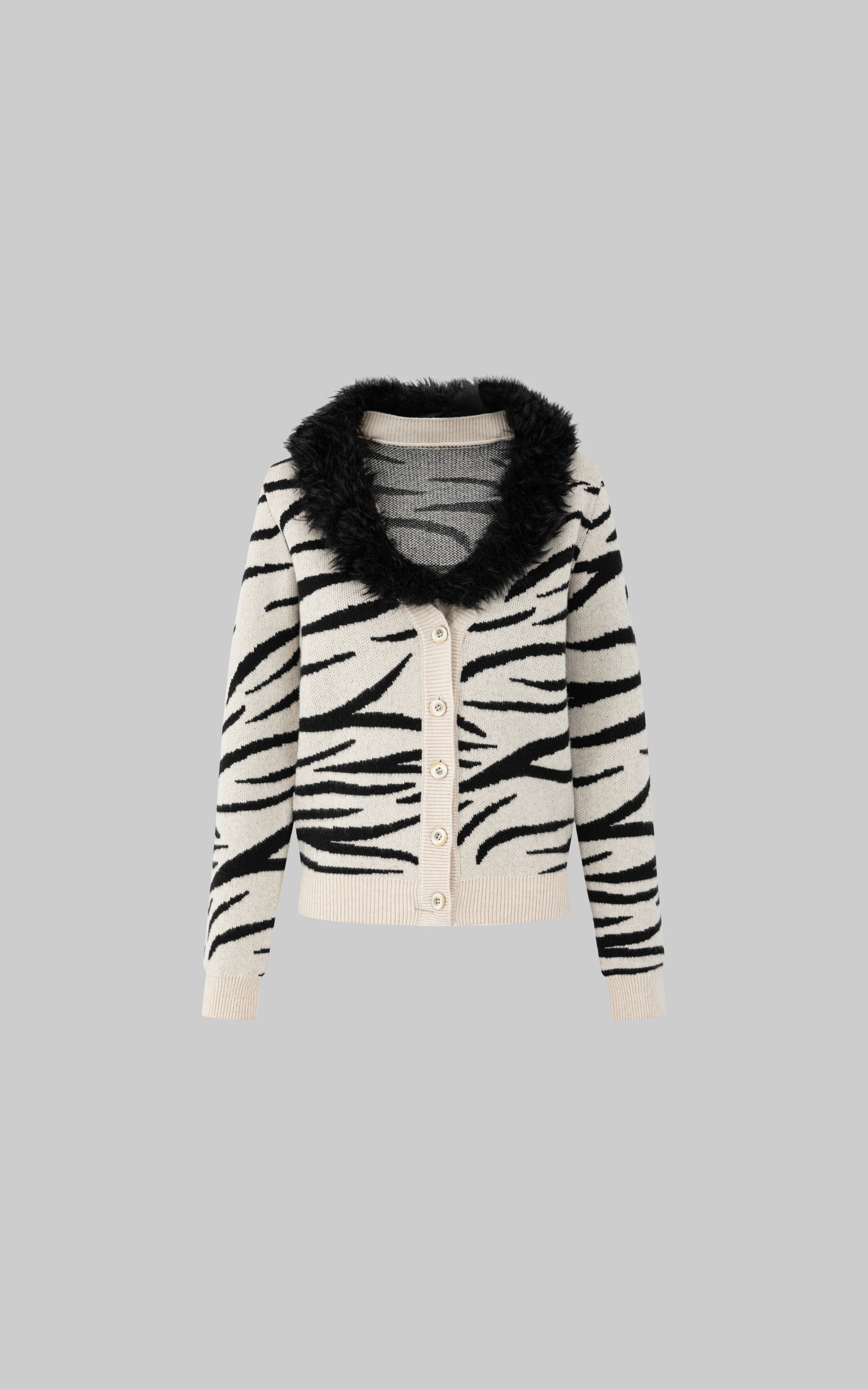 IAMXIAA Zebra Pattern Faux Fur Collar Knit Cardigan