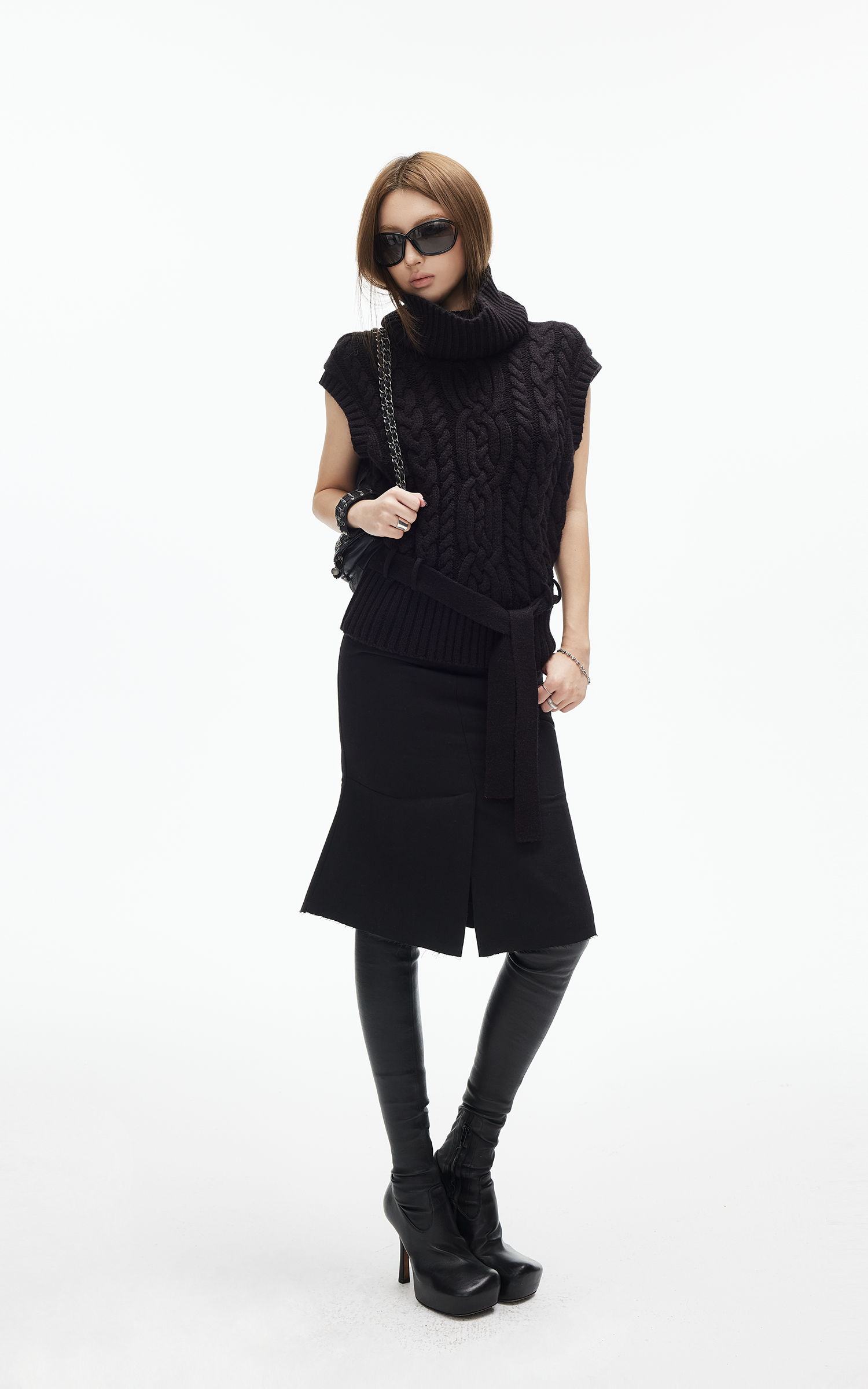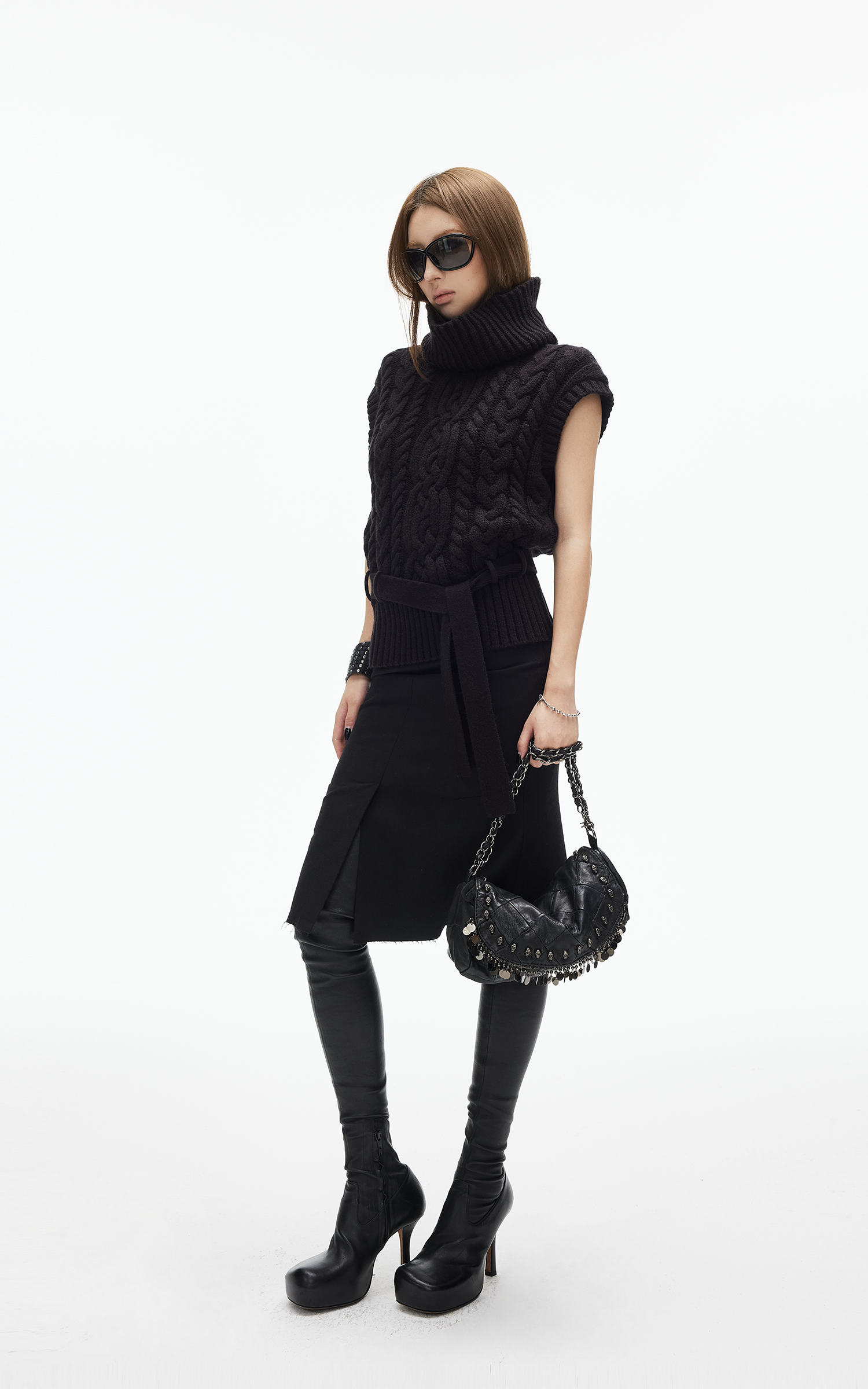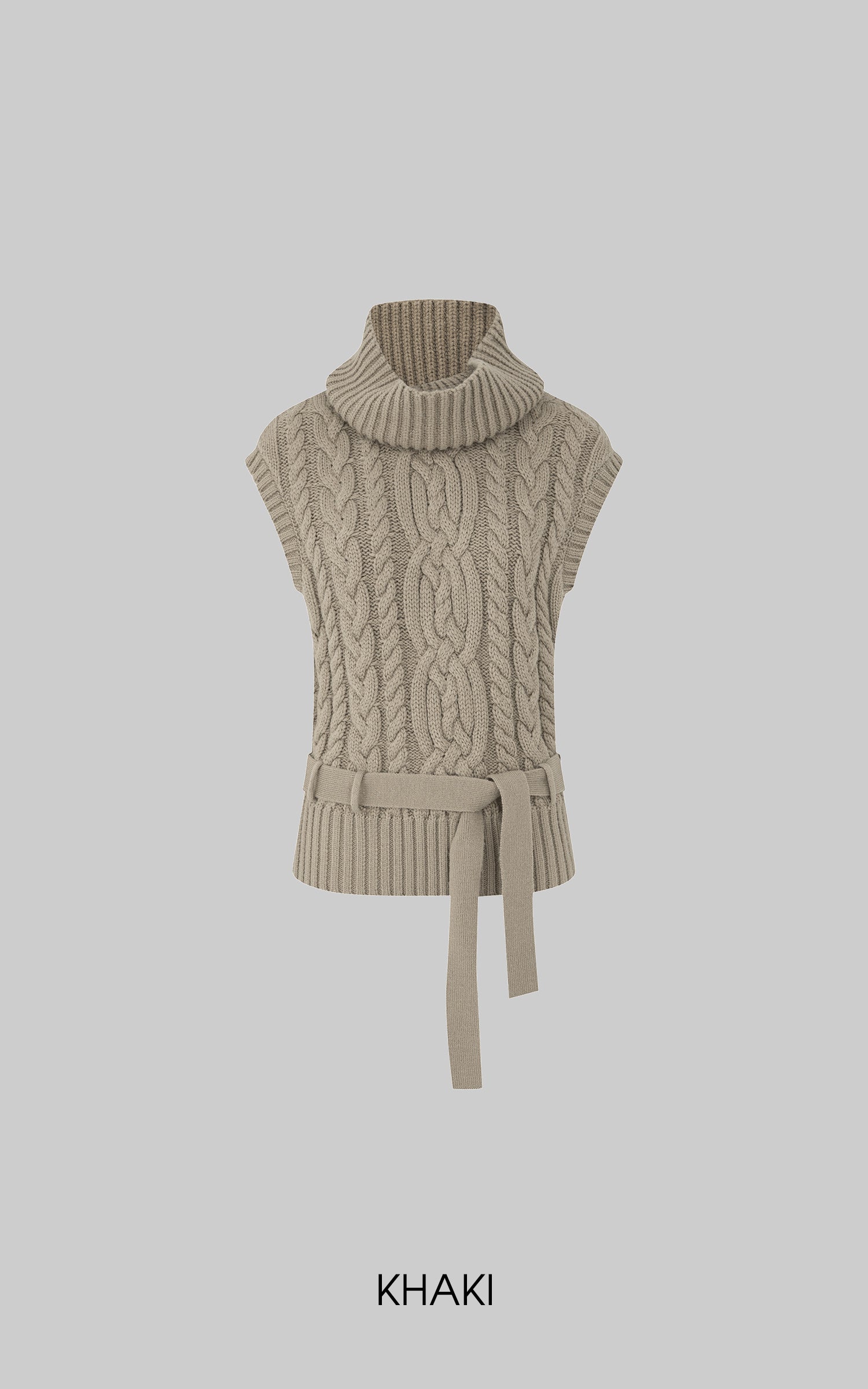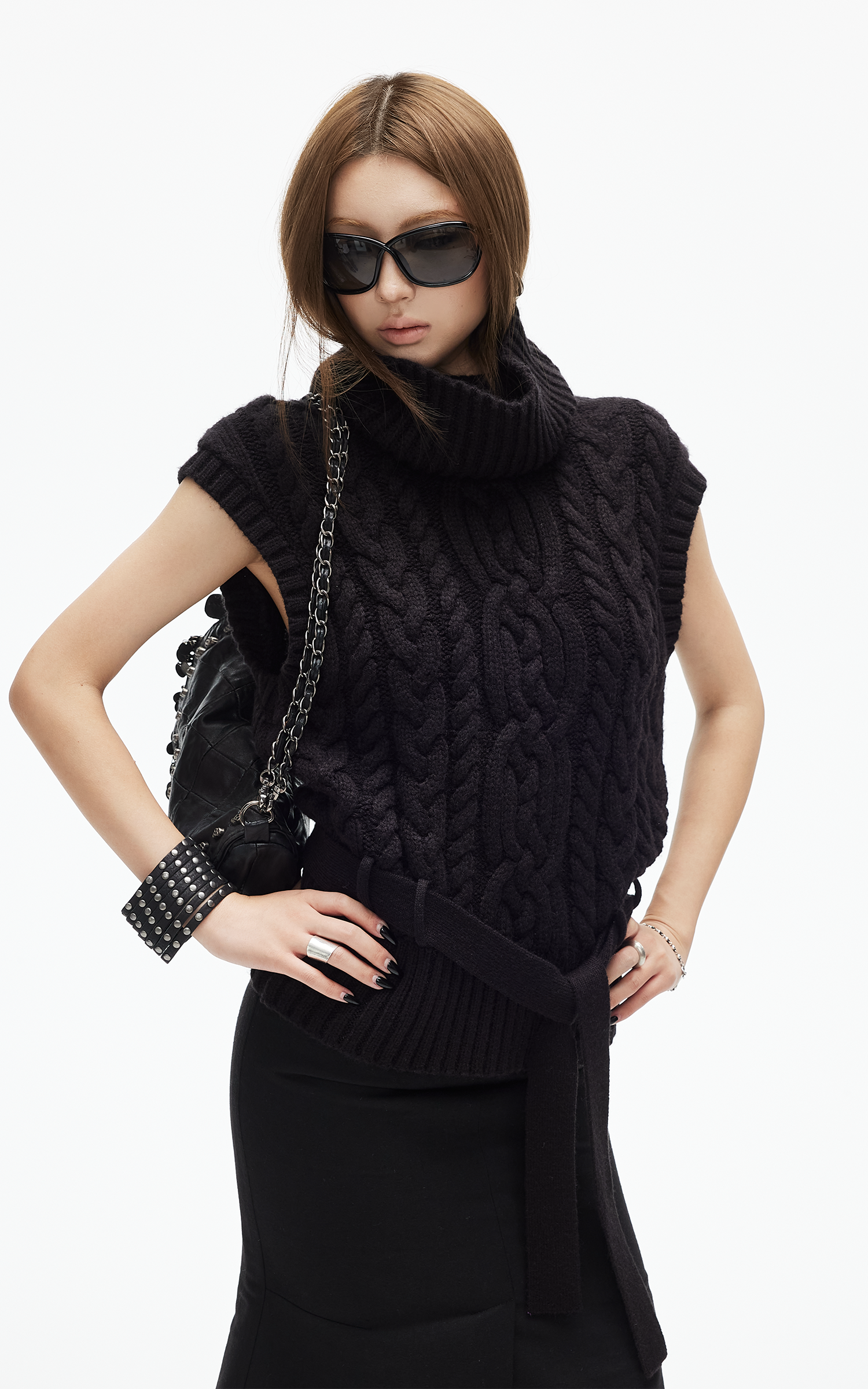 IAMXIAA Cable Knit Turtleneck Vest with Waist Tie