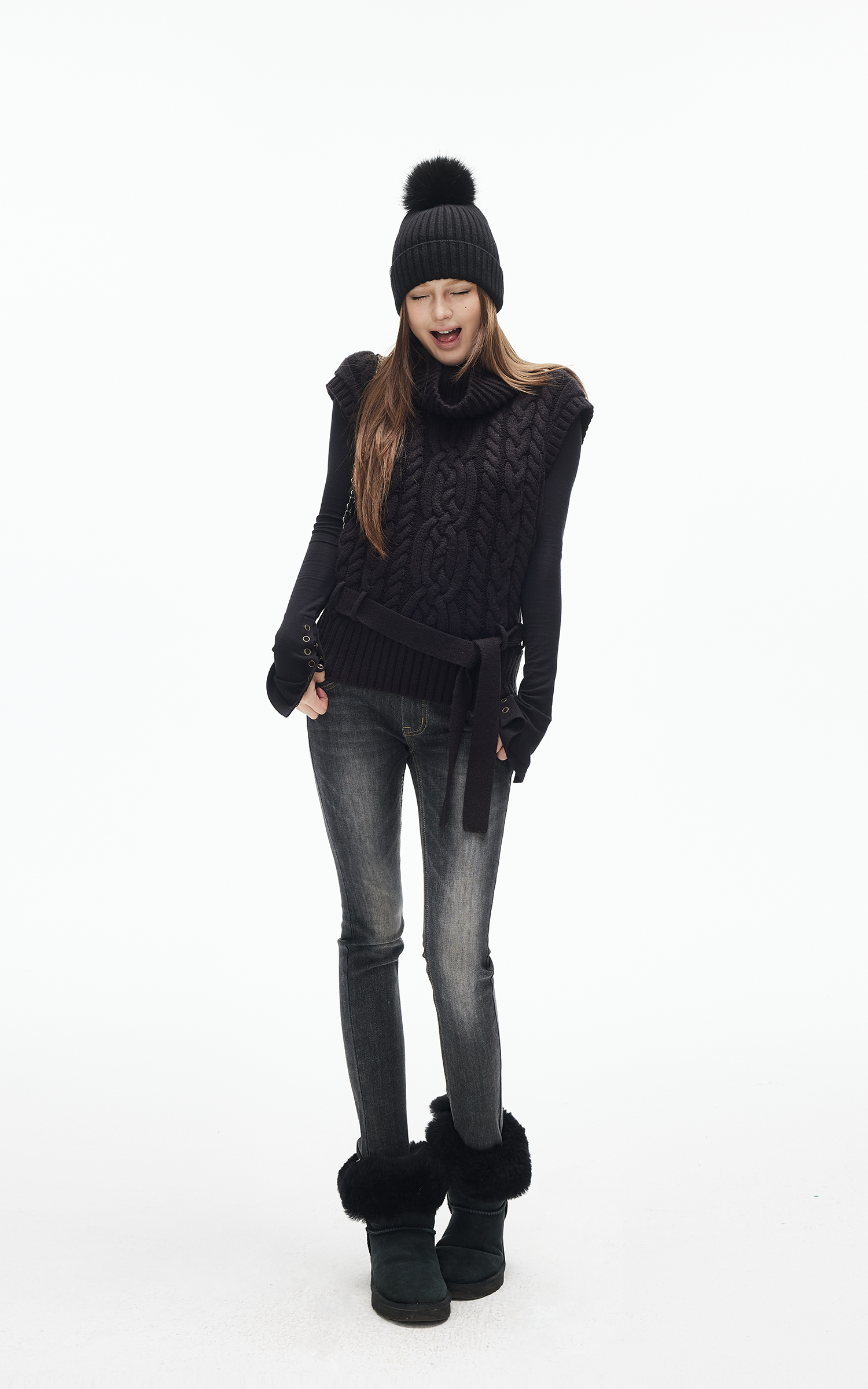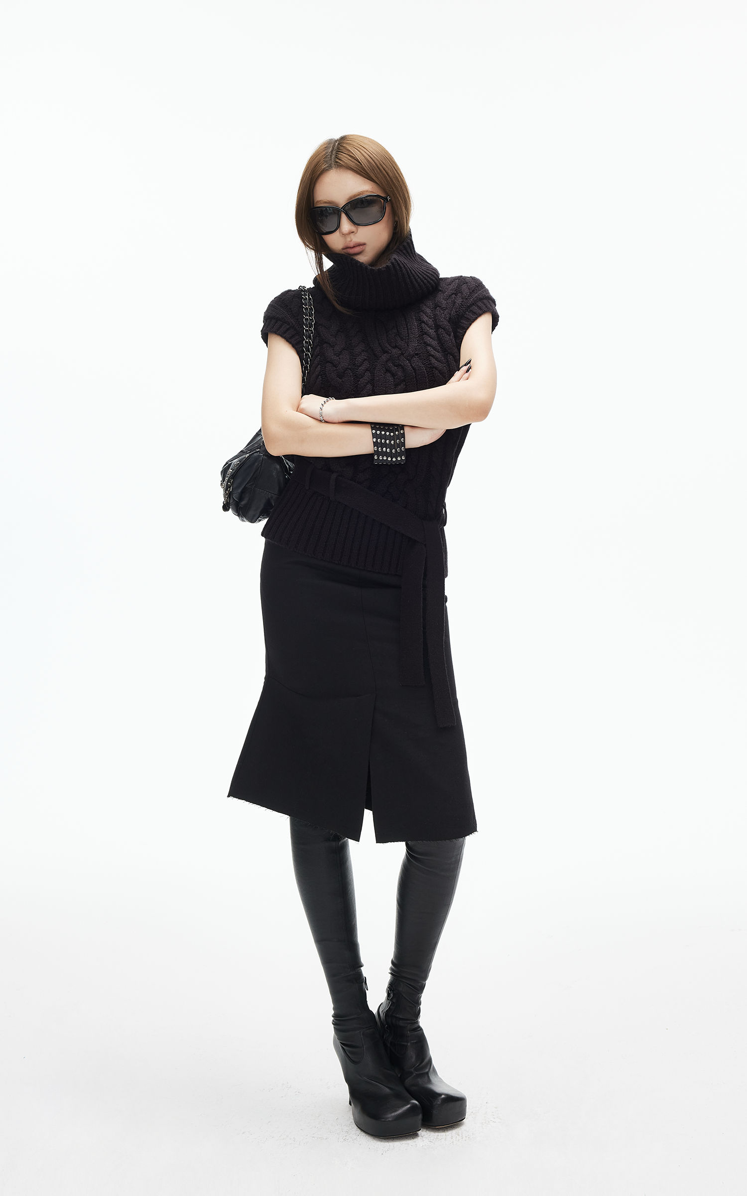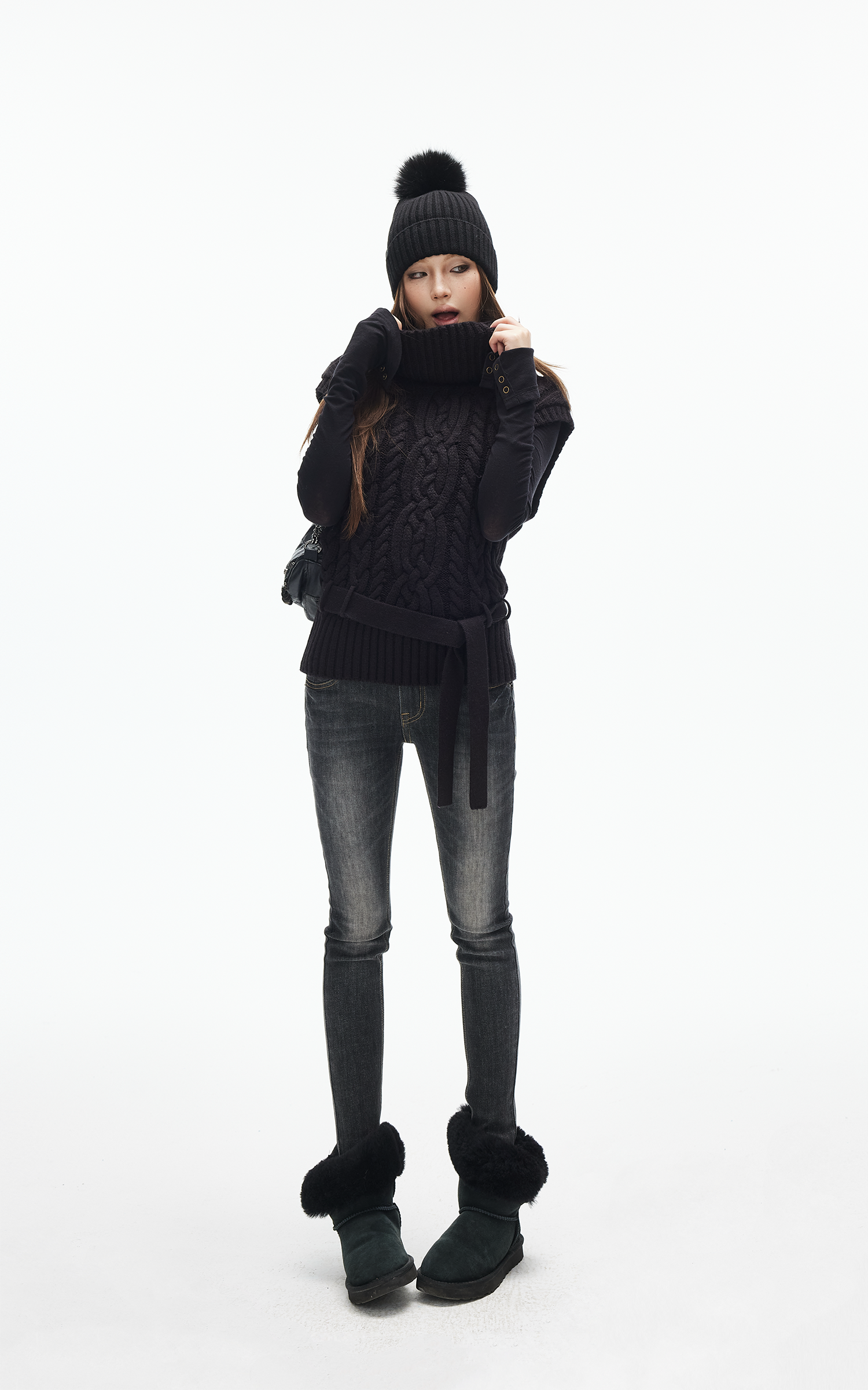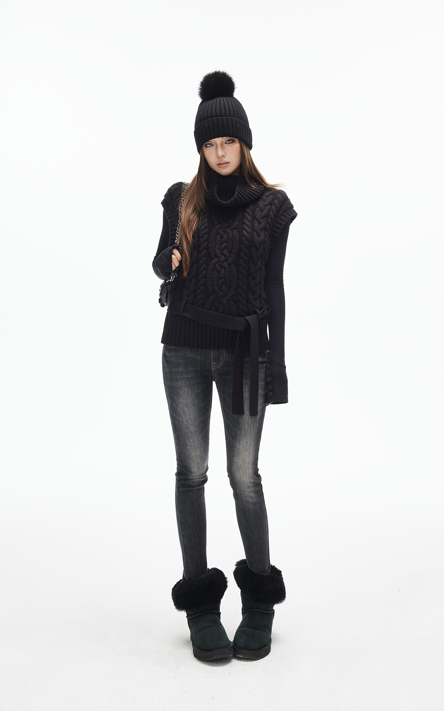 IAMXIAA Cable Knit Turtleneck Vest with Waist Tie