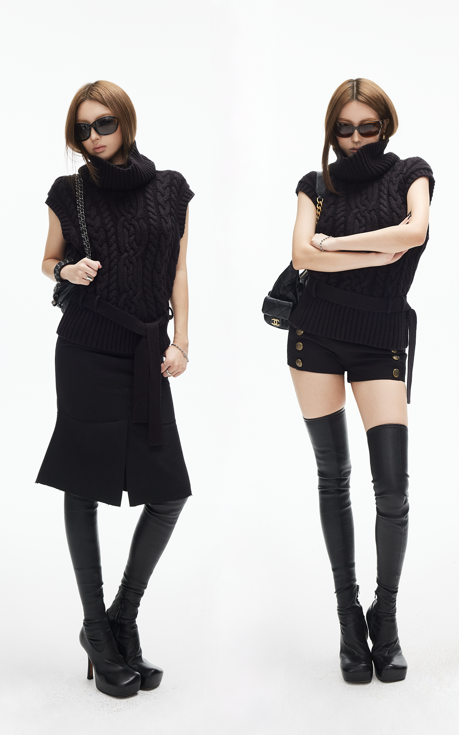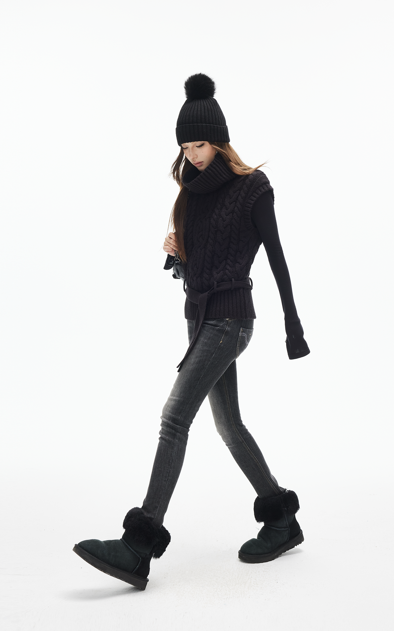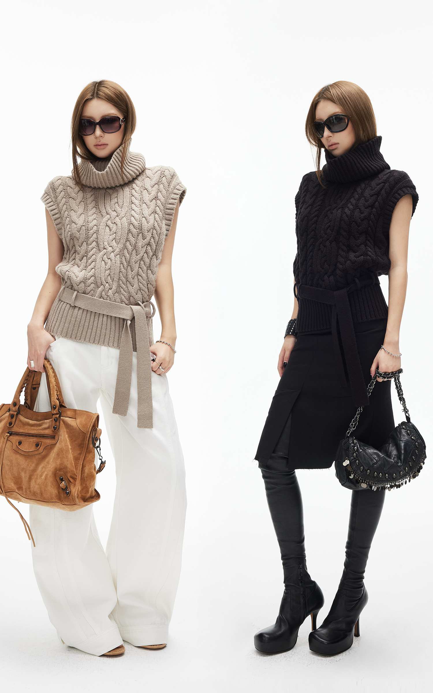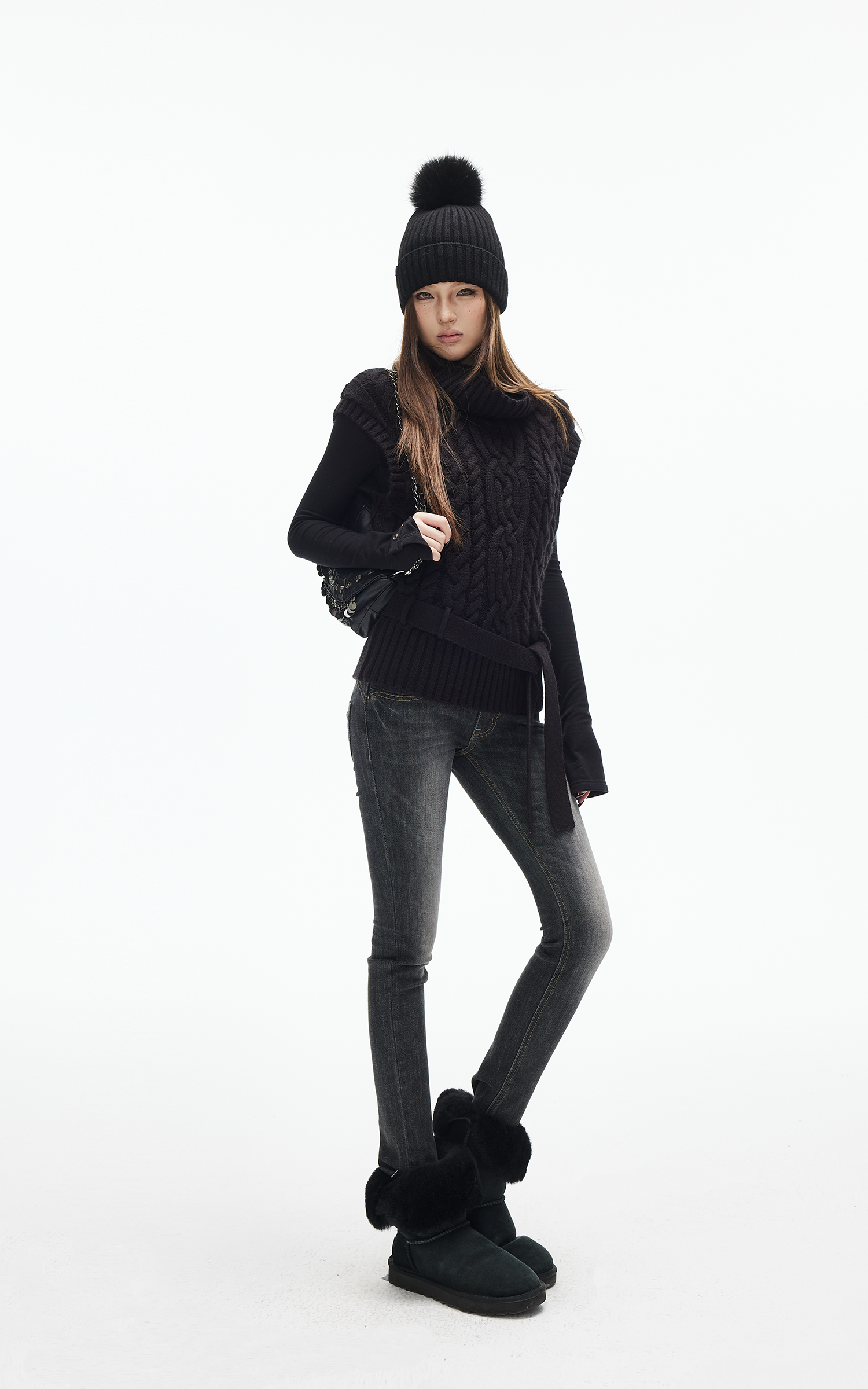 IAMXIAA Cable Knit Turtleneck Vest with Waist Tie