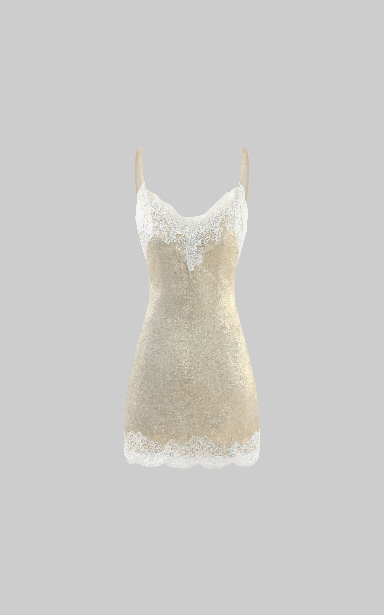 ROVENTE Shimmer Lace Trim Slip Mini Dress
