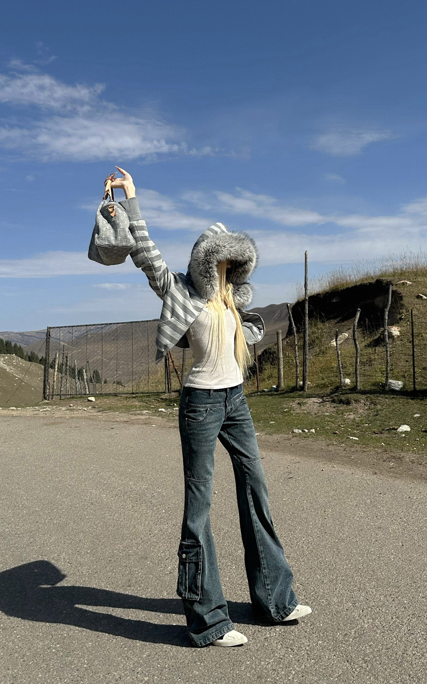 Rase le sol Striped Faux Raccoon Fur Hooded Cropped Sweatshirt