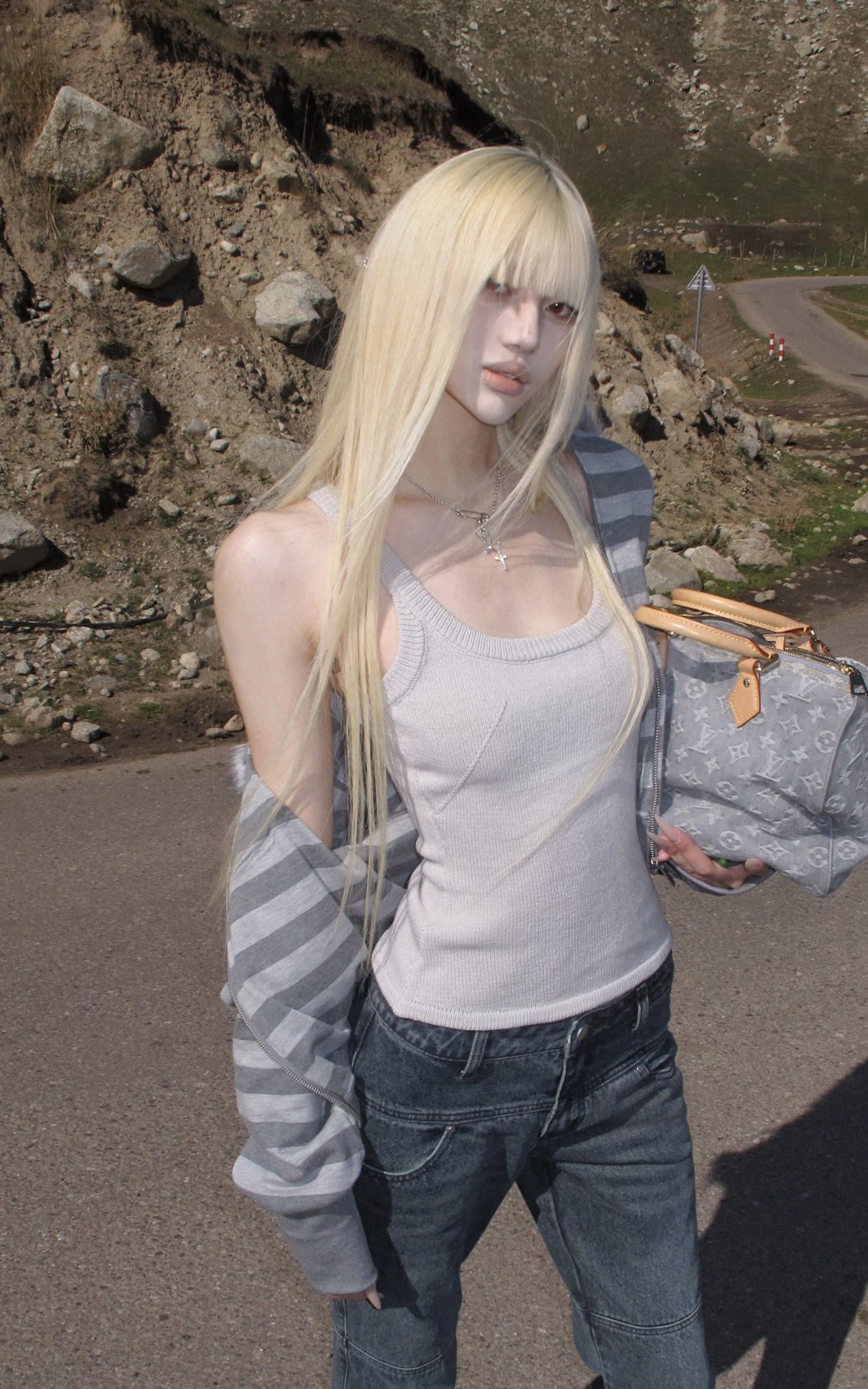 Rase le sol Grey Knit Sheer Long Sleeve Top with Minimalist Bra Layered Set