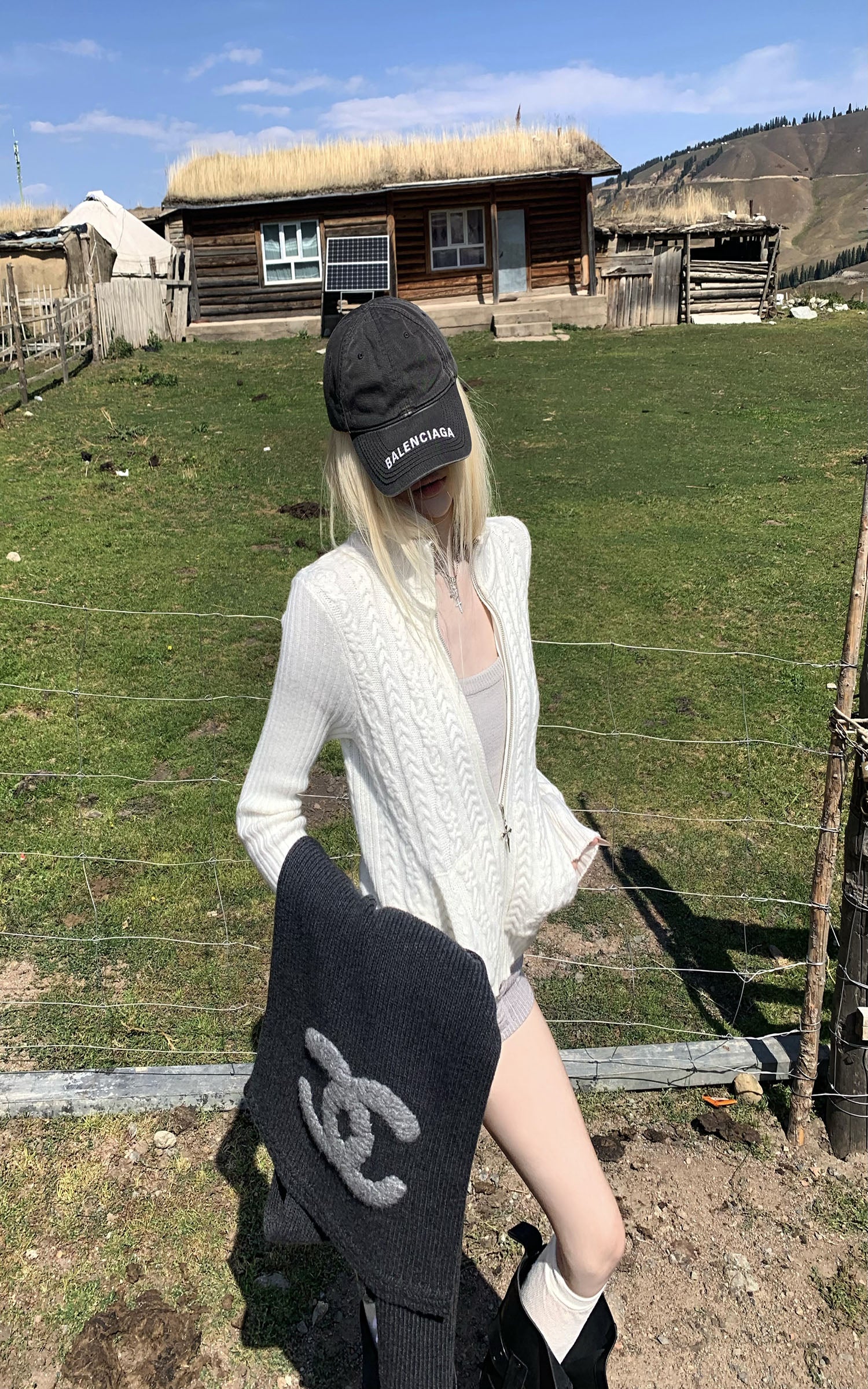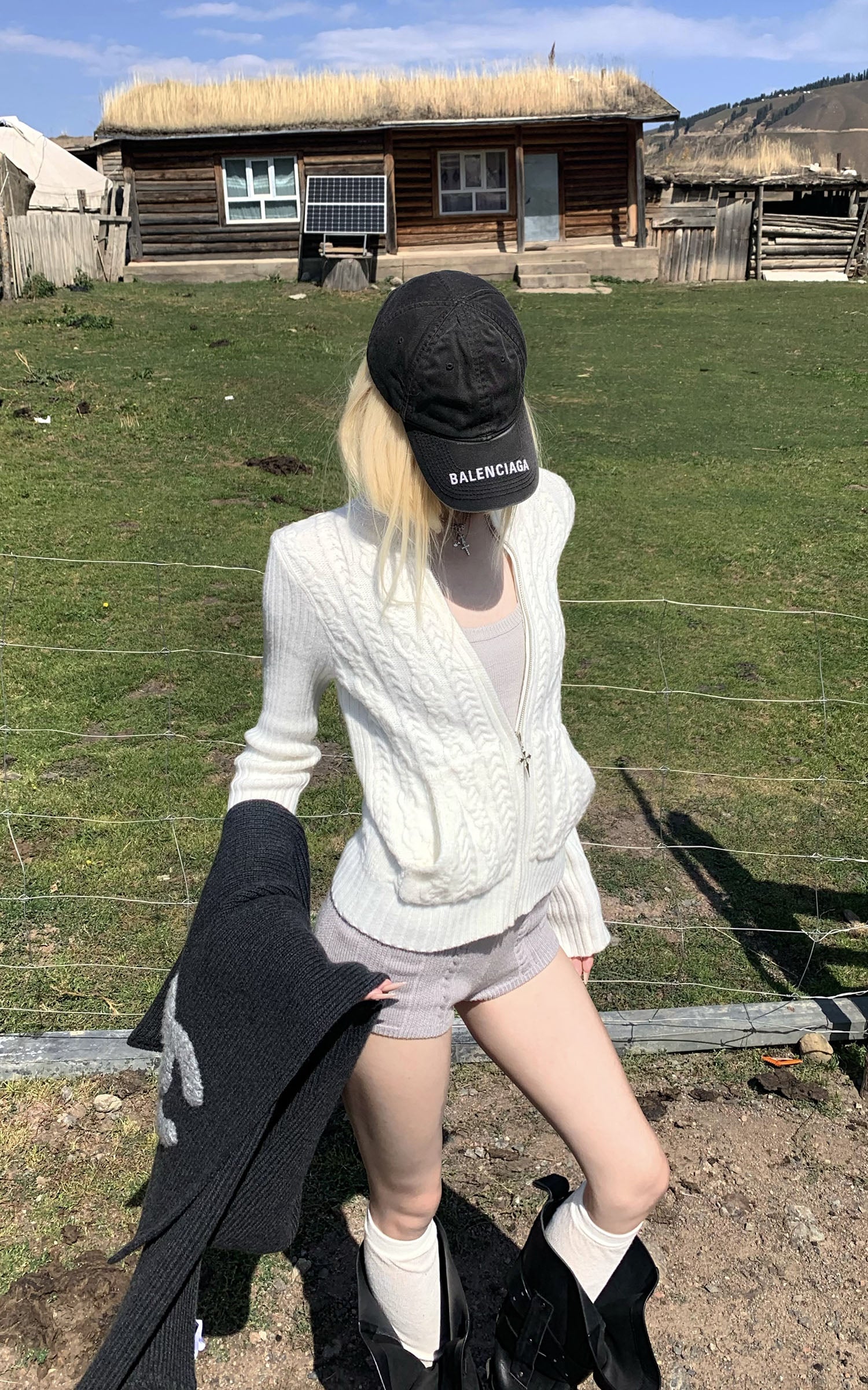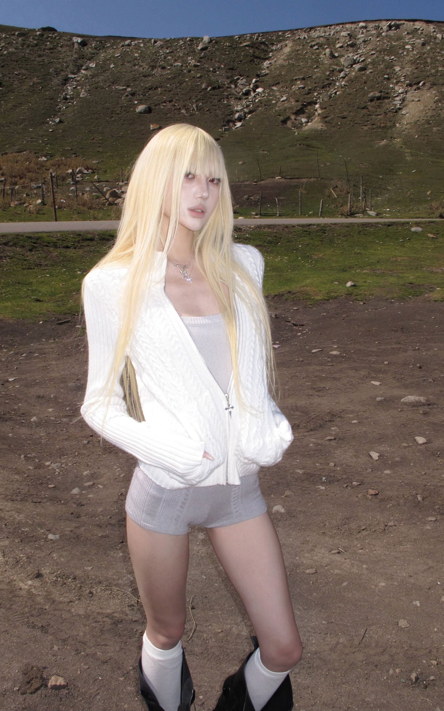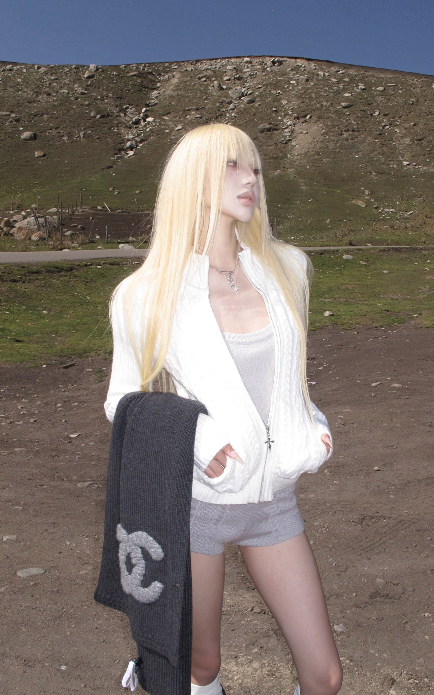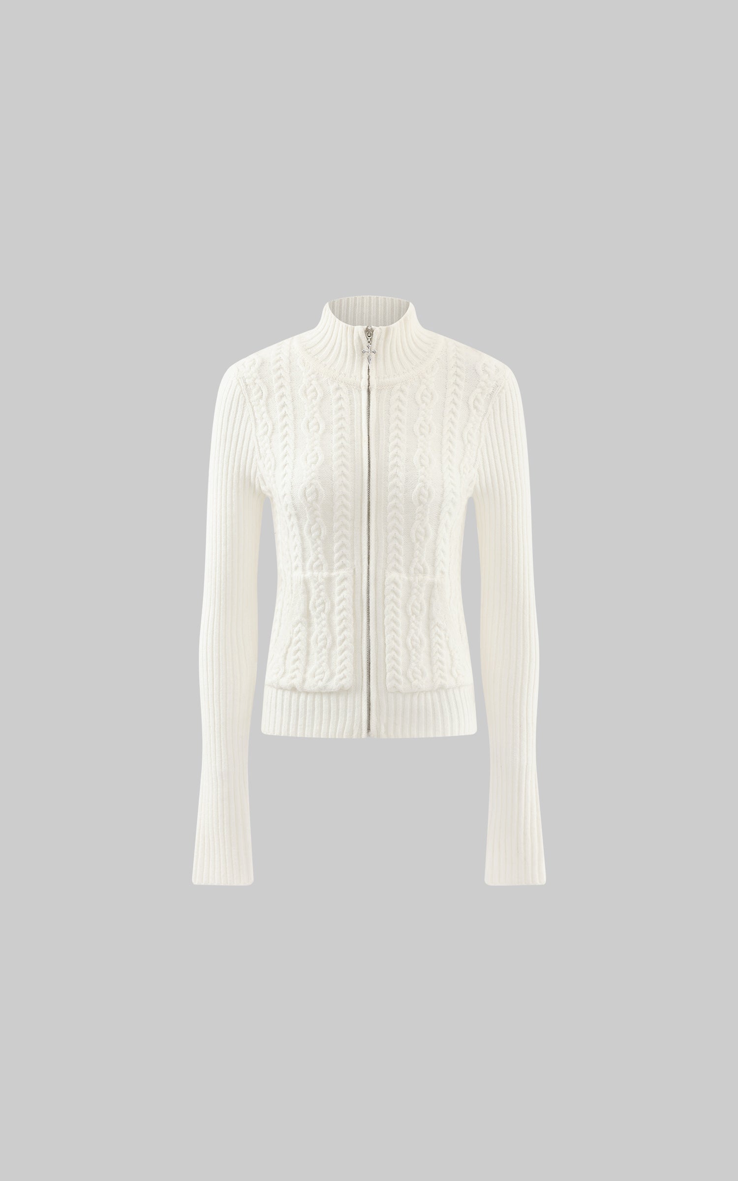 Rase le sol High Neck Cable Knit Cardigan with Sculpted Fit and Cross Zipper Detail