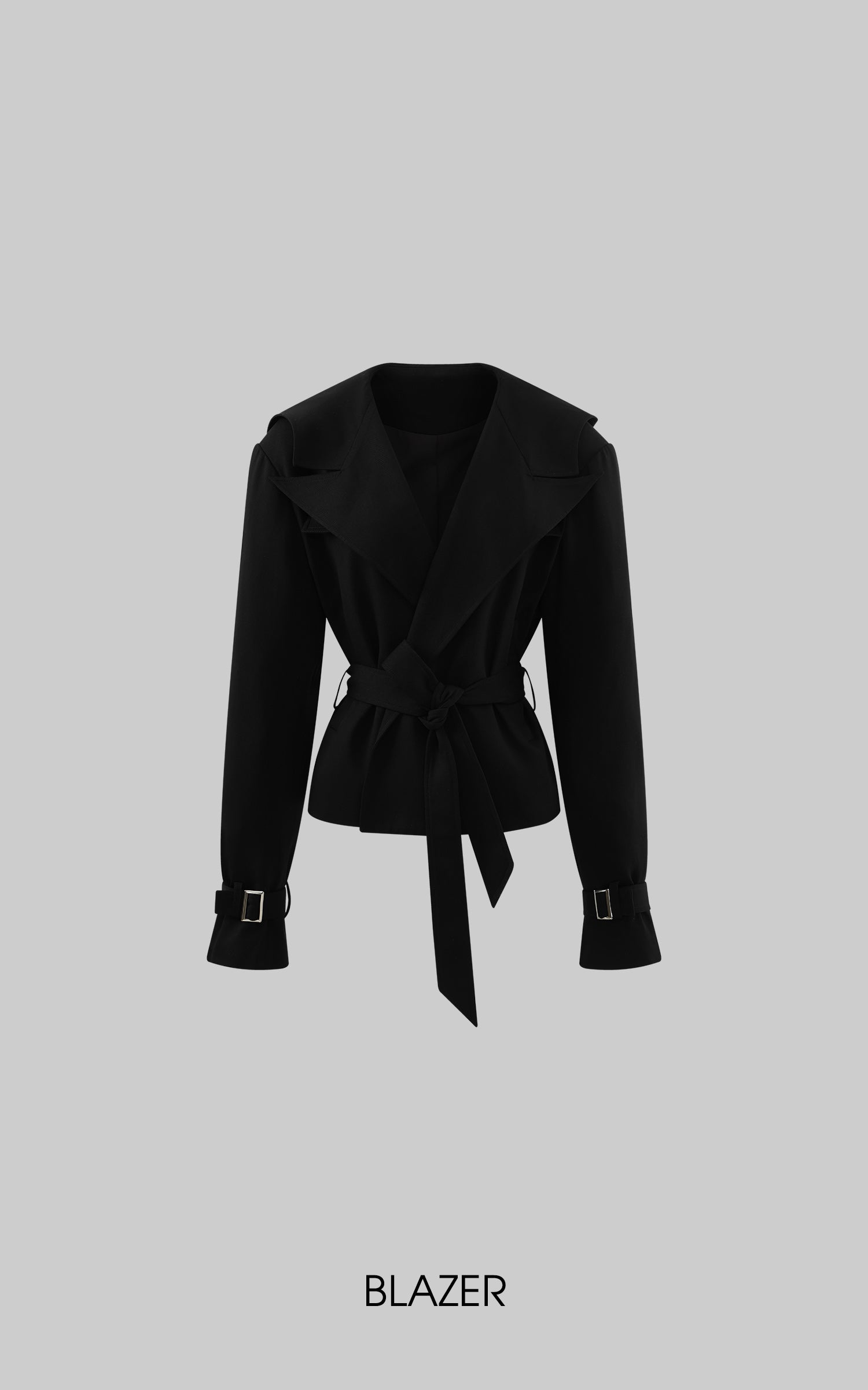 ROVENTE Cropped Double-Breasted Trench Jacket with Structured Lapels and Buckled Cuffs