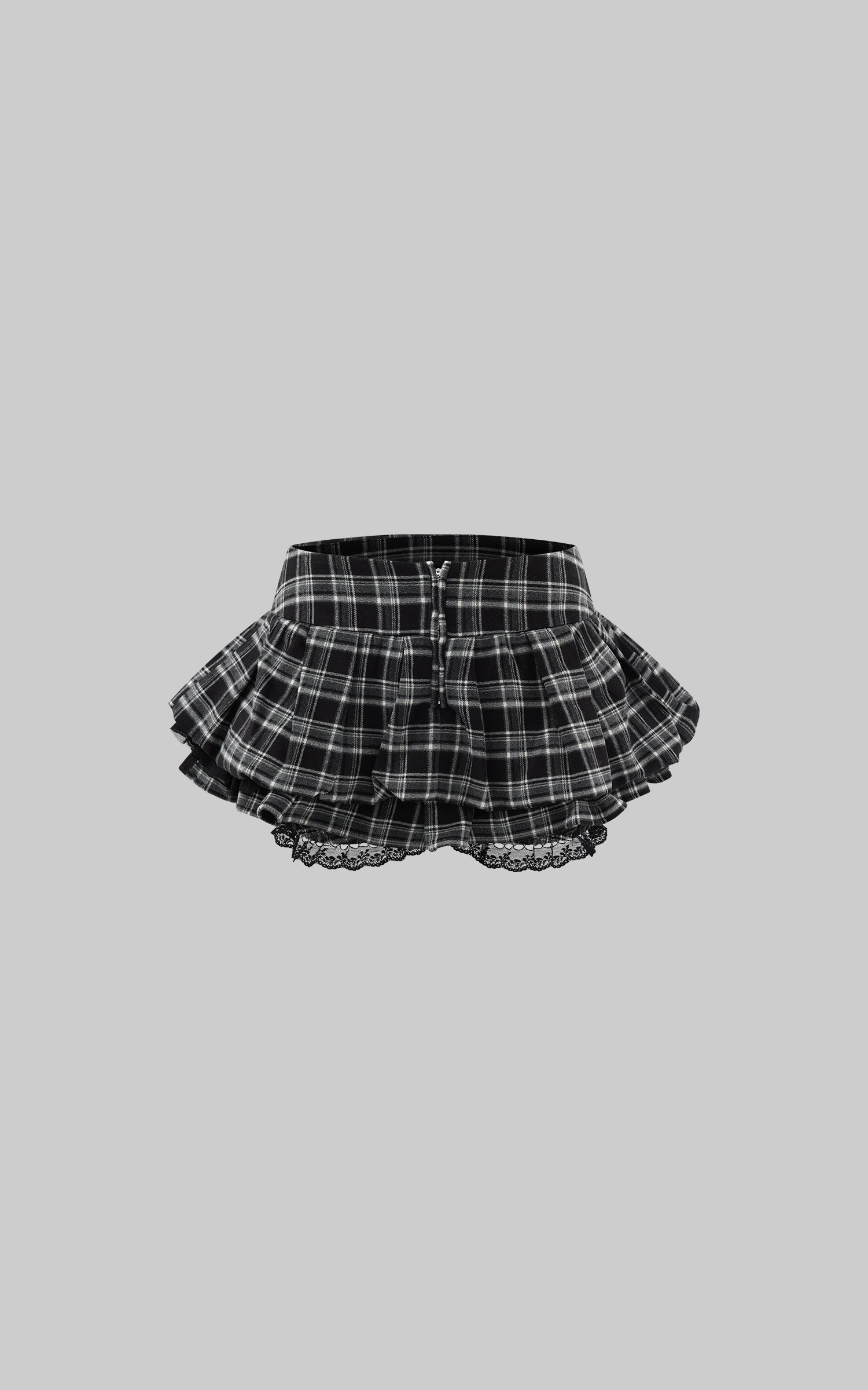 WARDEN EDGE Plaid Lace Trim Layered Mini Skirt