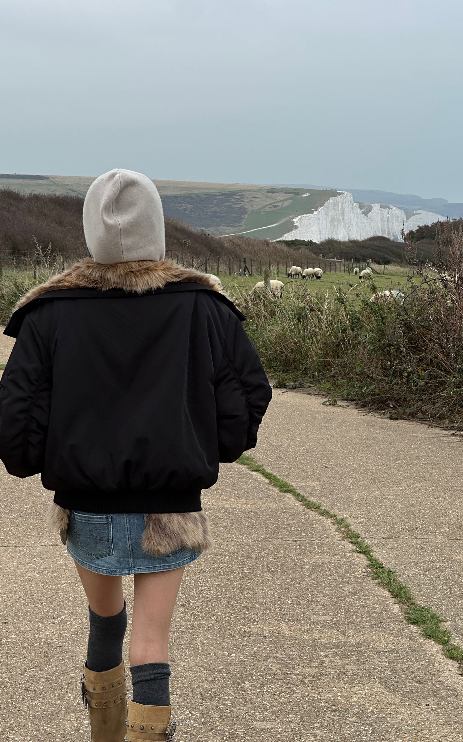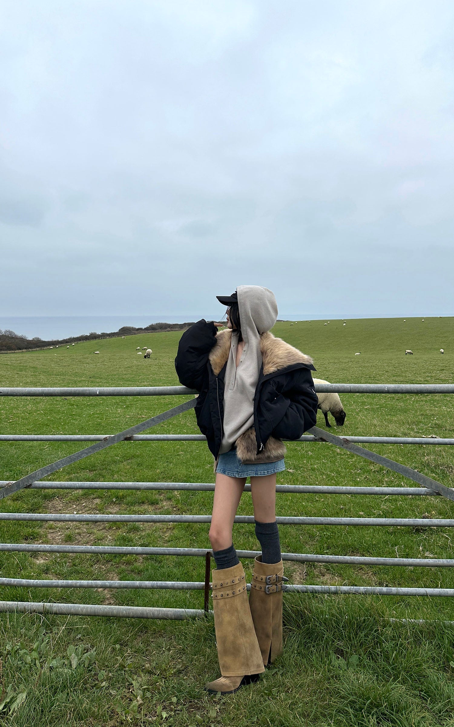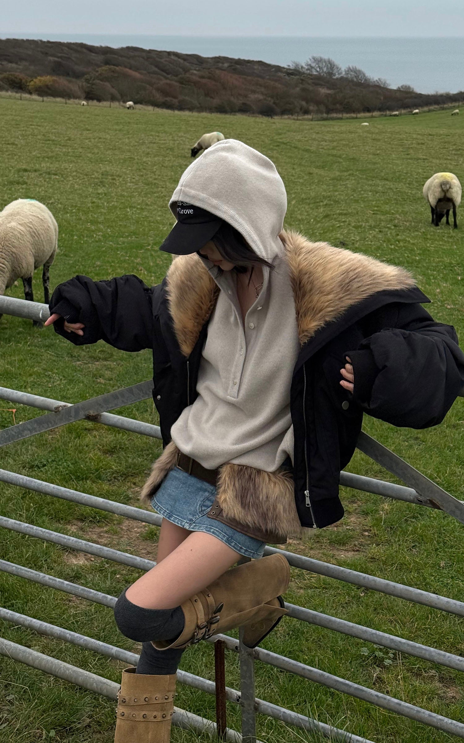 WARDEN EDGE Denim Mini Skirt with Faux-Fur Belt Detail