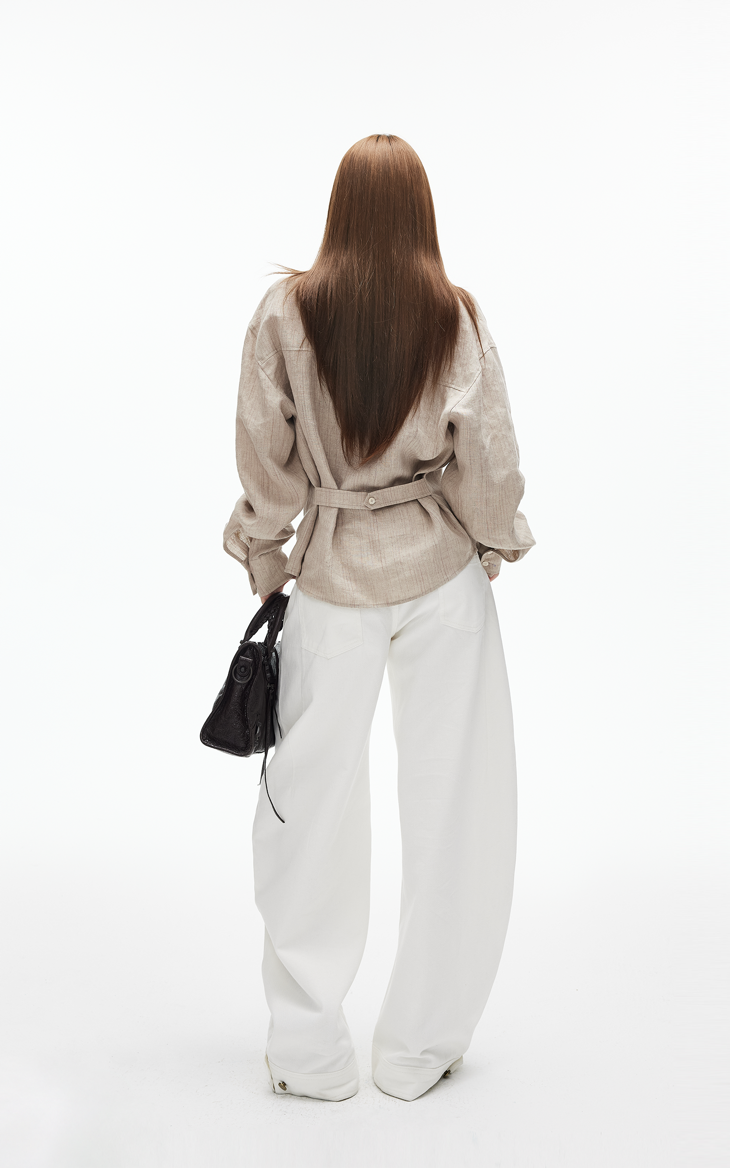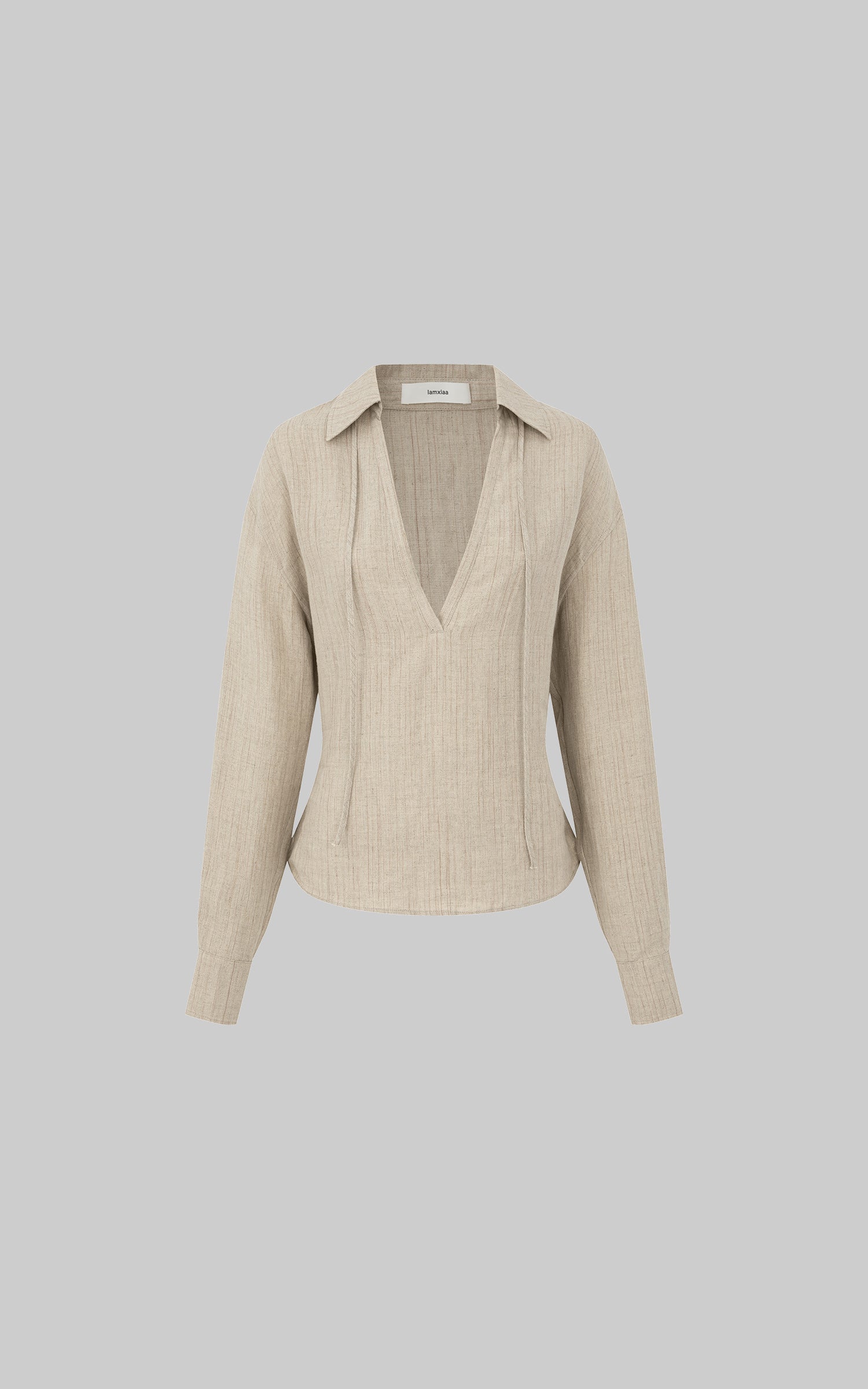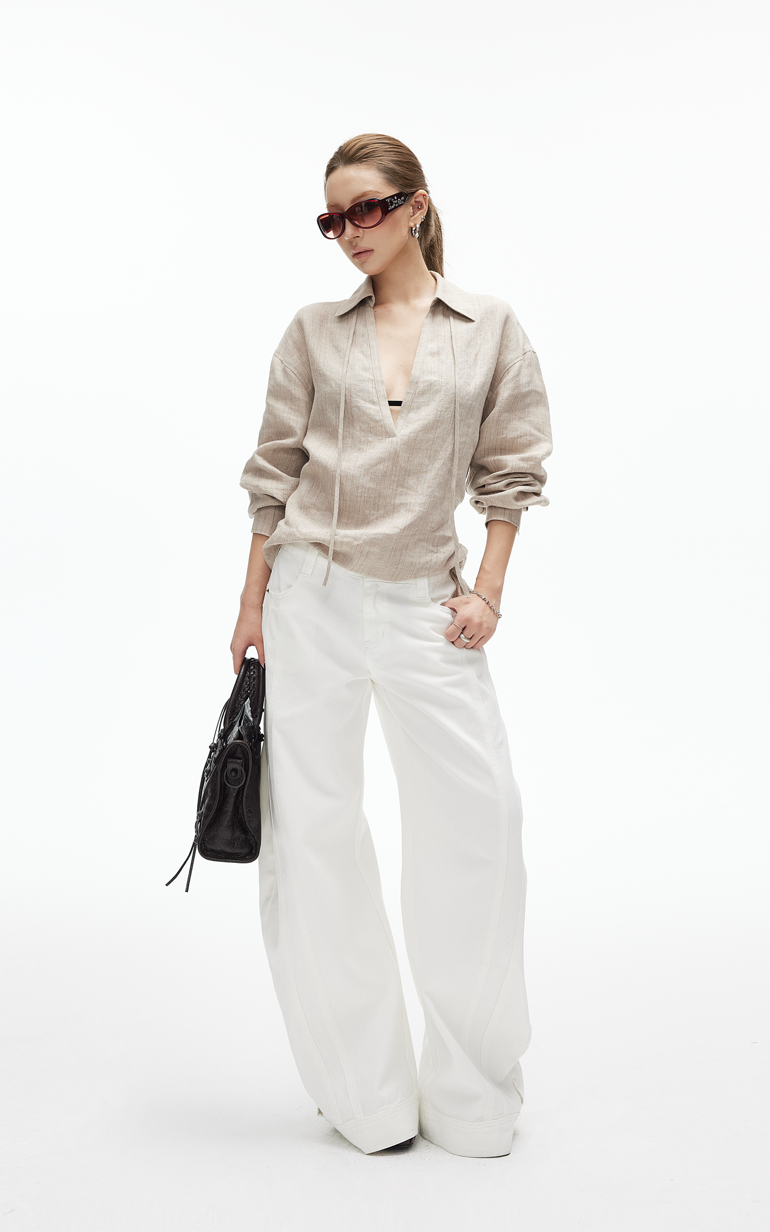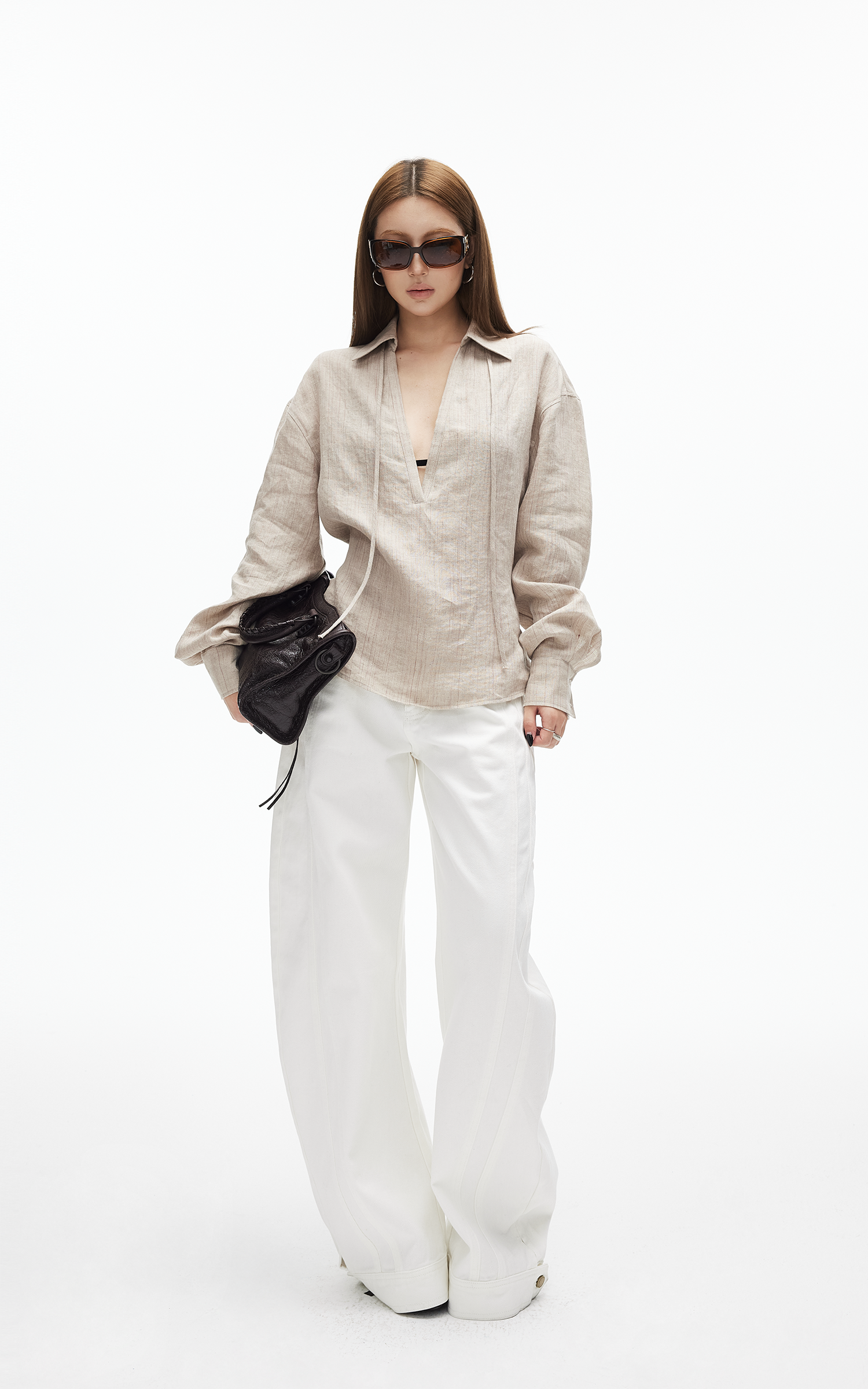 IAMXIAA Deep V Neck Linen Shirt with Relaxed Fit and Belted Back