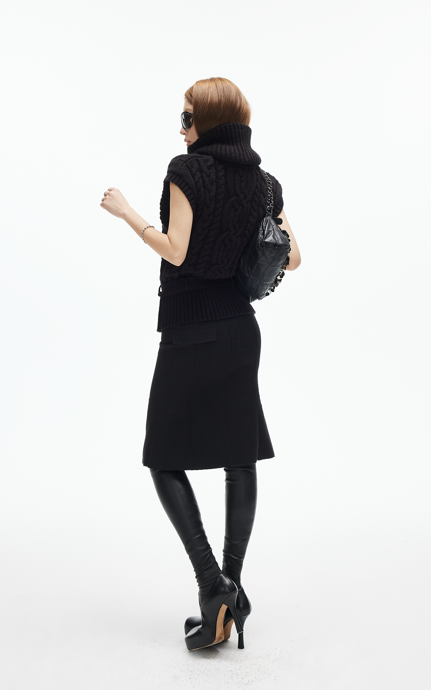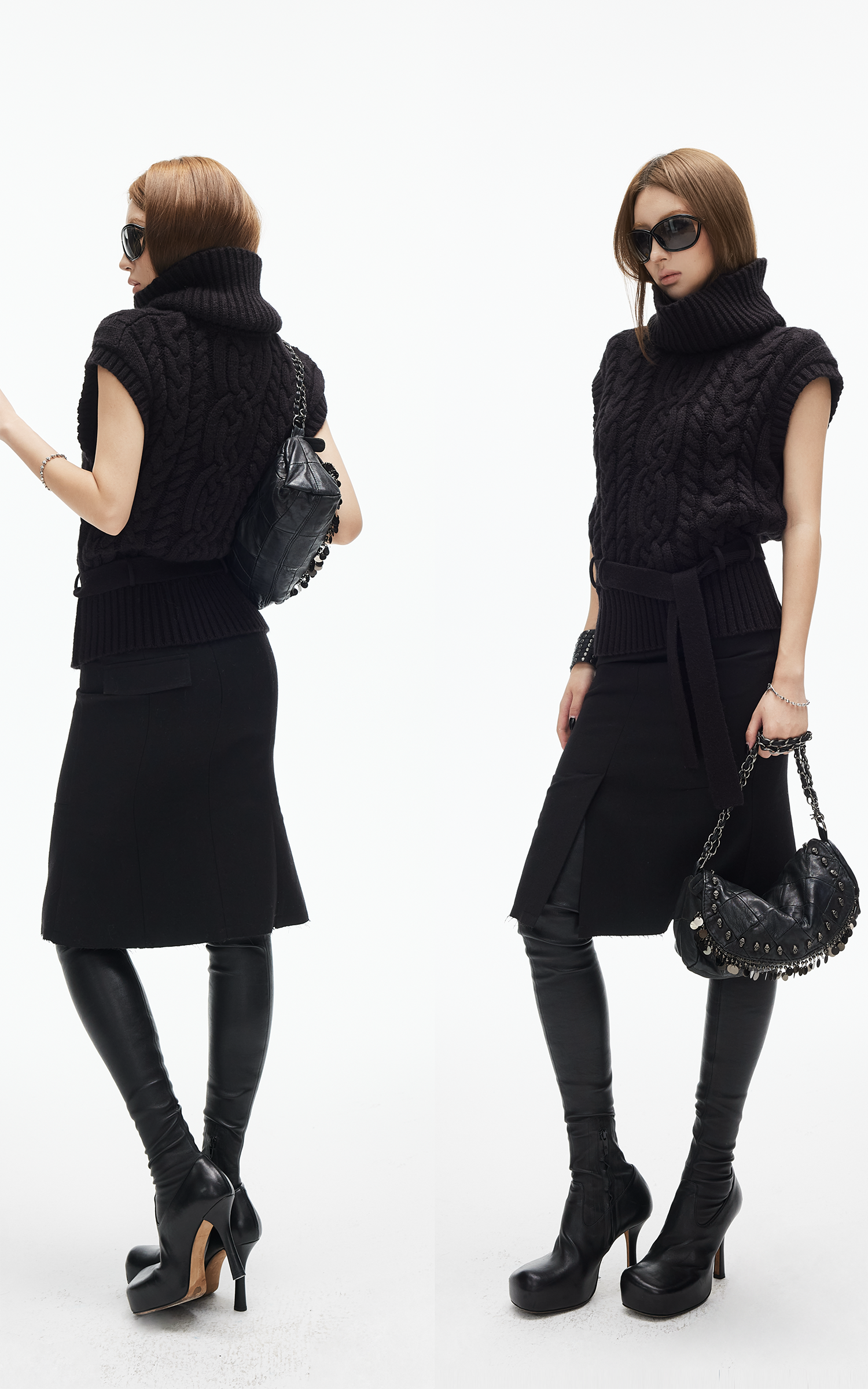 IAMXIAA Cable Knit Turtleneck Vest with Waist Tie