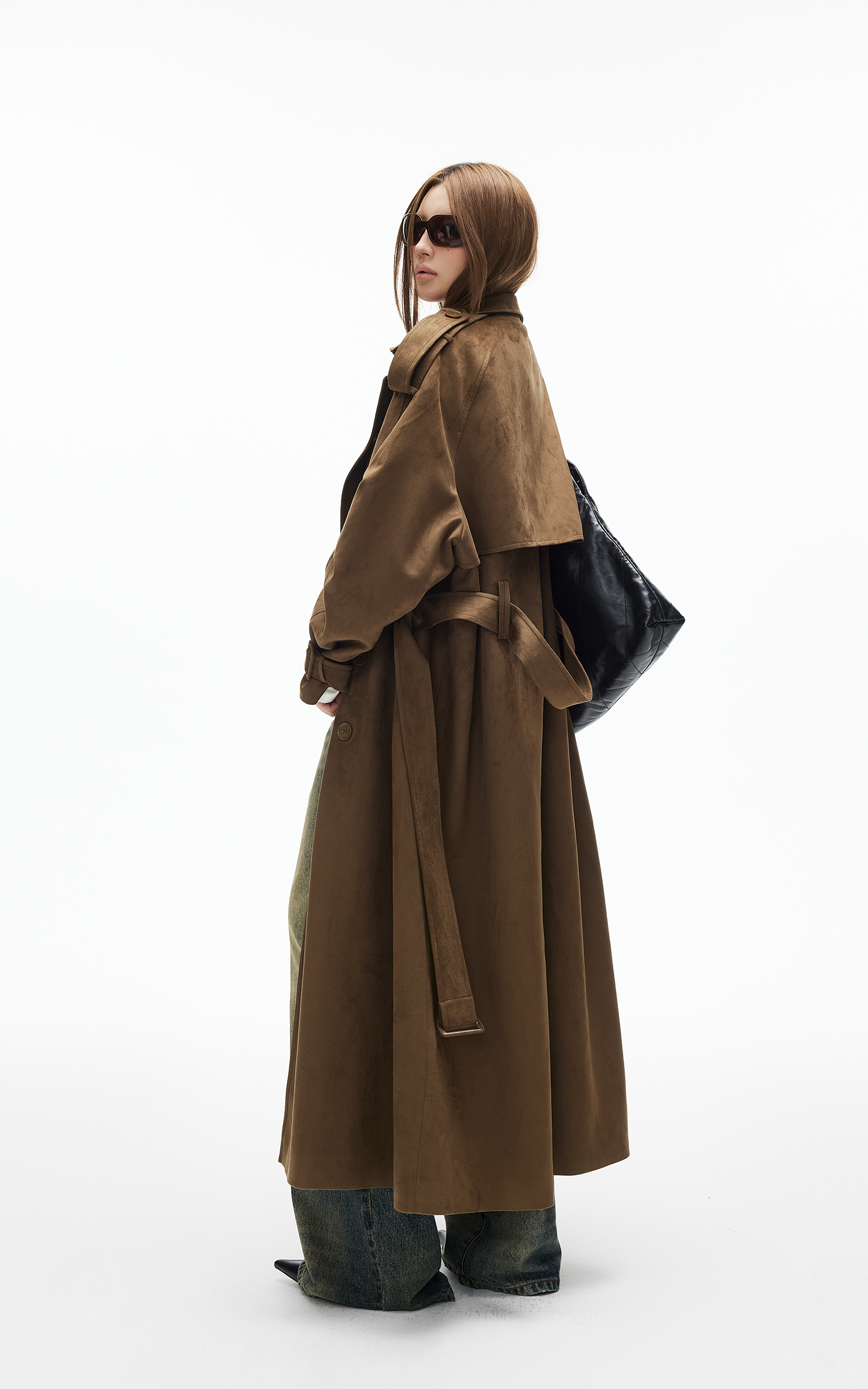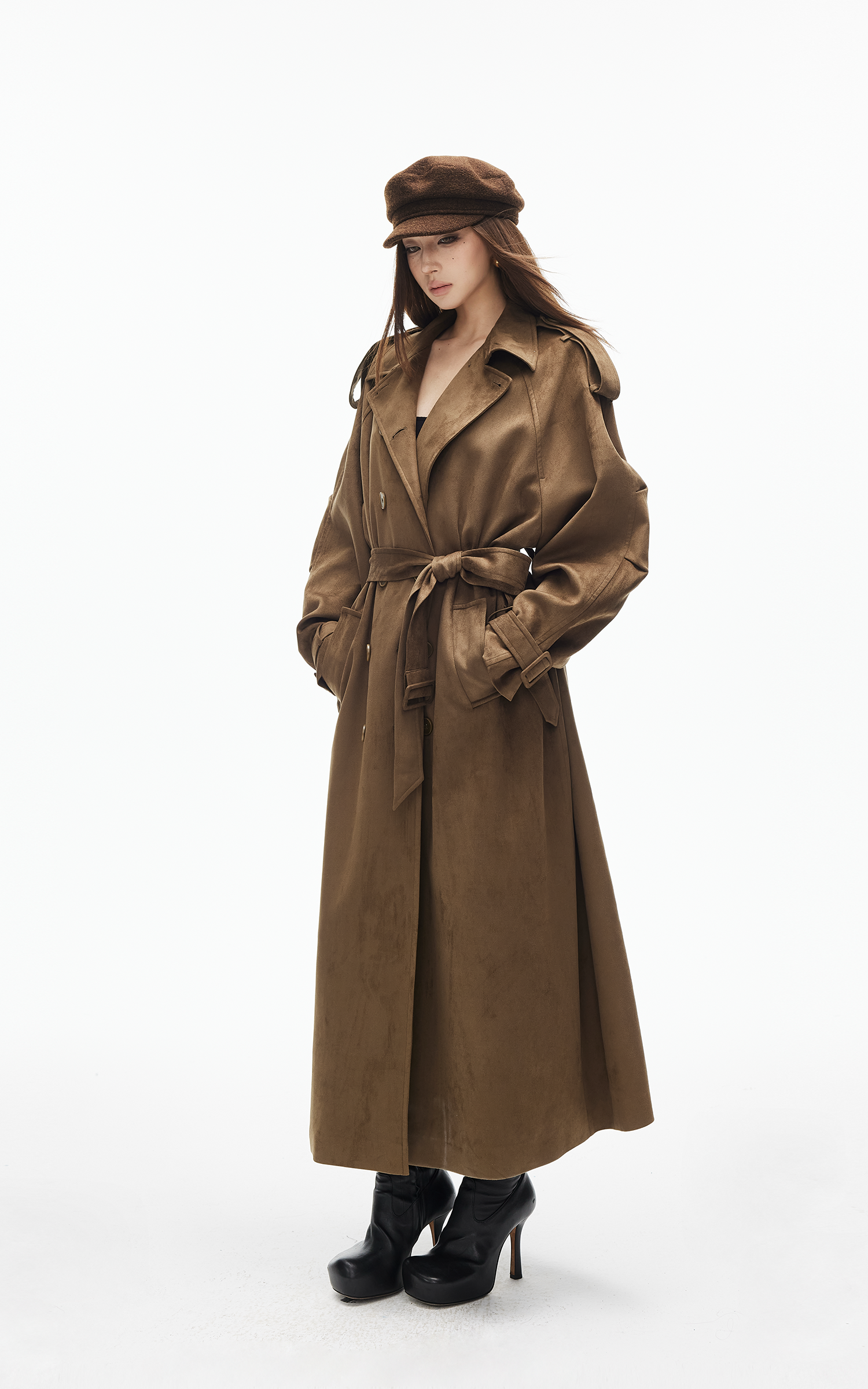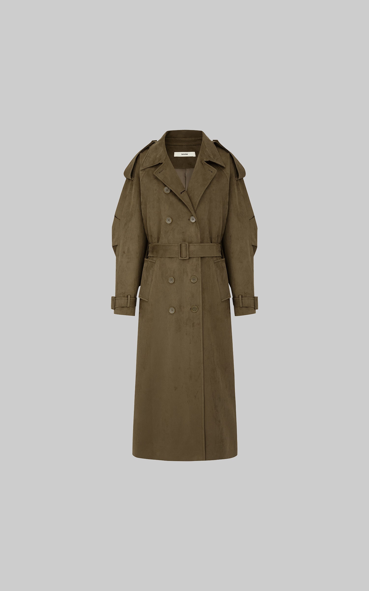 IAMXIAA Faux Suede Long Trench Coat Double Breasted Design
