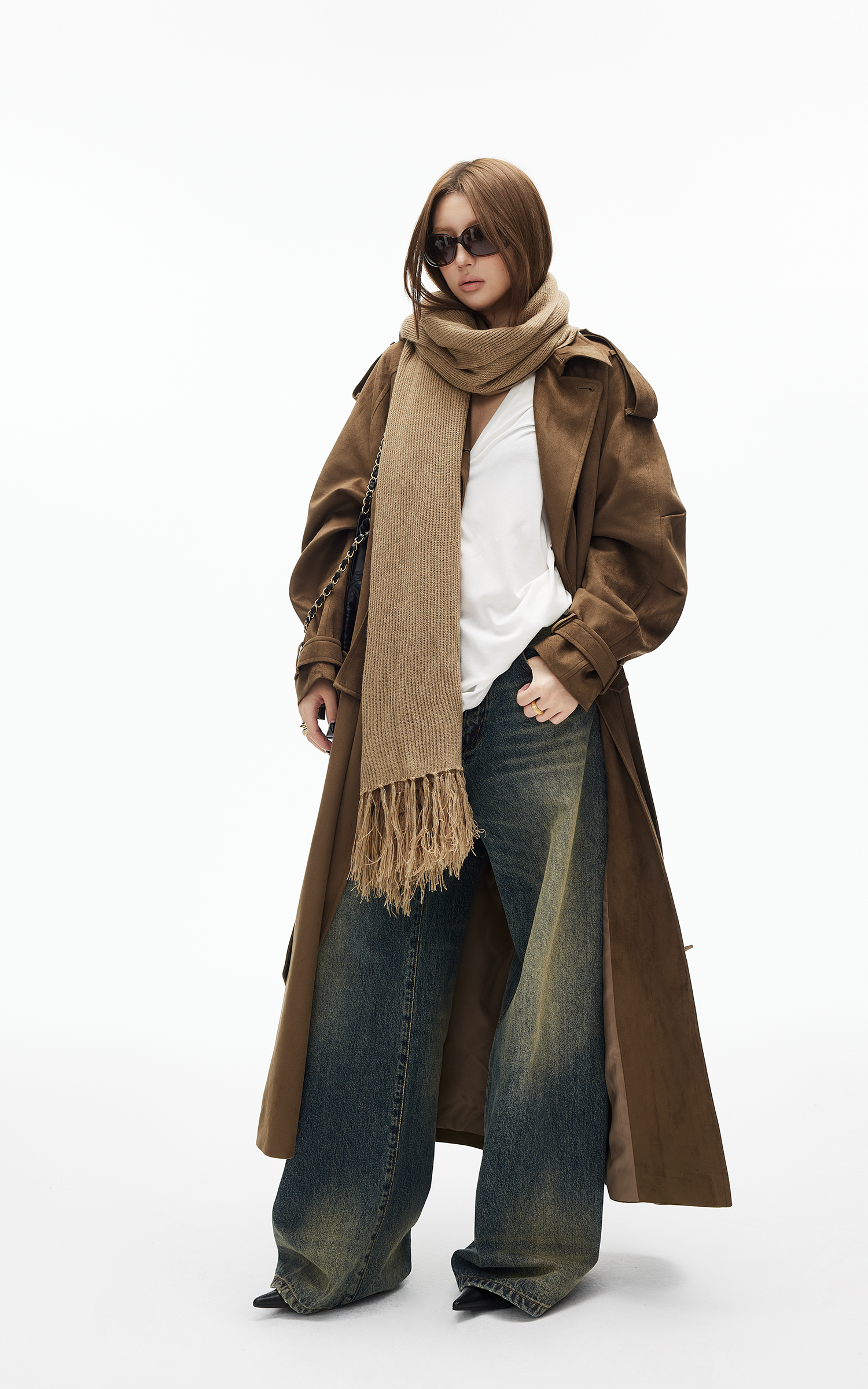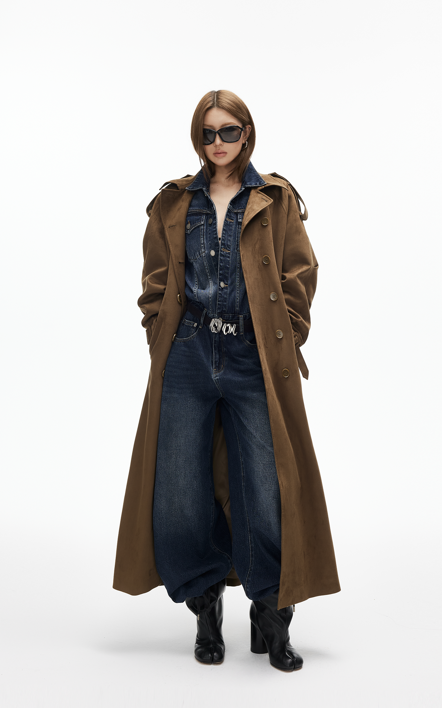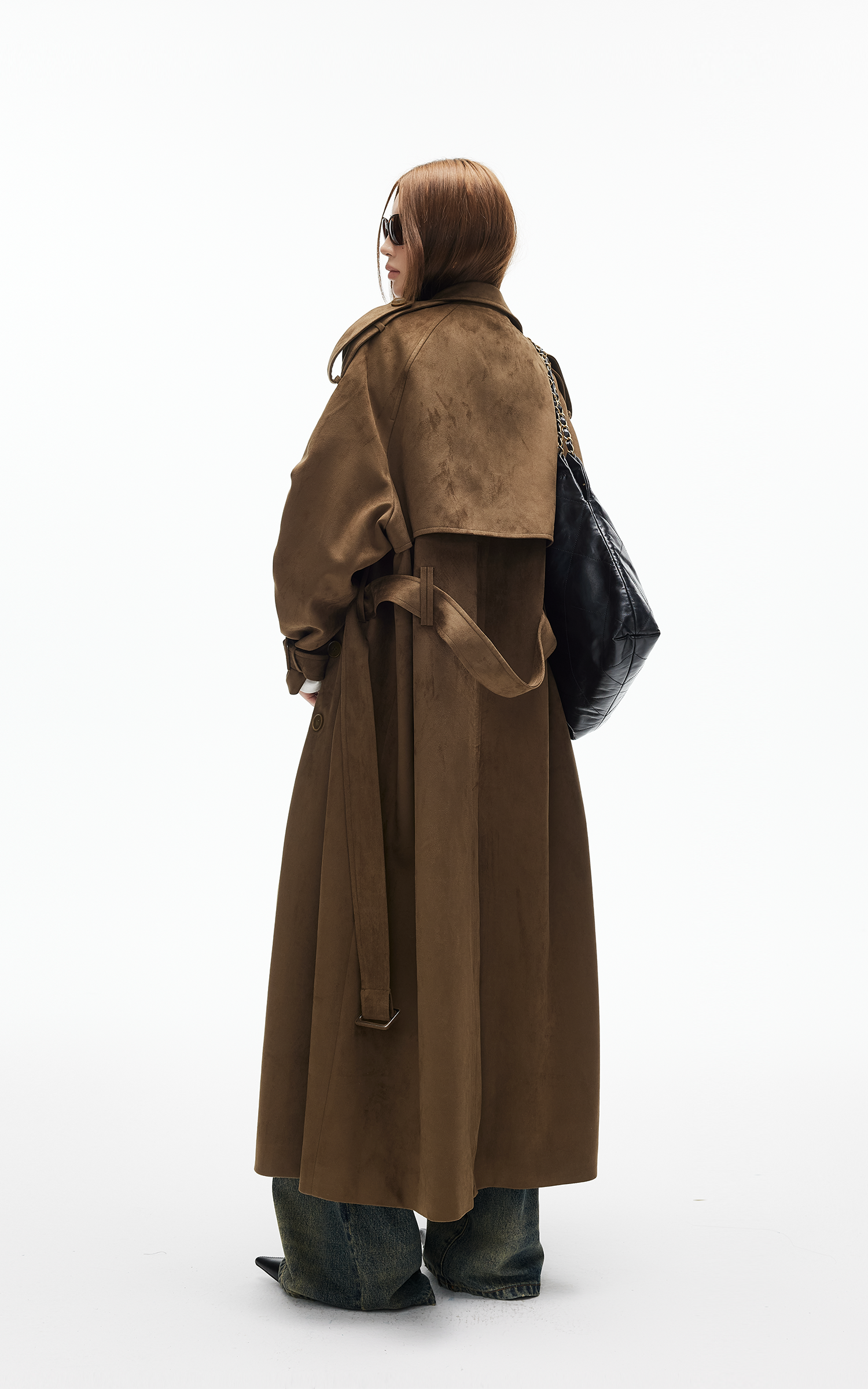 IAMXIAA Faux Suede Long Trench Coat Double Breasted Design