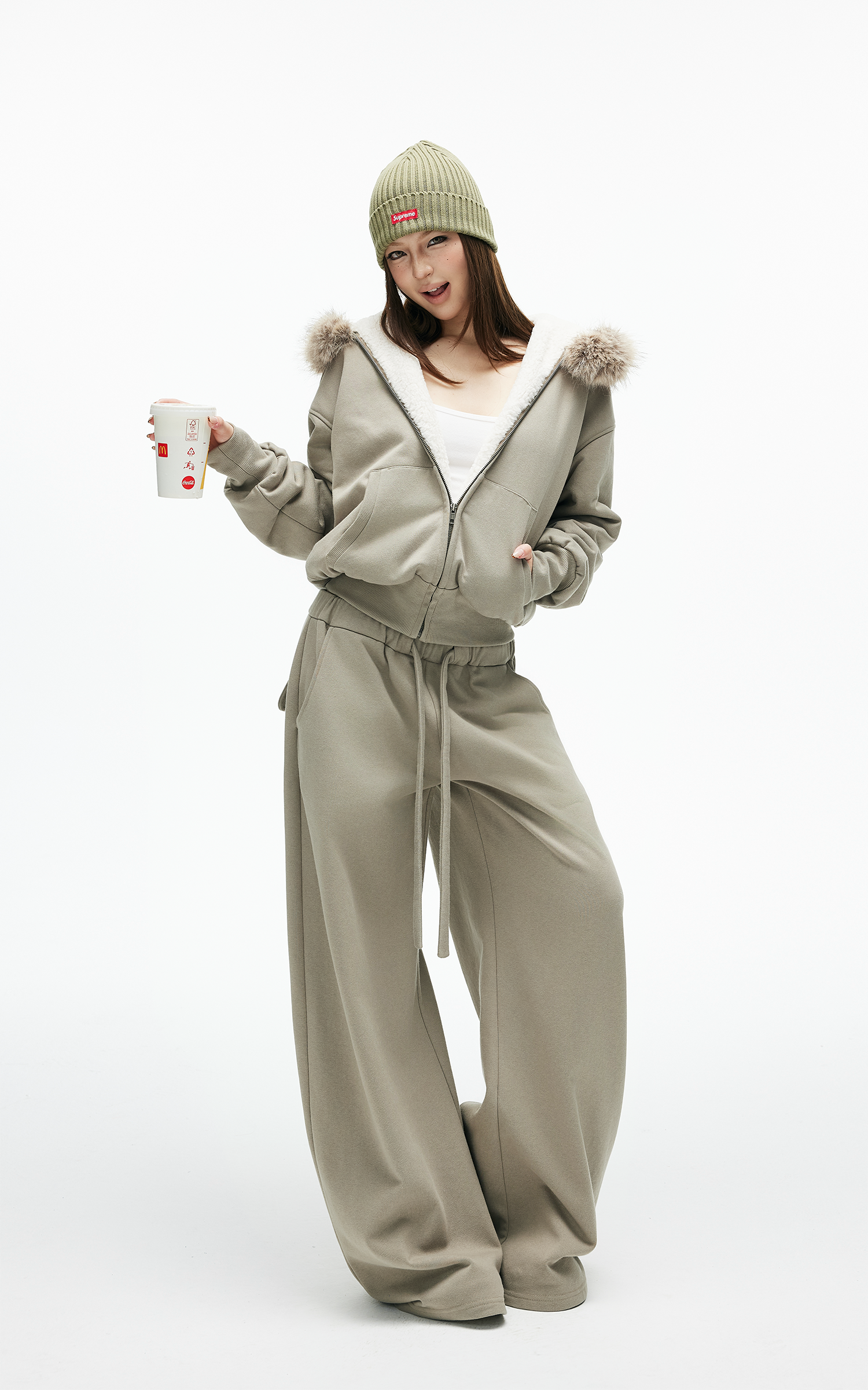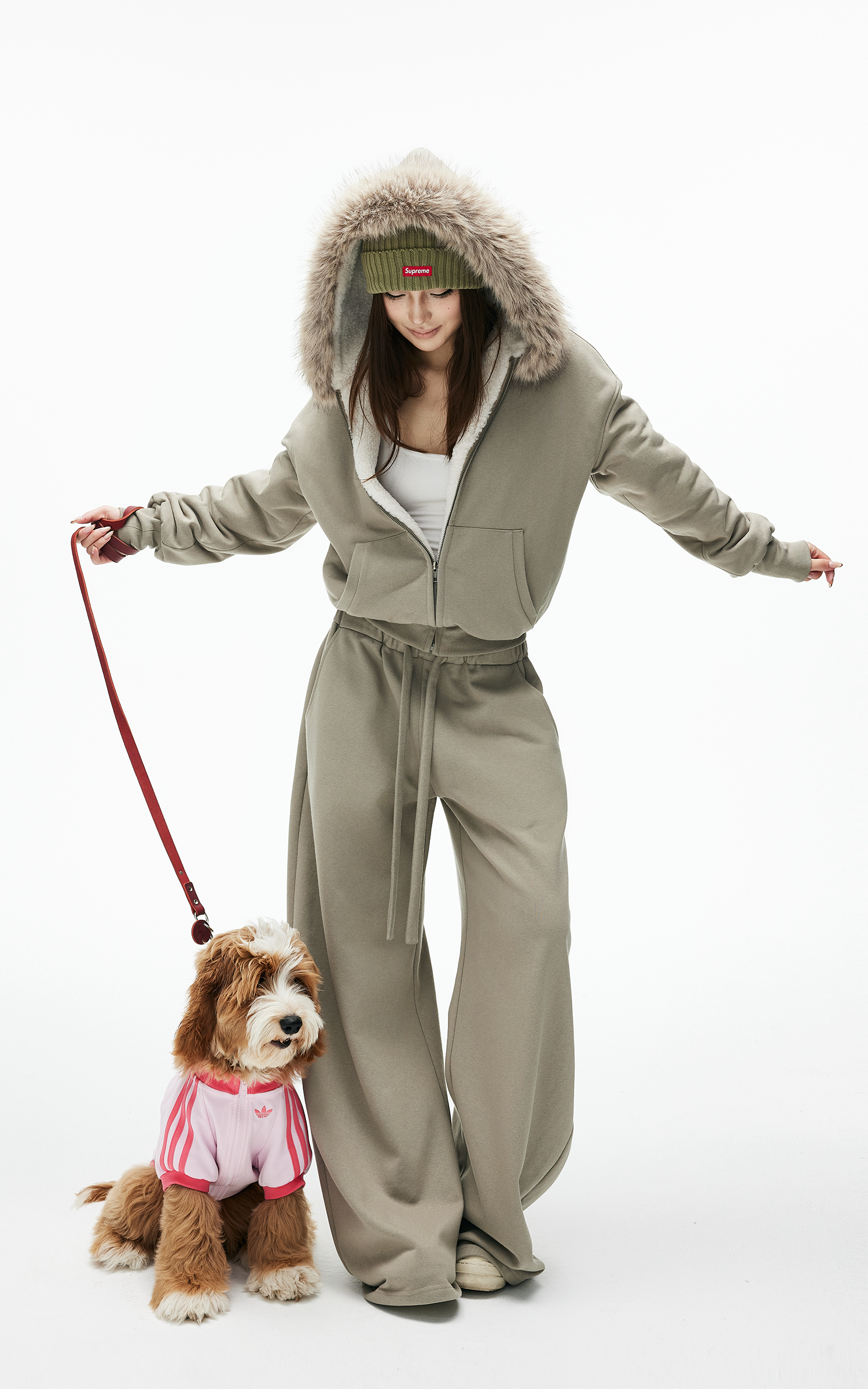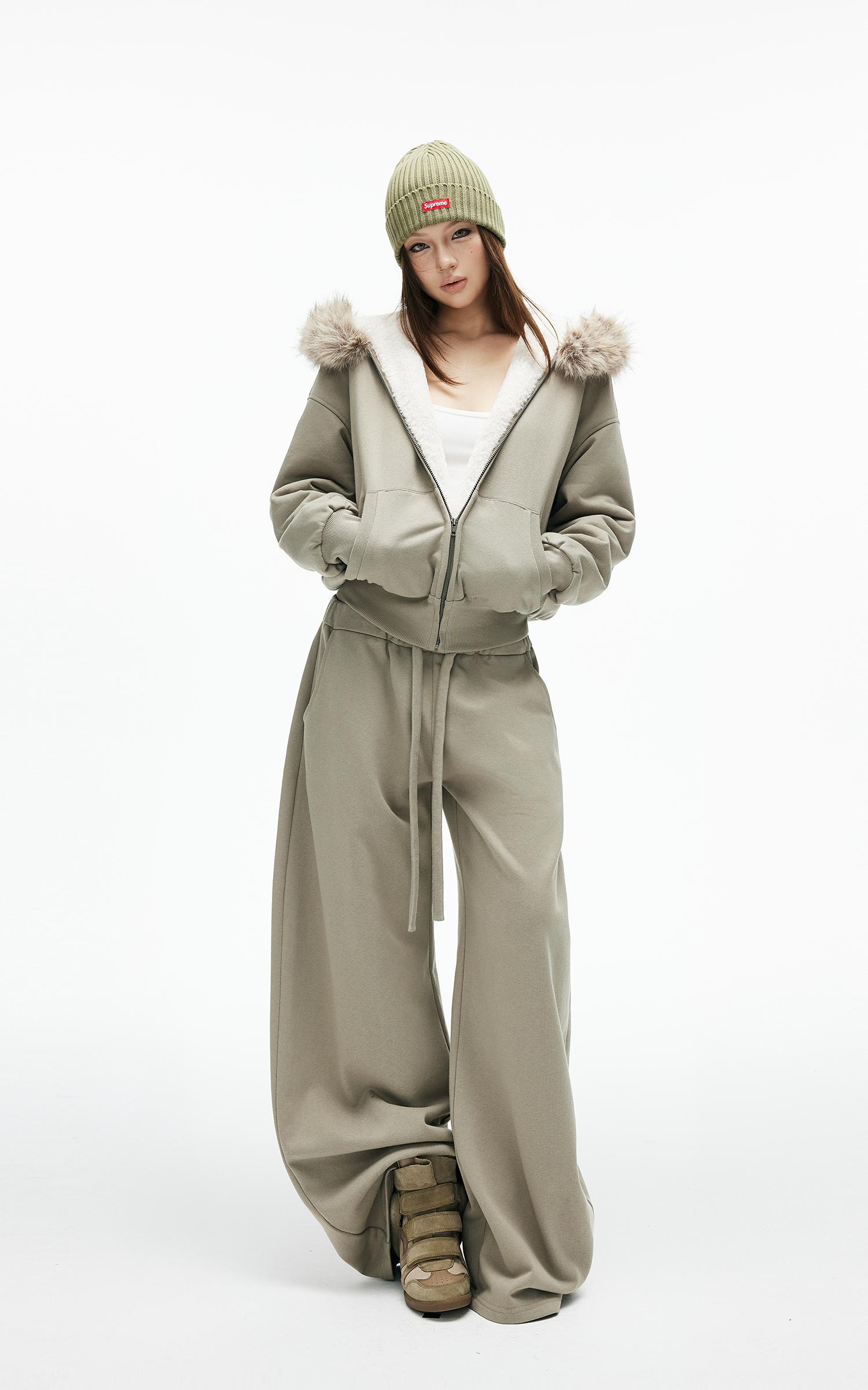 IAMXIAA Faux Fur Trim Hoodie Zip Jacket & Wide-Leg Sweatpants Set