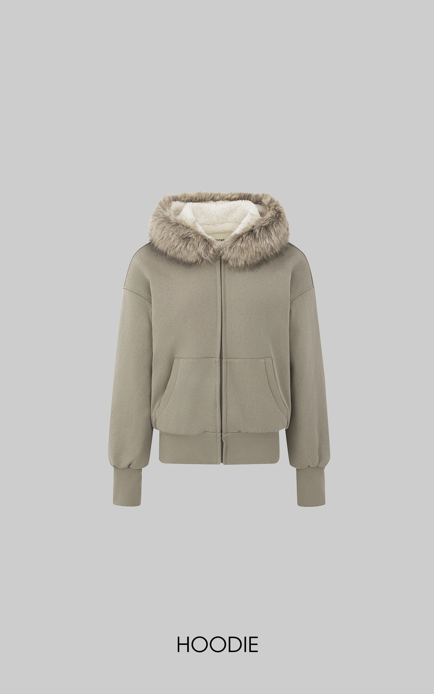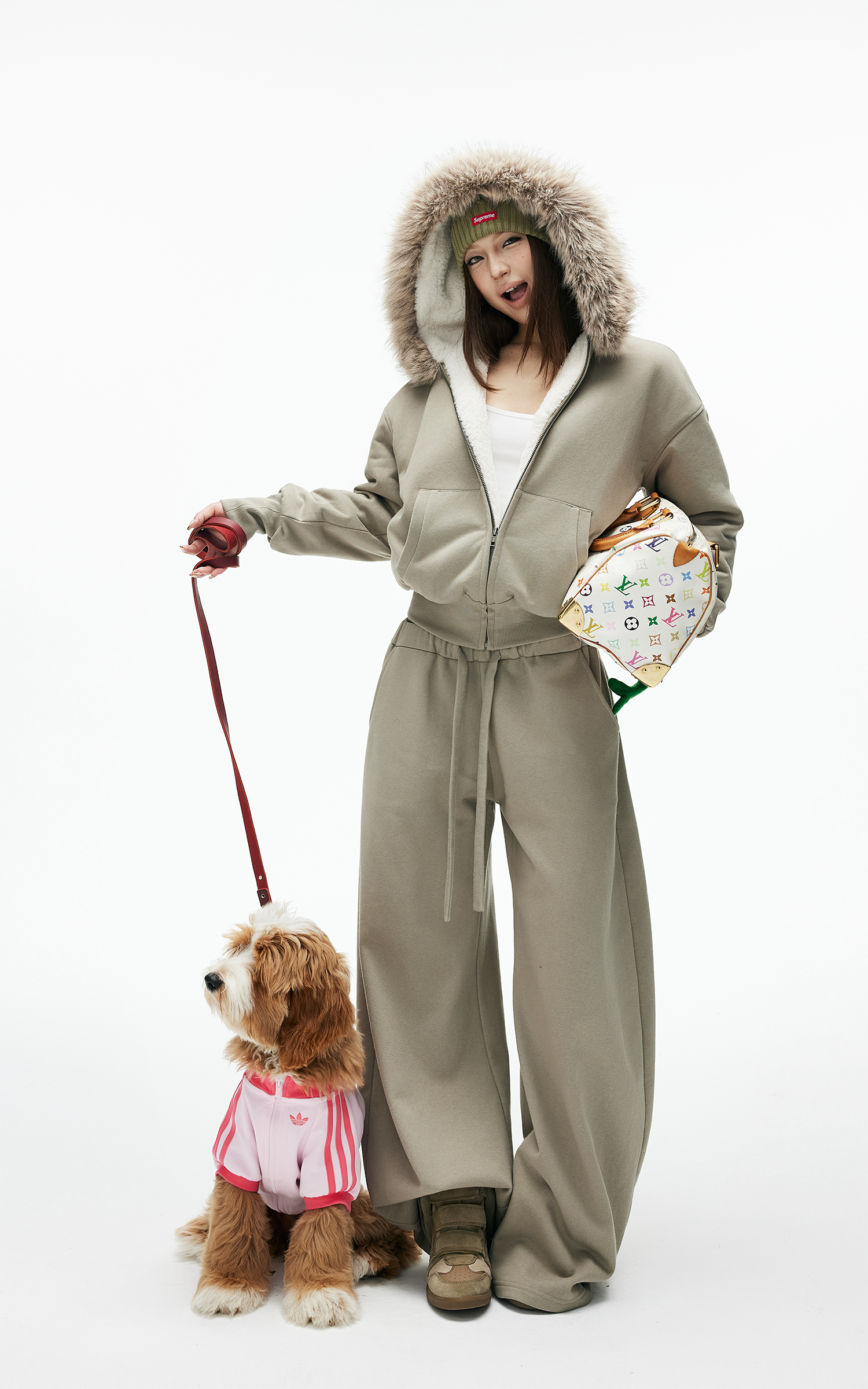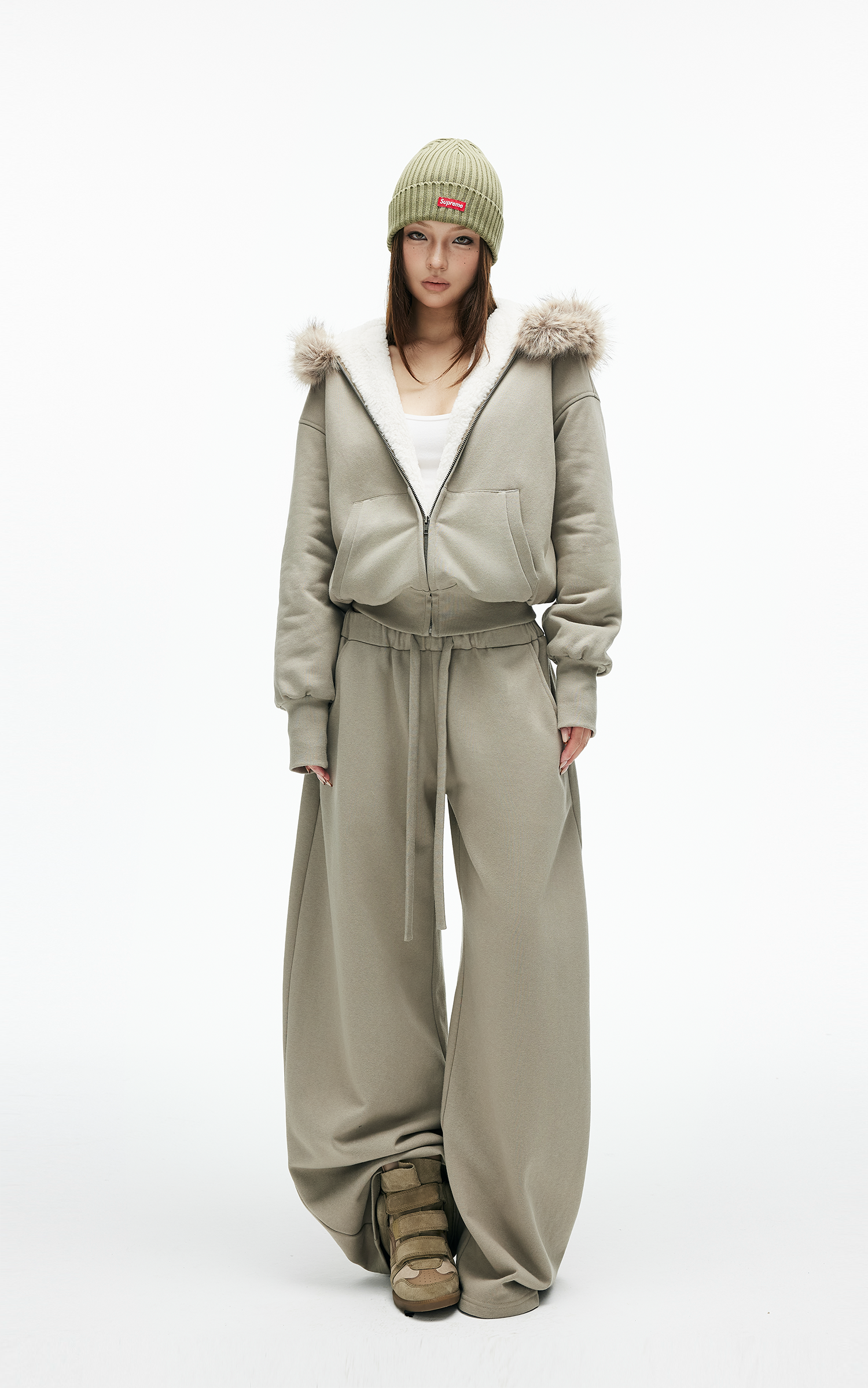 IAMXIAA Faux Fur Trim Hoodie Zip Jacket & Wide-Leg Sweatpants Set