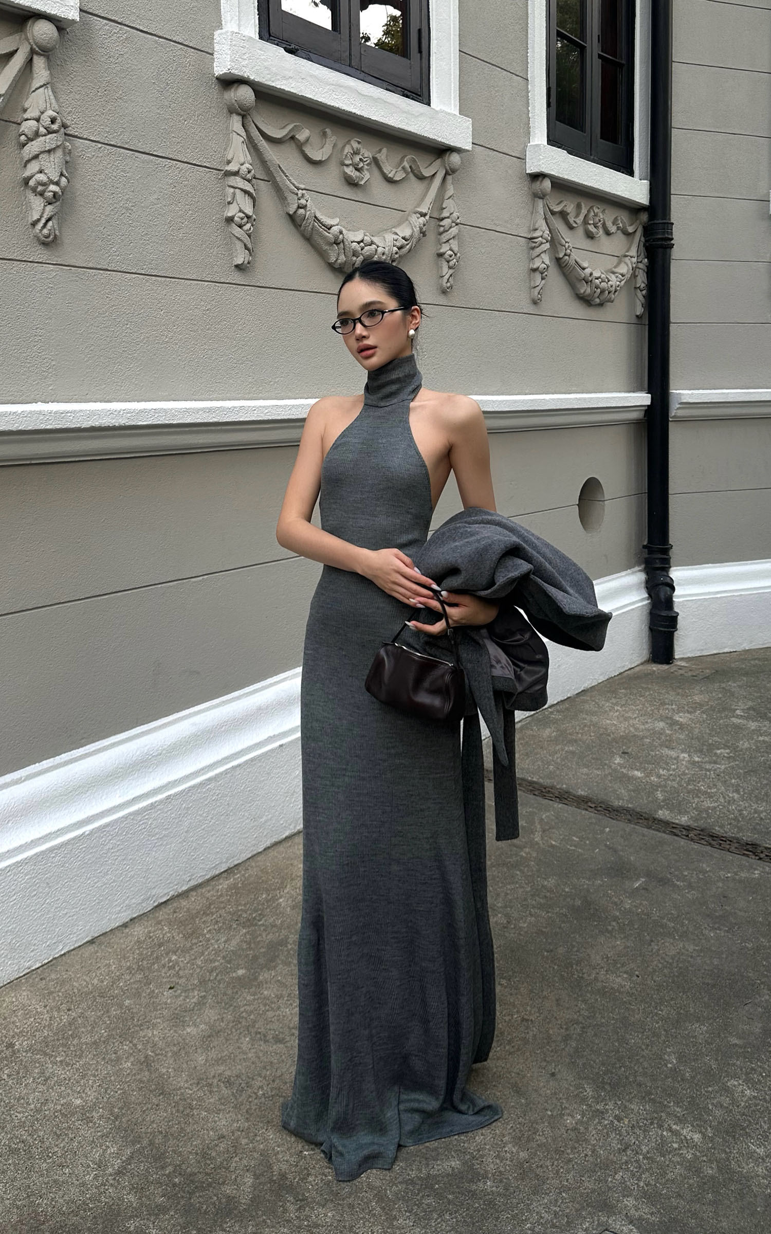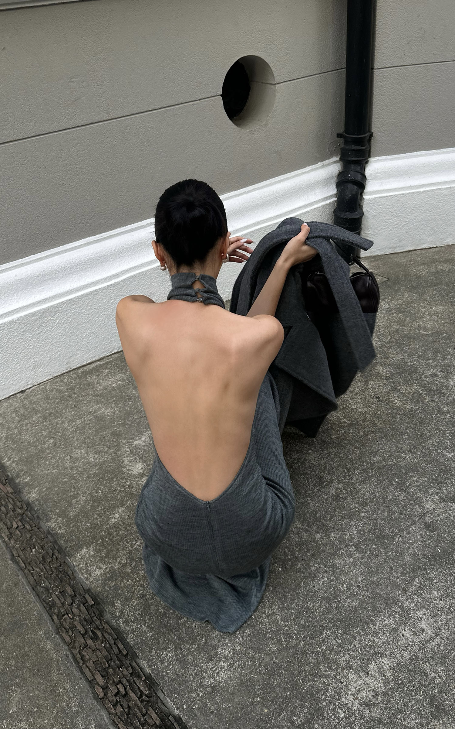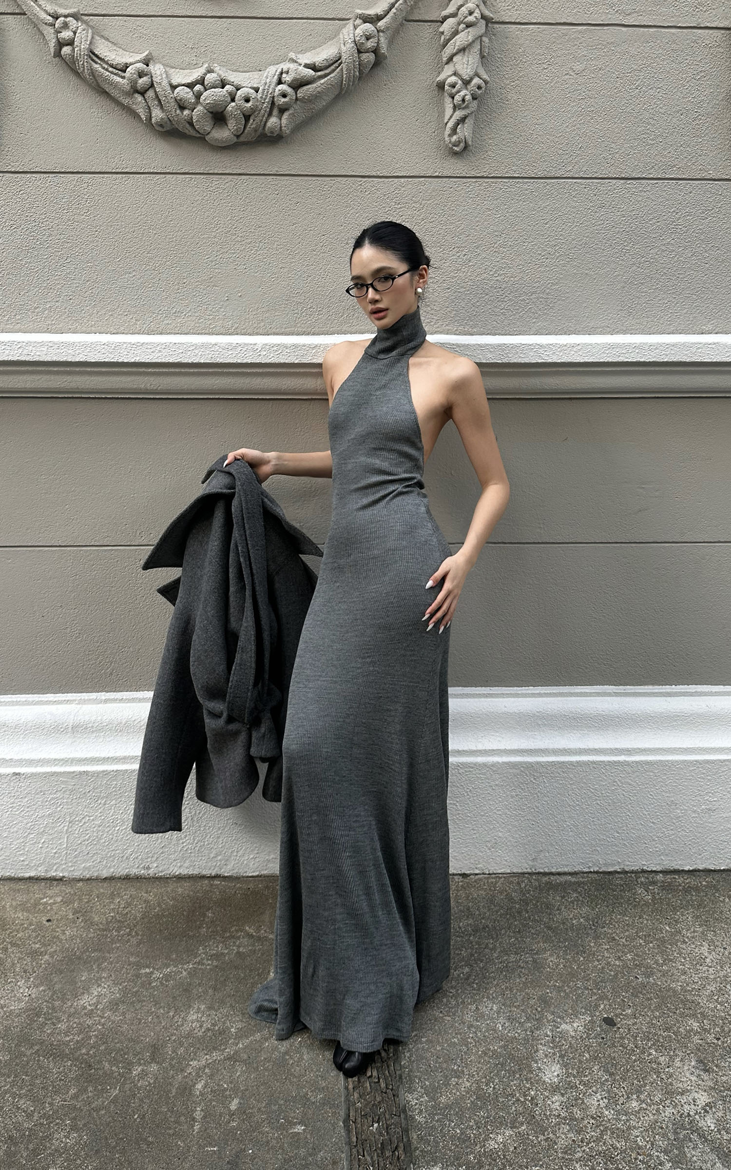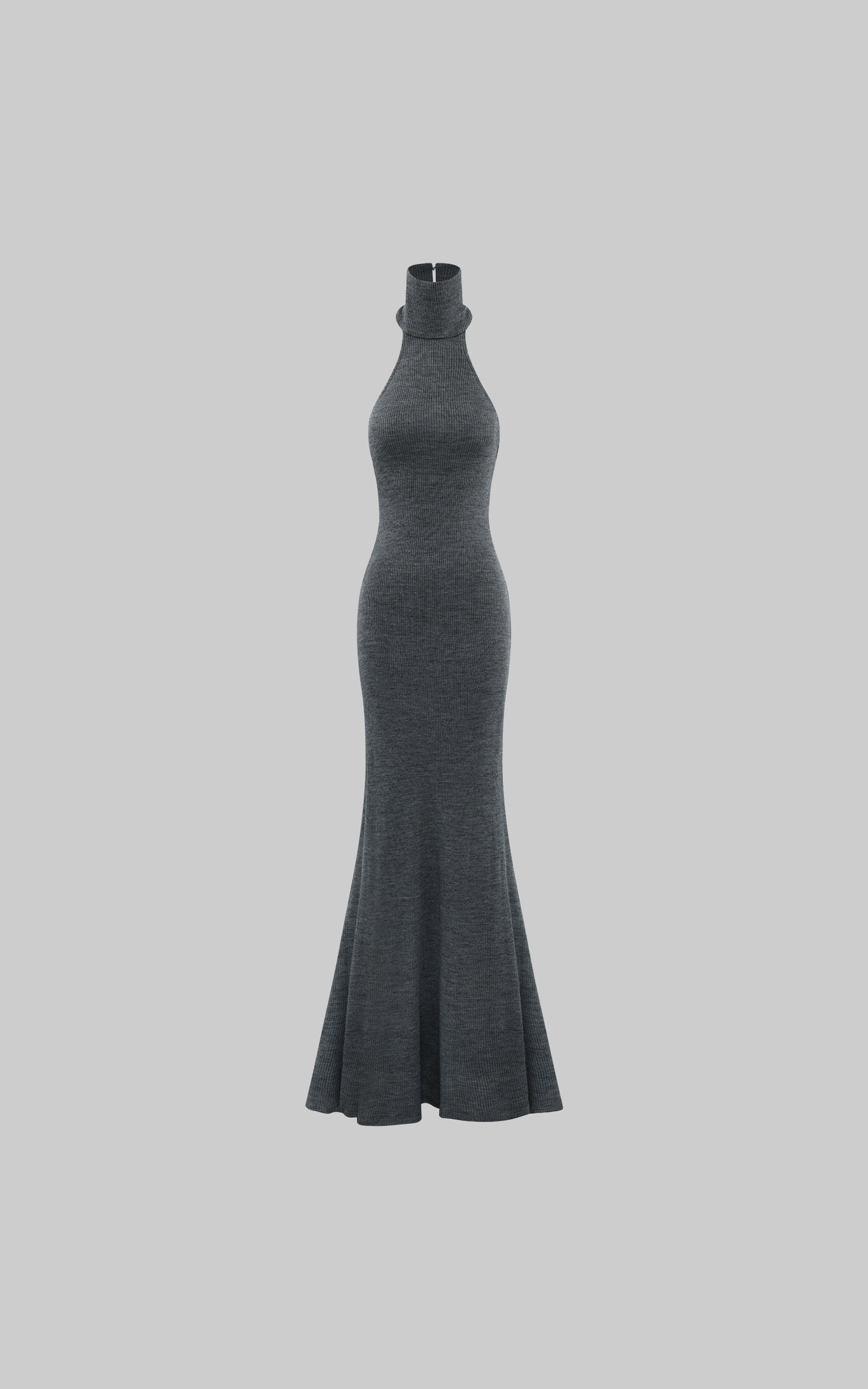 ROVENTE Halter Backless Rib-Knit Maxi Dress
