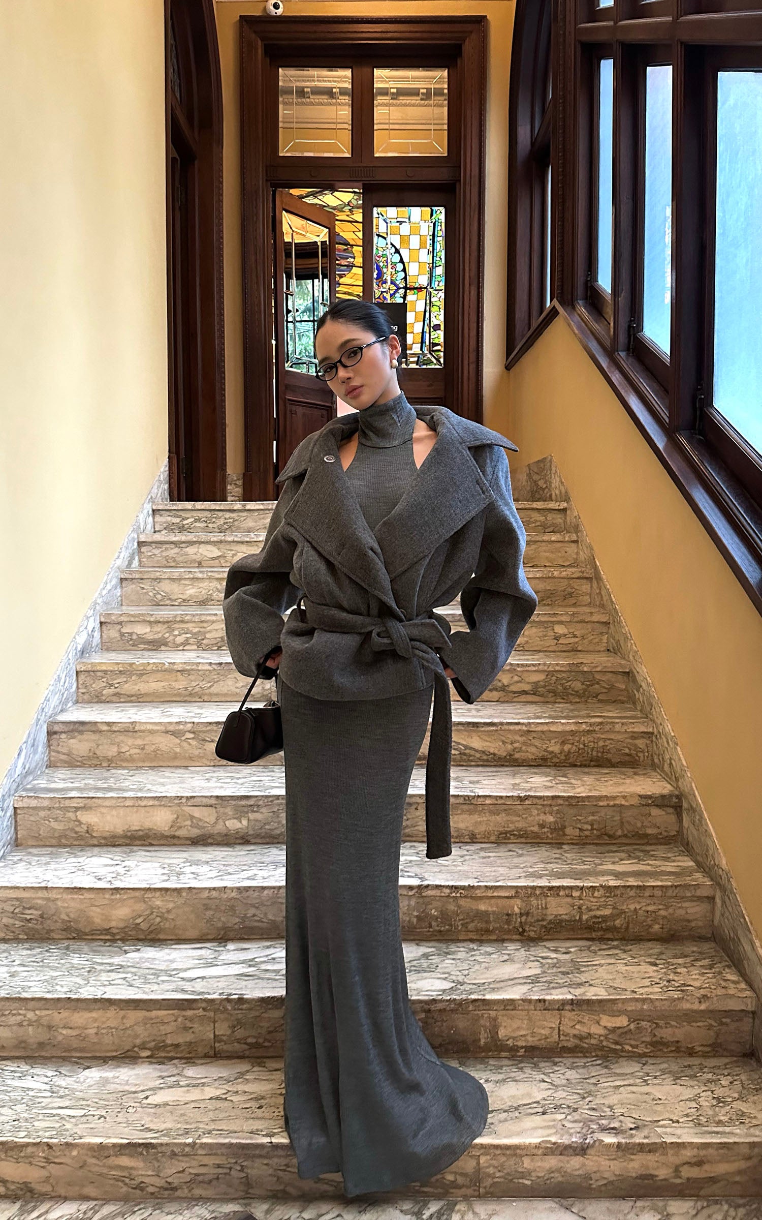 ROVENTE Knit Maxi Dress Two Piece Set with Drape Shawl