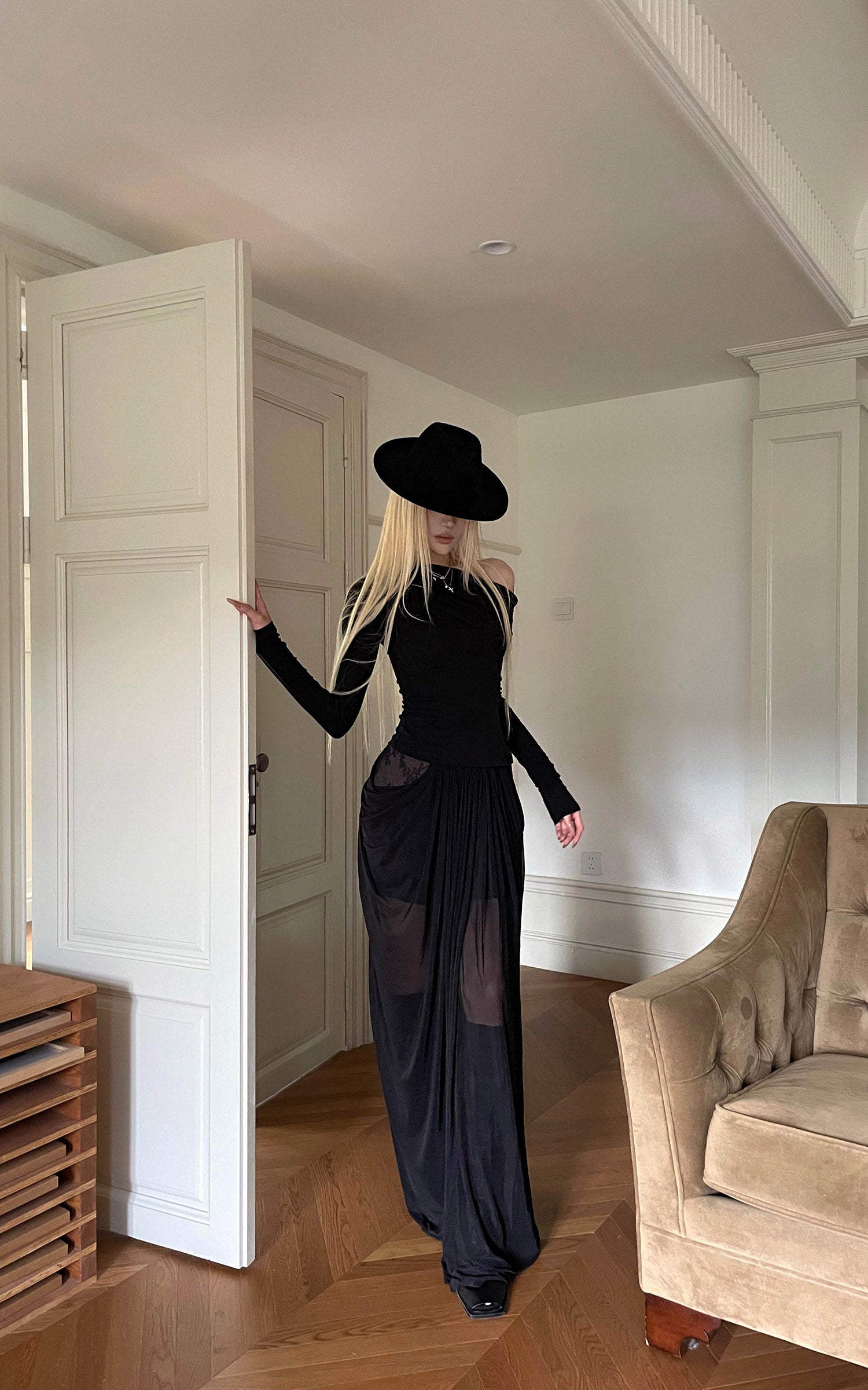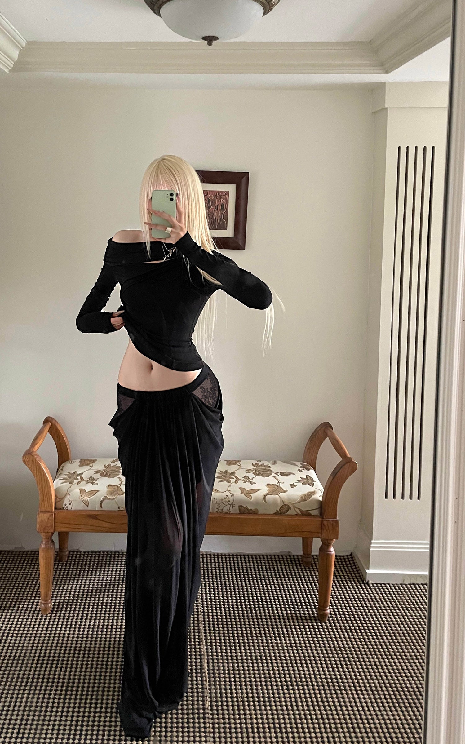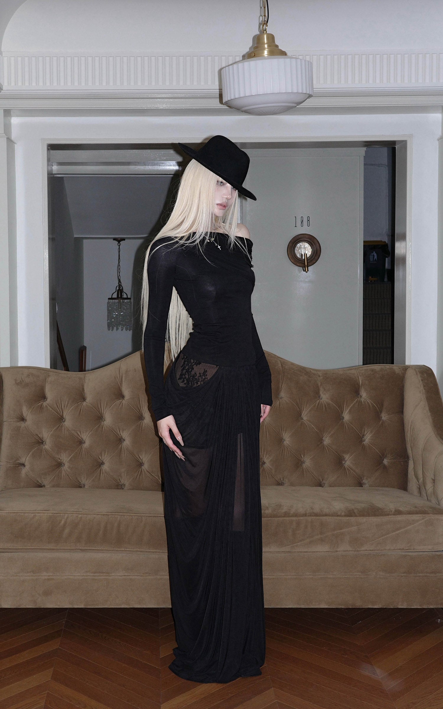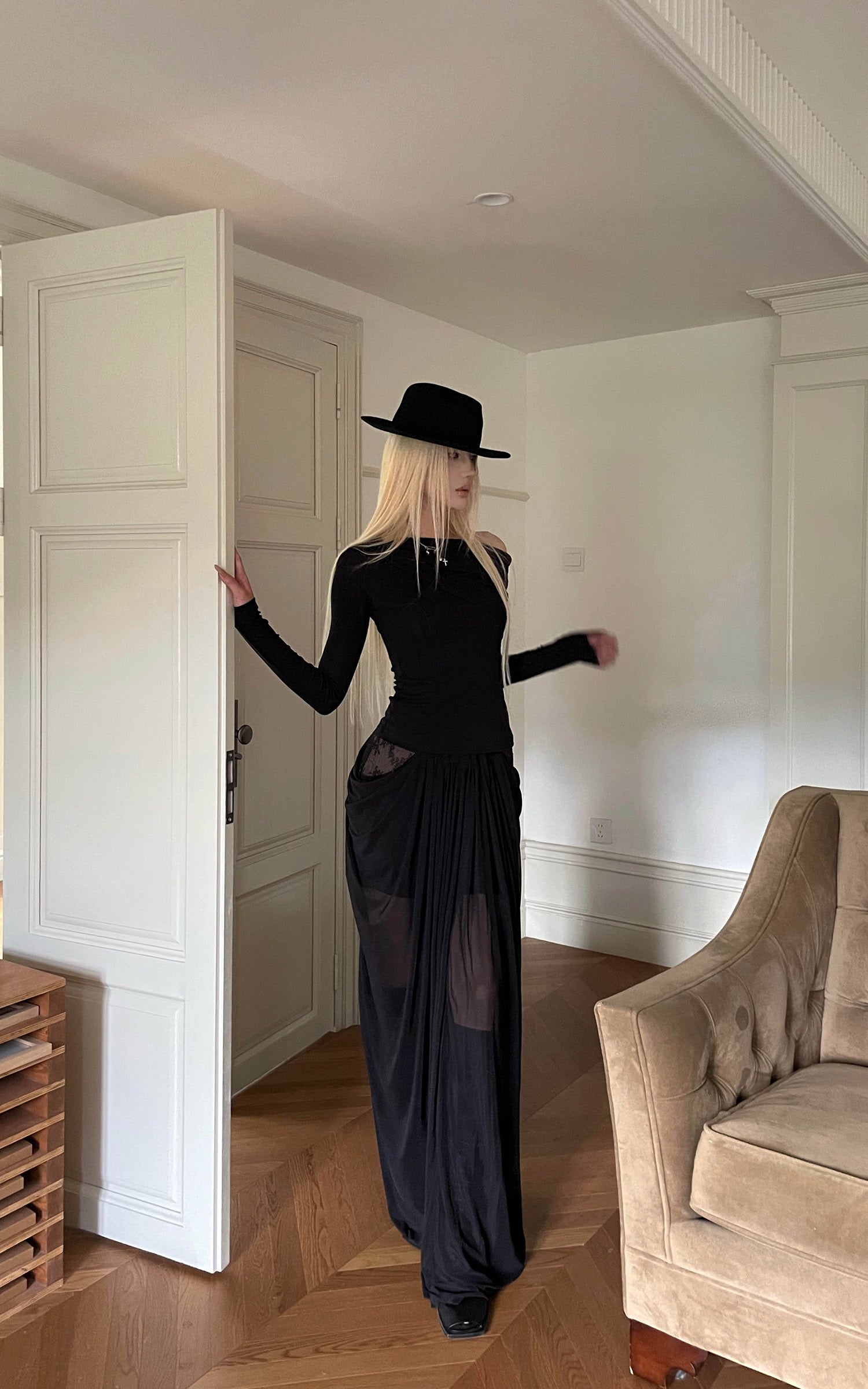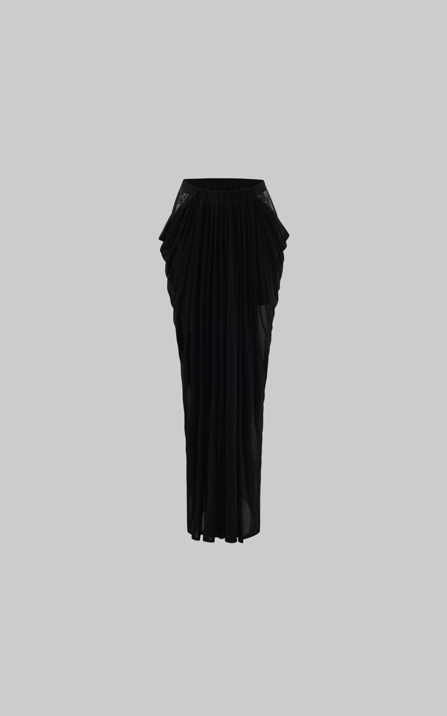 Rase le sol Draped Sheer Mesh Skirt with Lace Panels