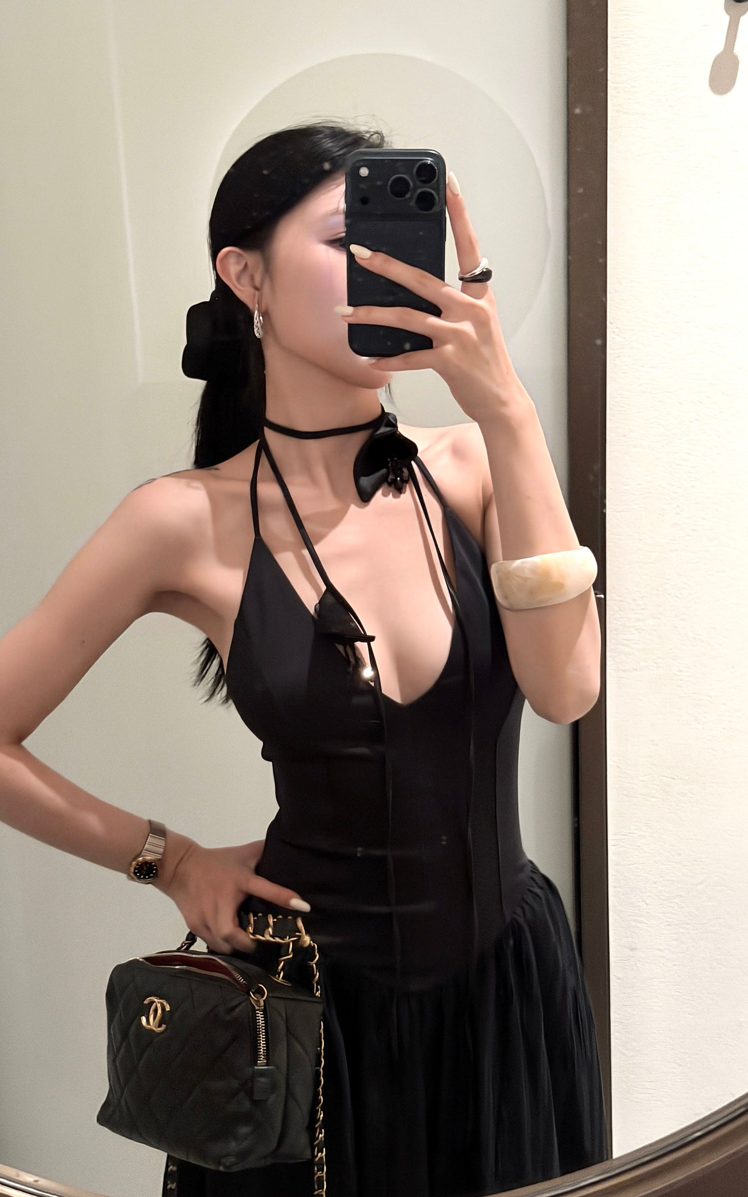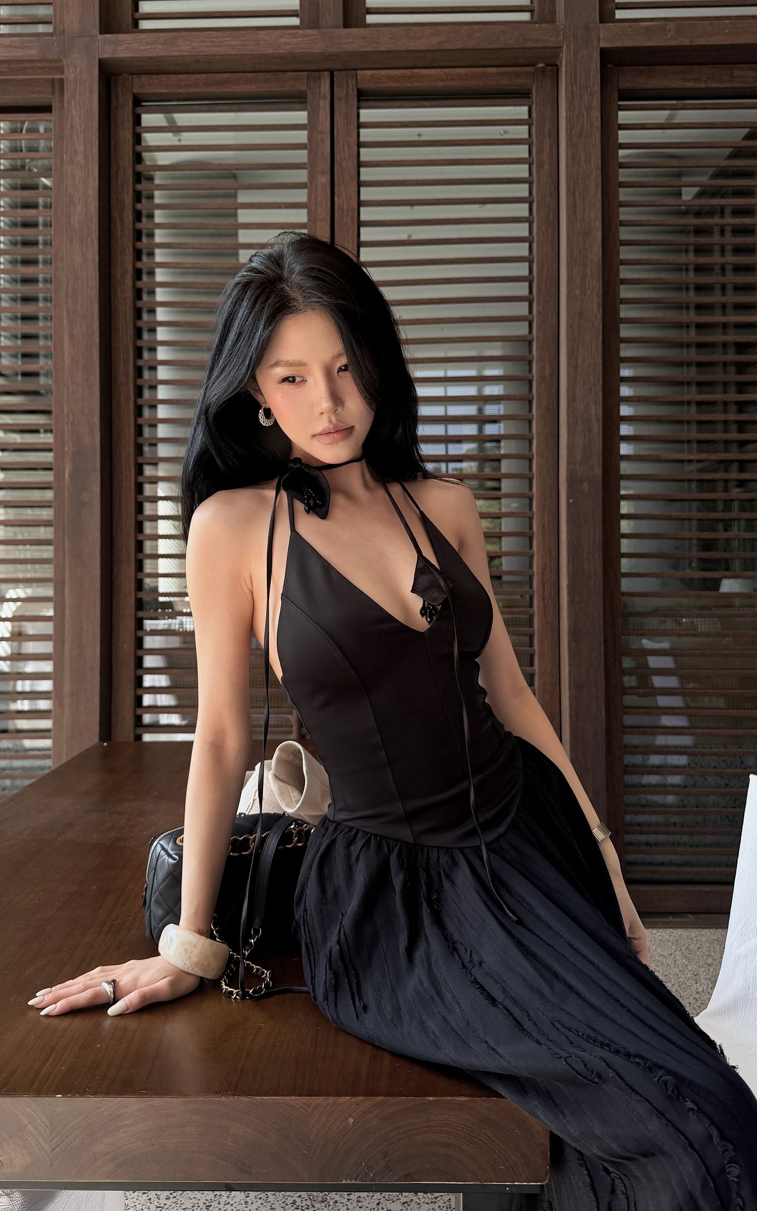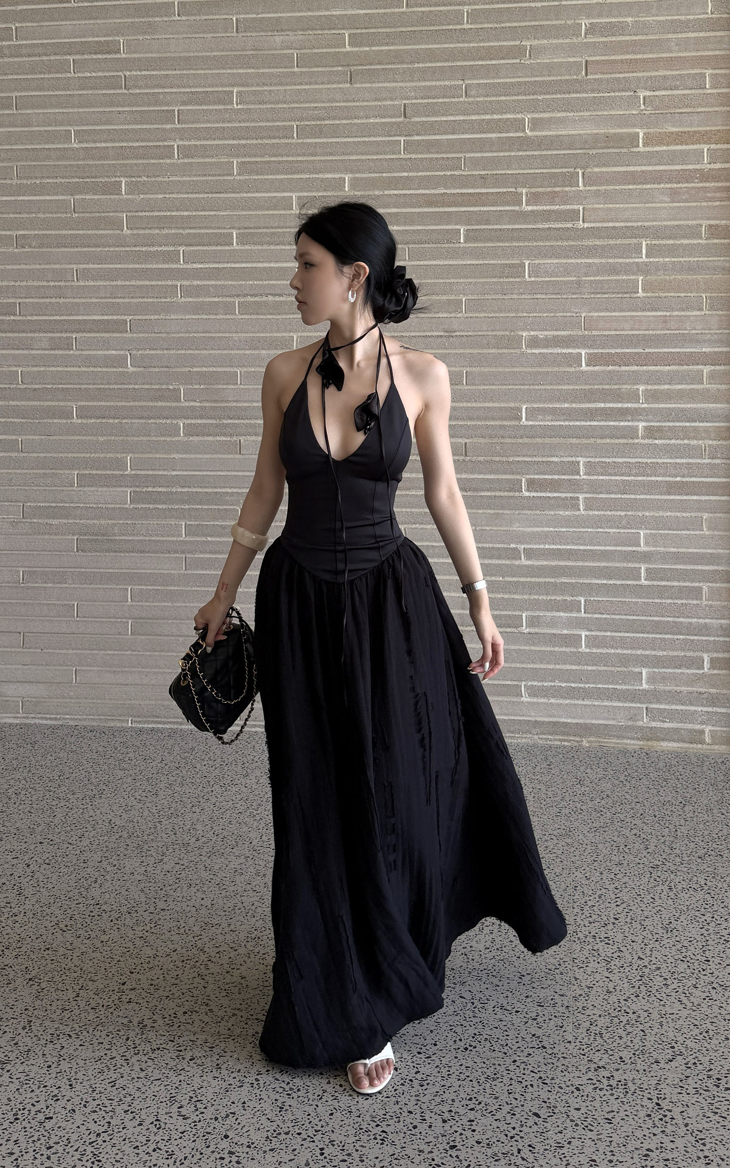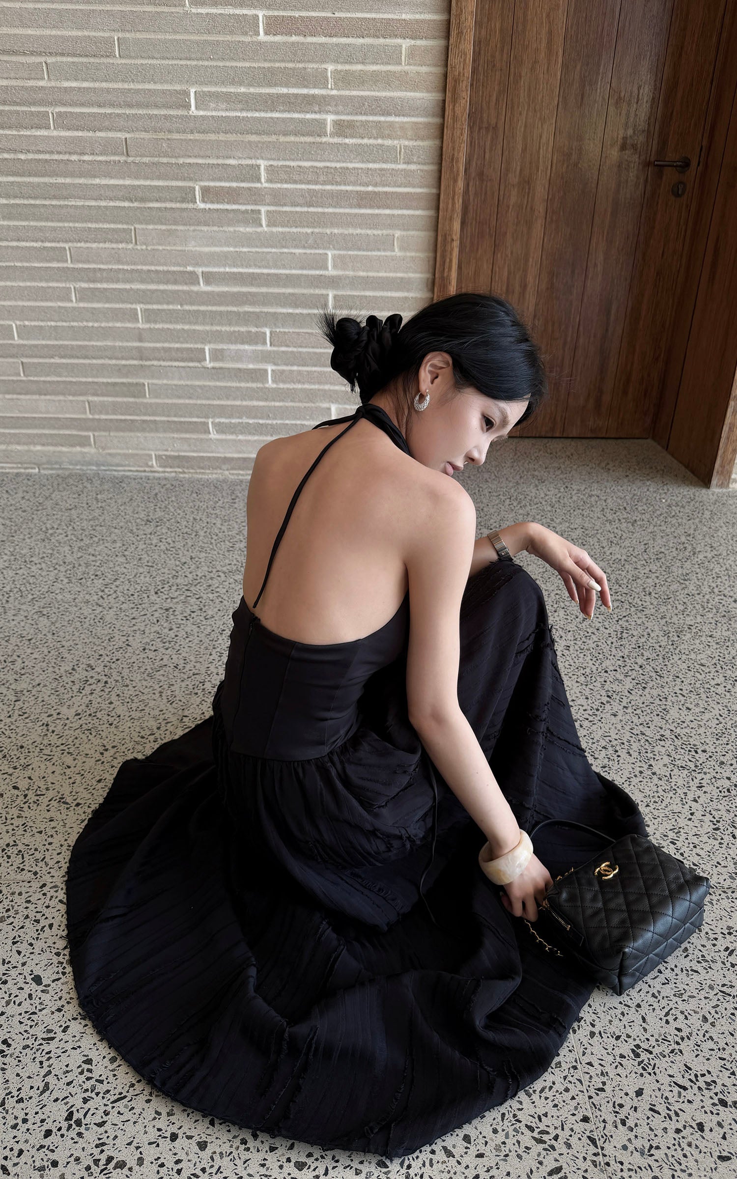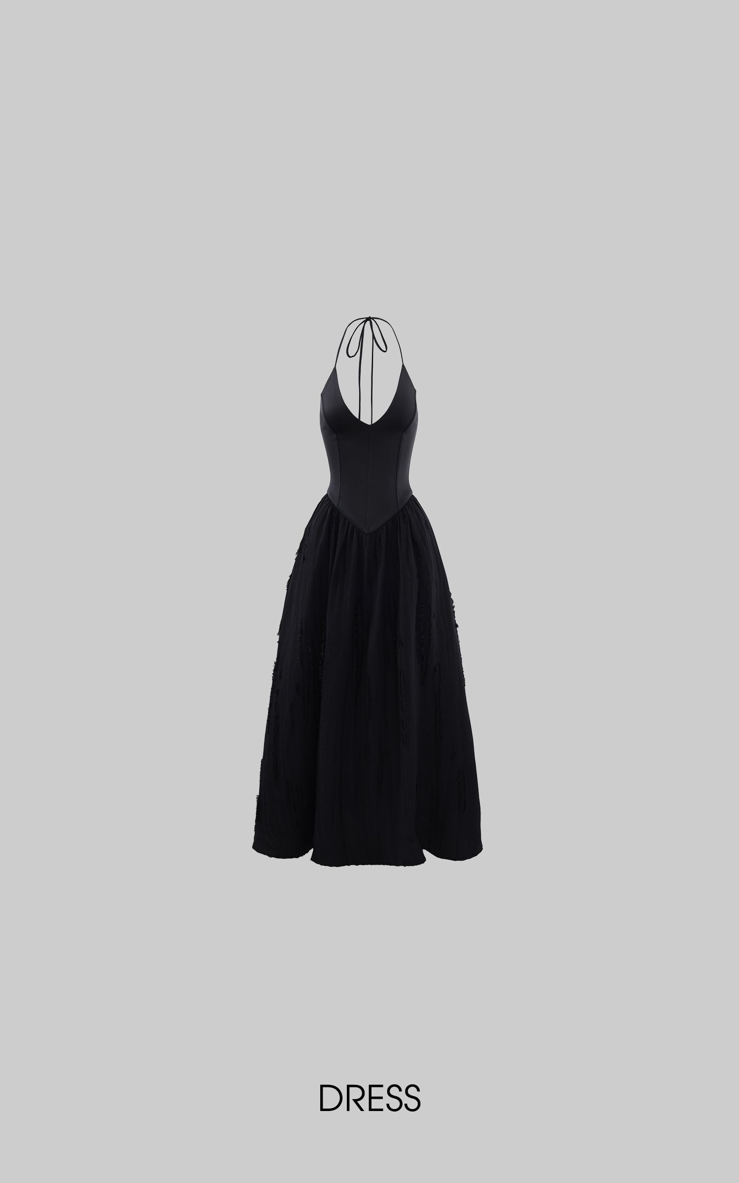 Hydrae Robe longue à col licou, dos nu, corsage ajusté, jupe fluide texturée
