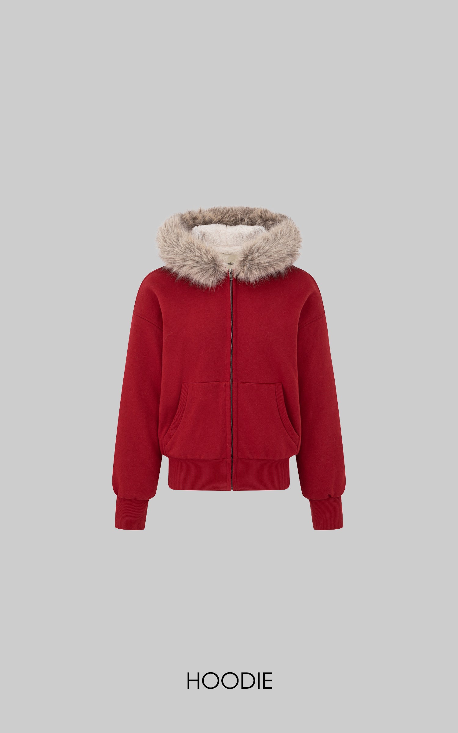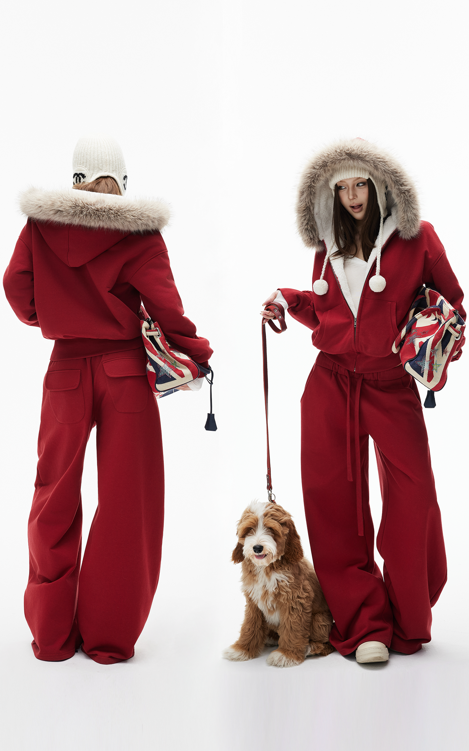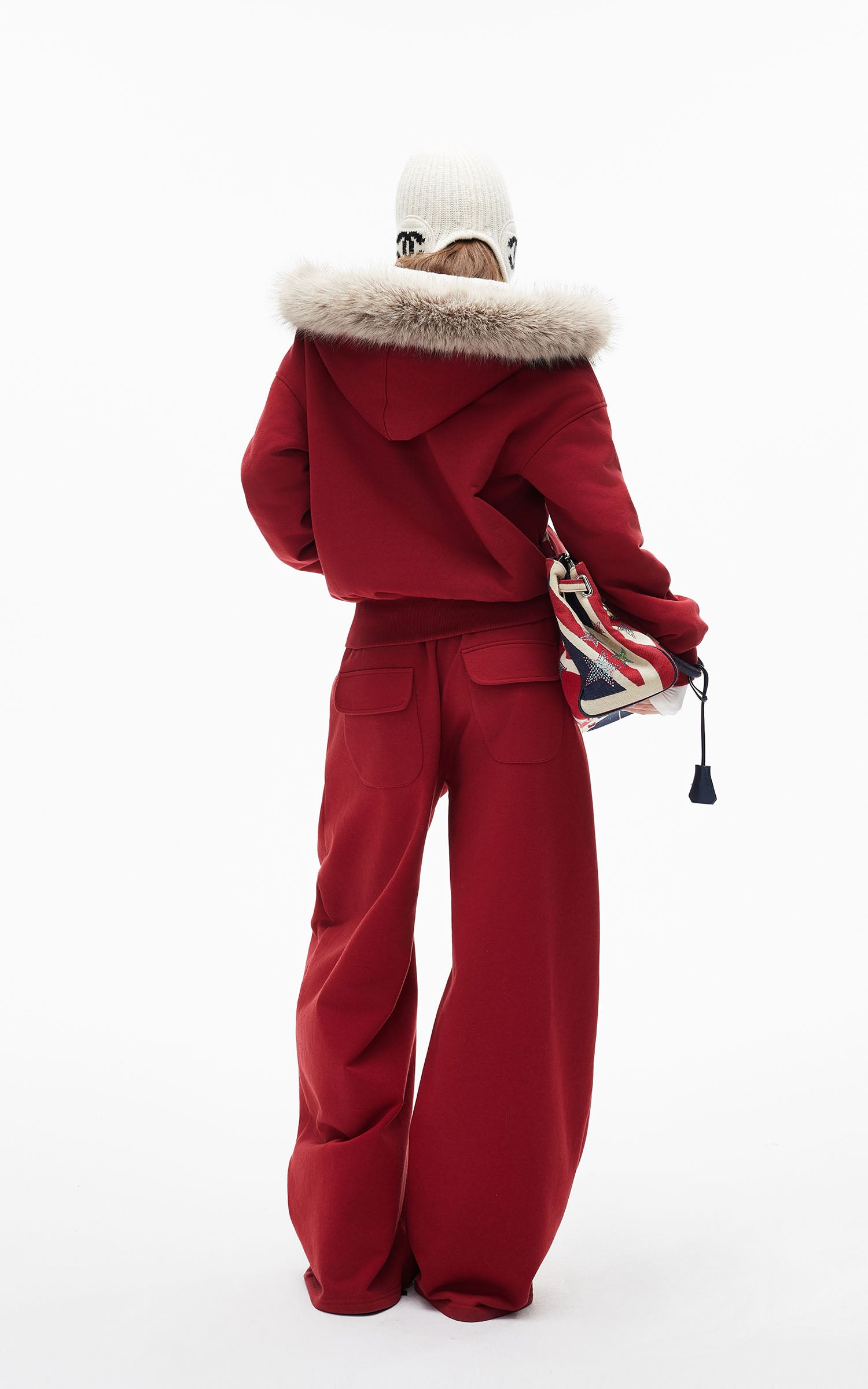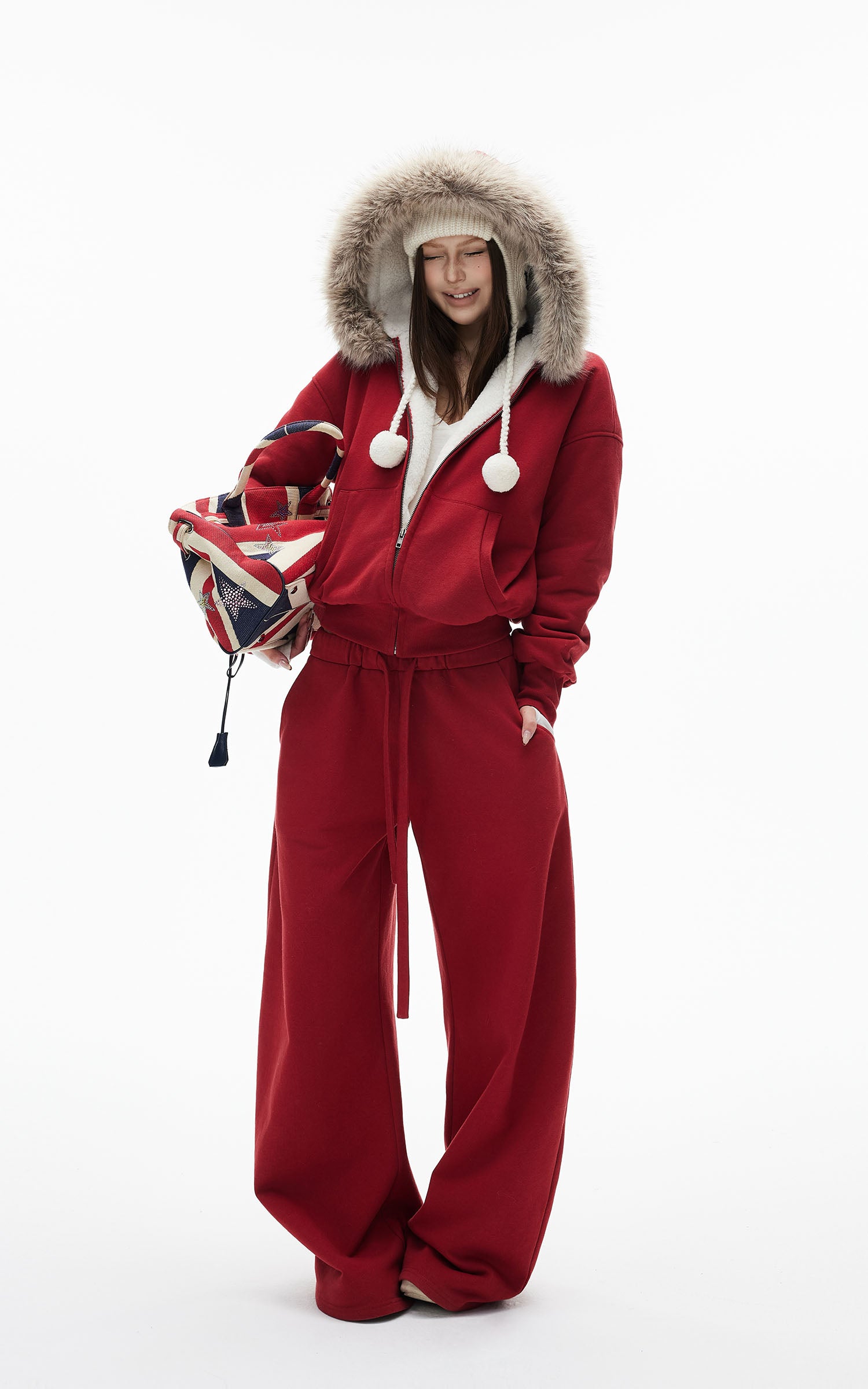 IAMXIAA フェイクファー付きフリースフーディーとワイドレッグスウェットパンツセット
