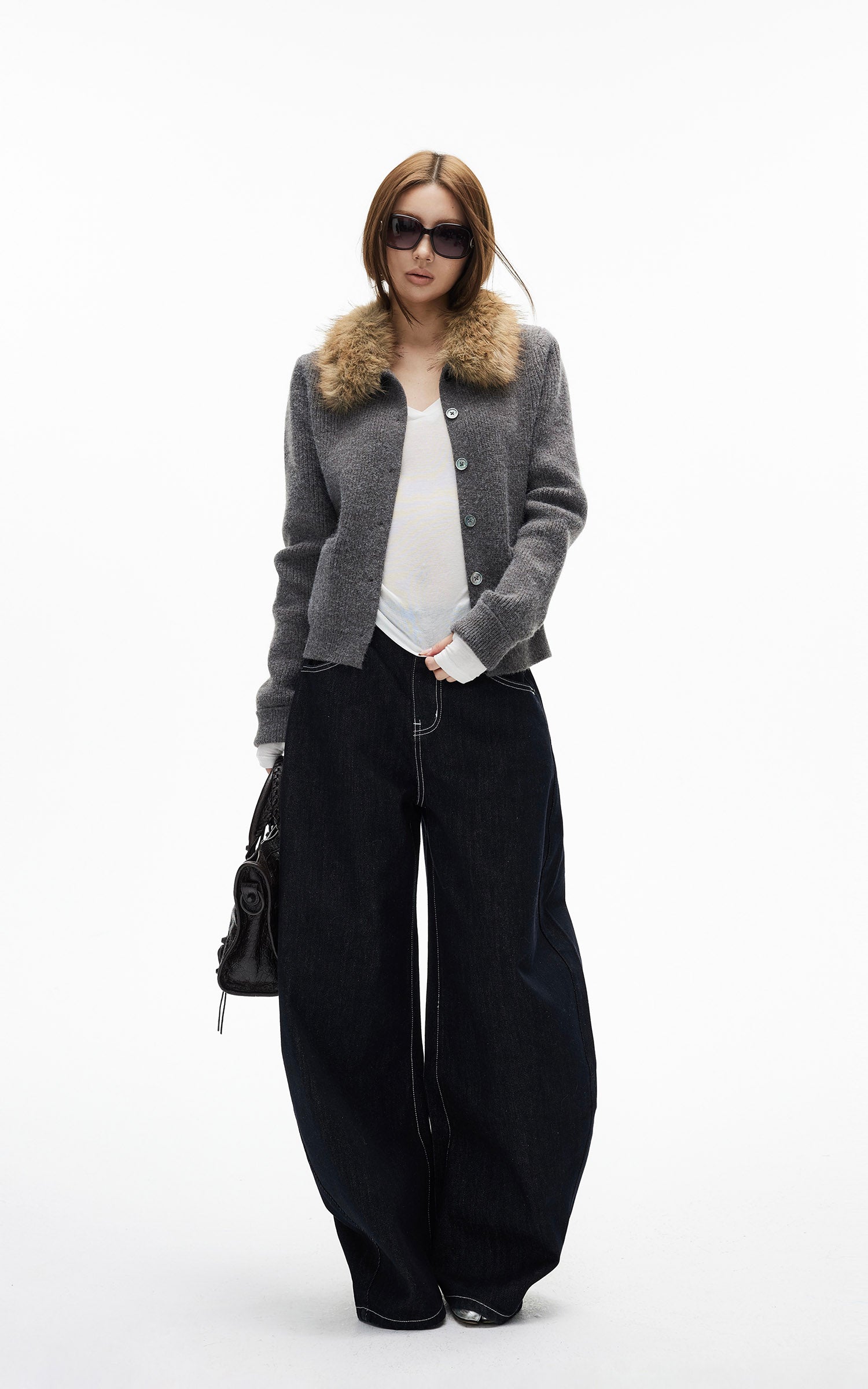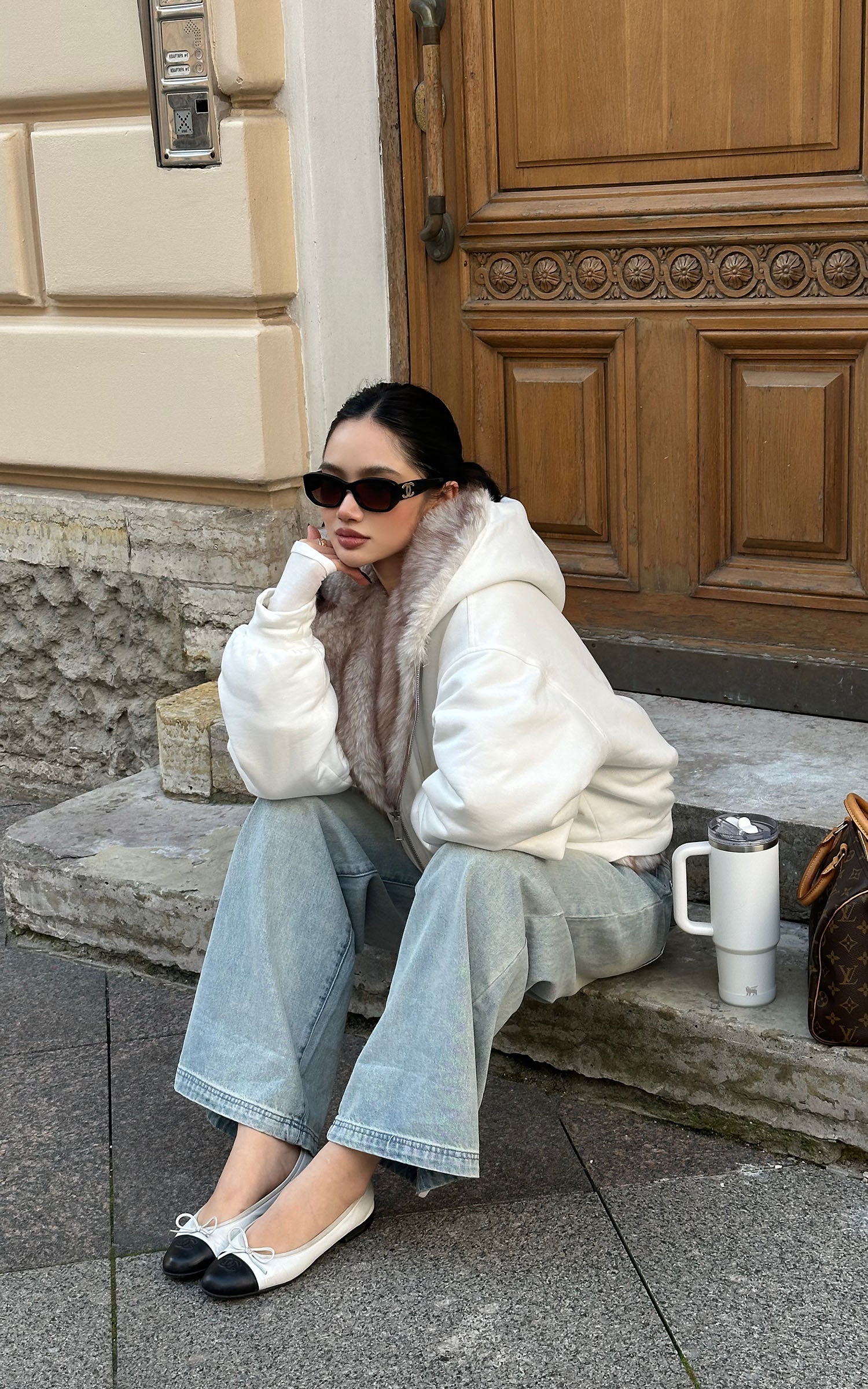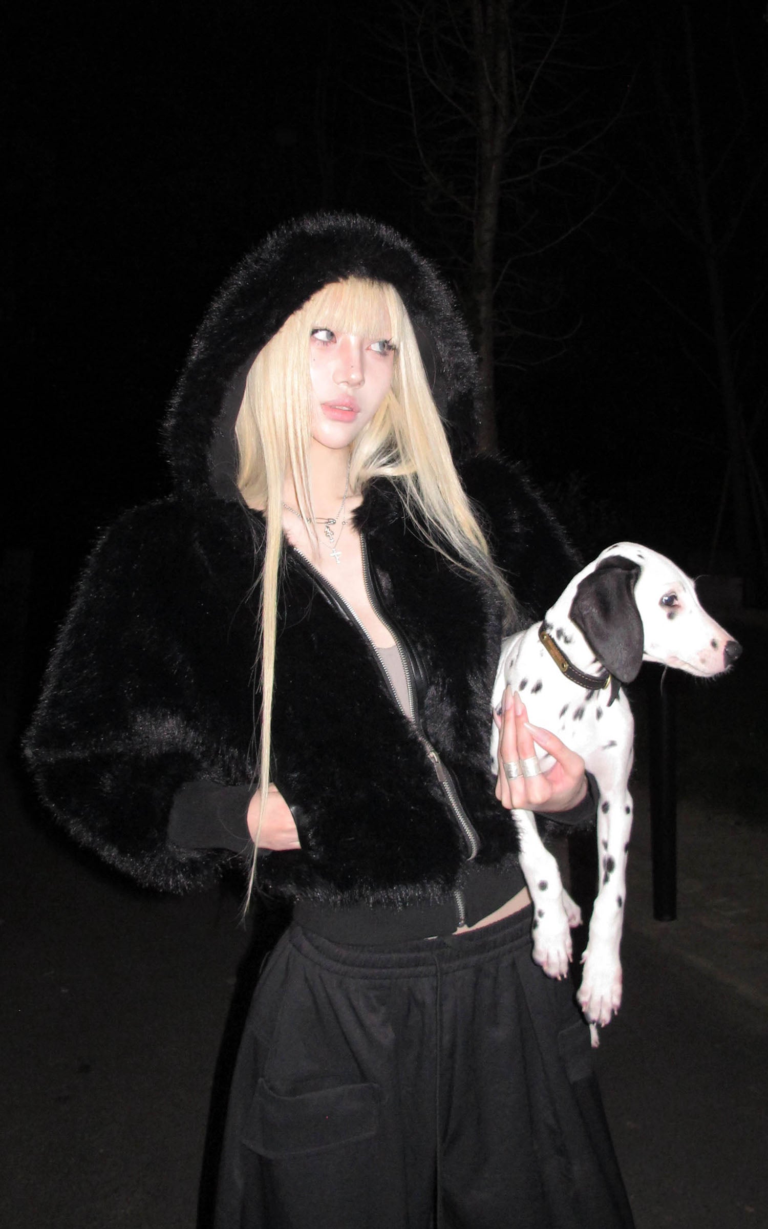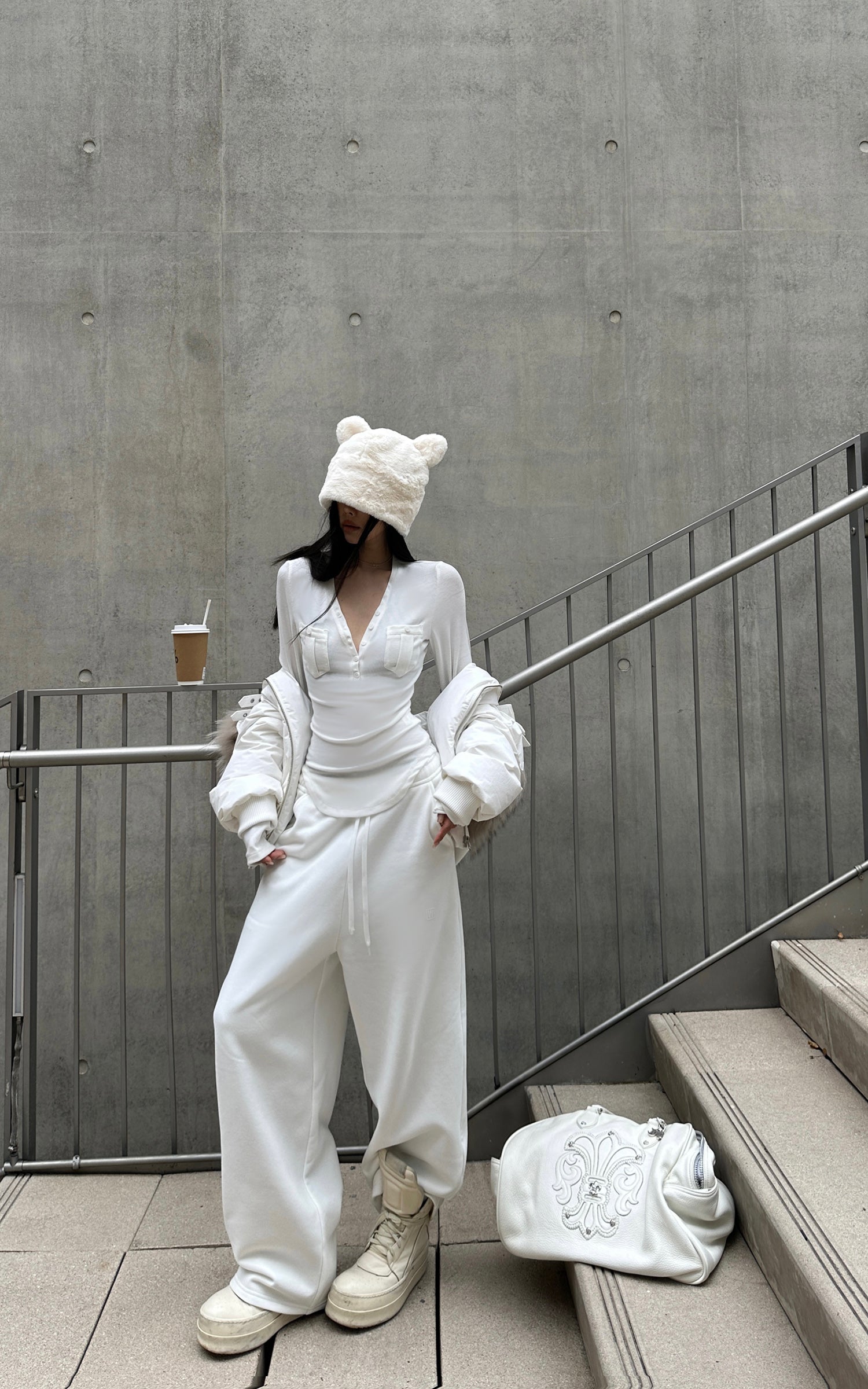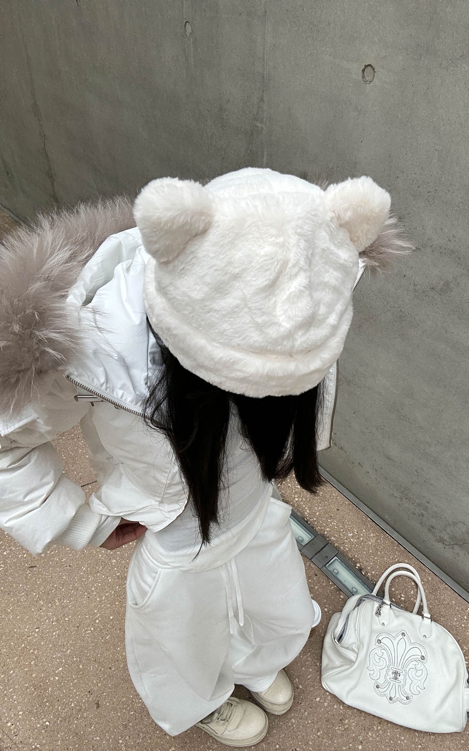 IAMXIAA フェイクファー付きフリースフーディーとワイドレッグスウェットパンツセット