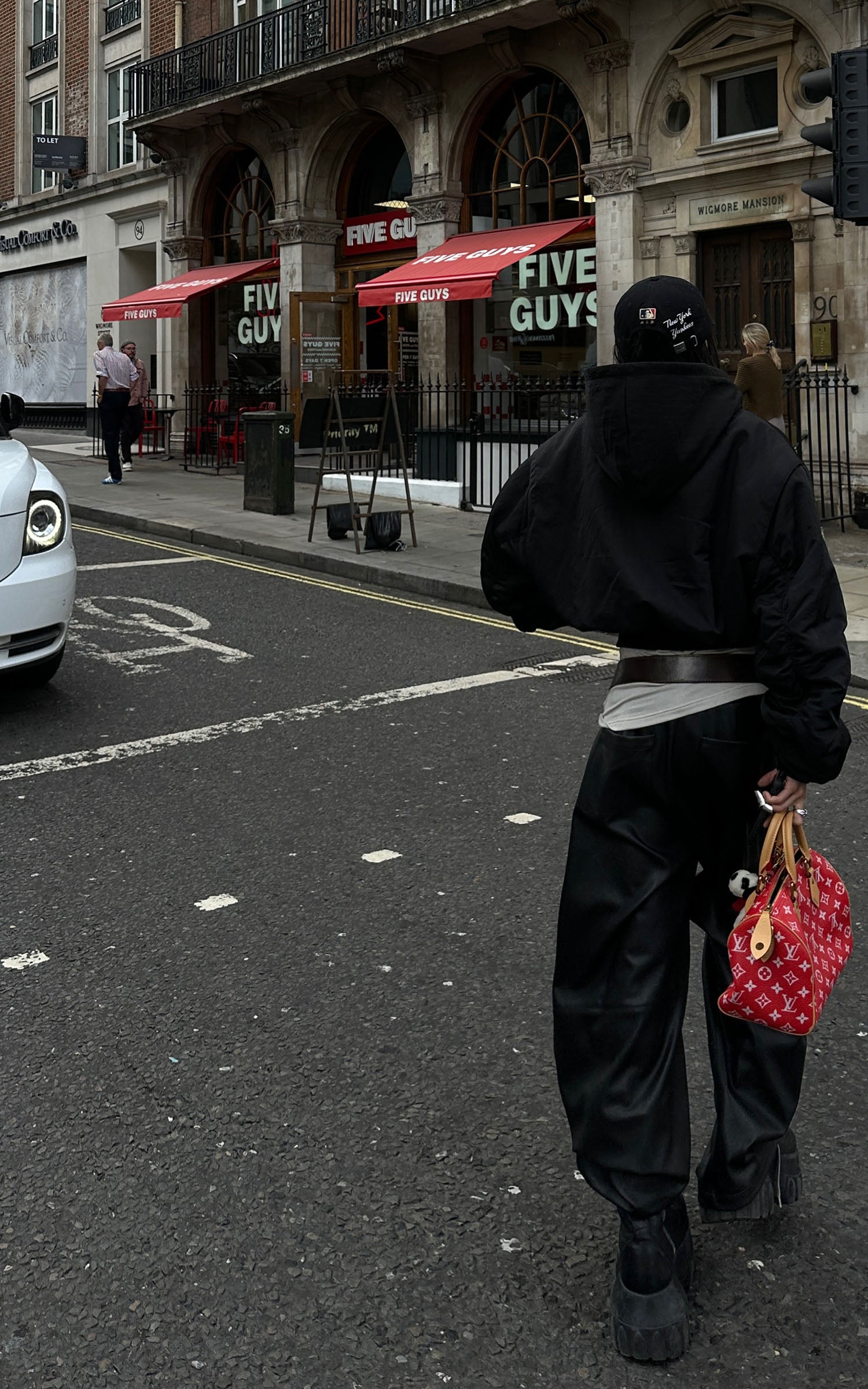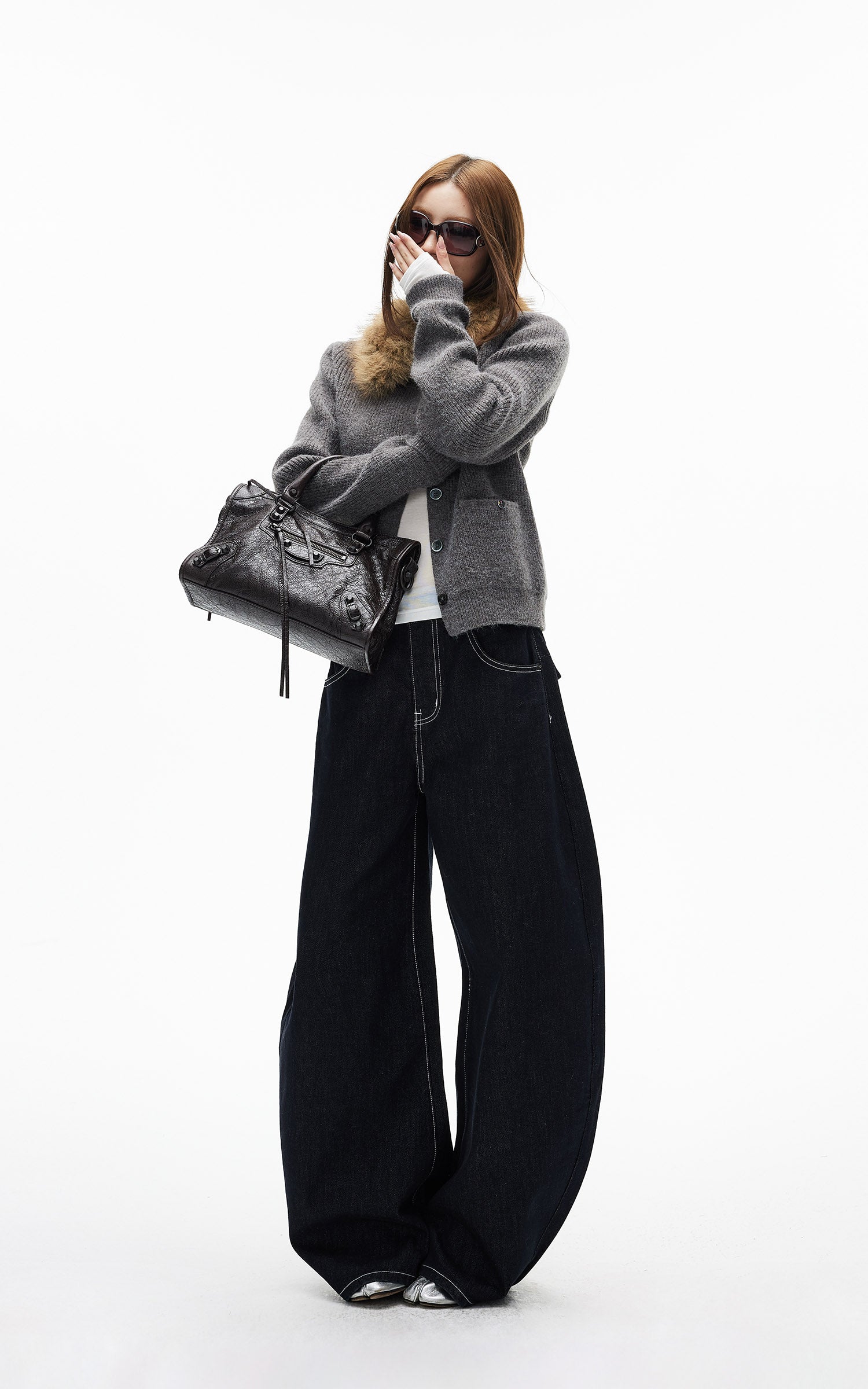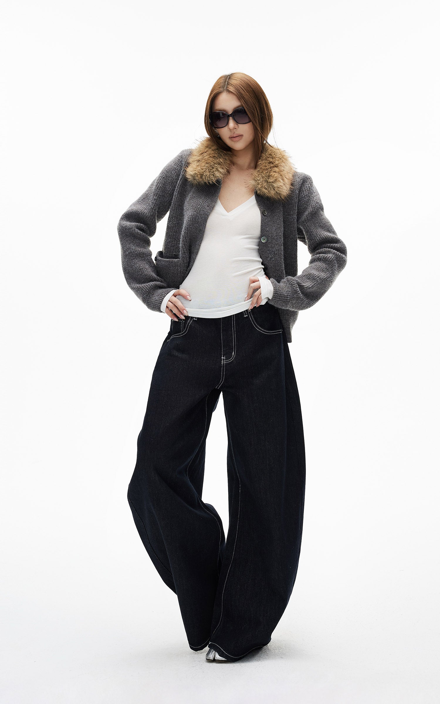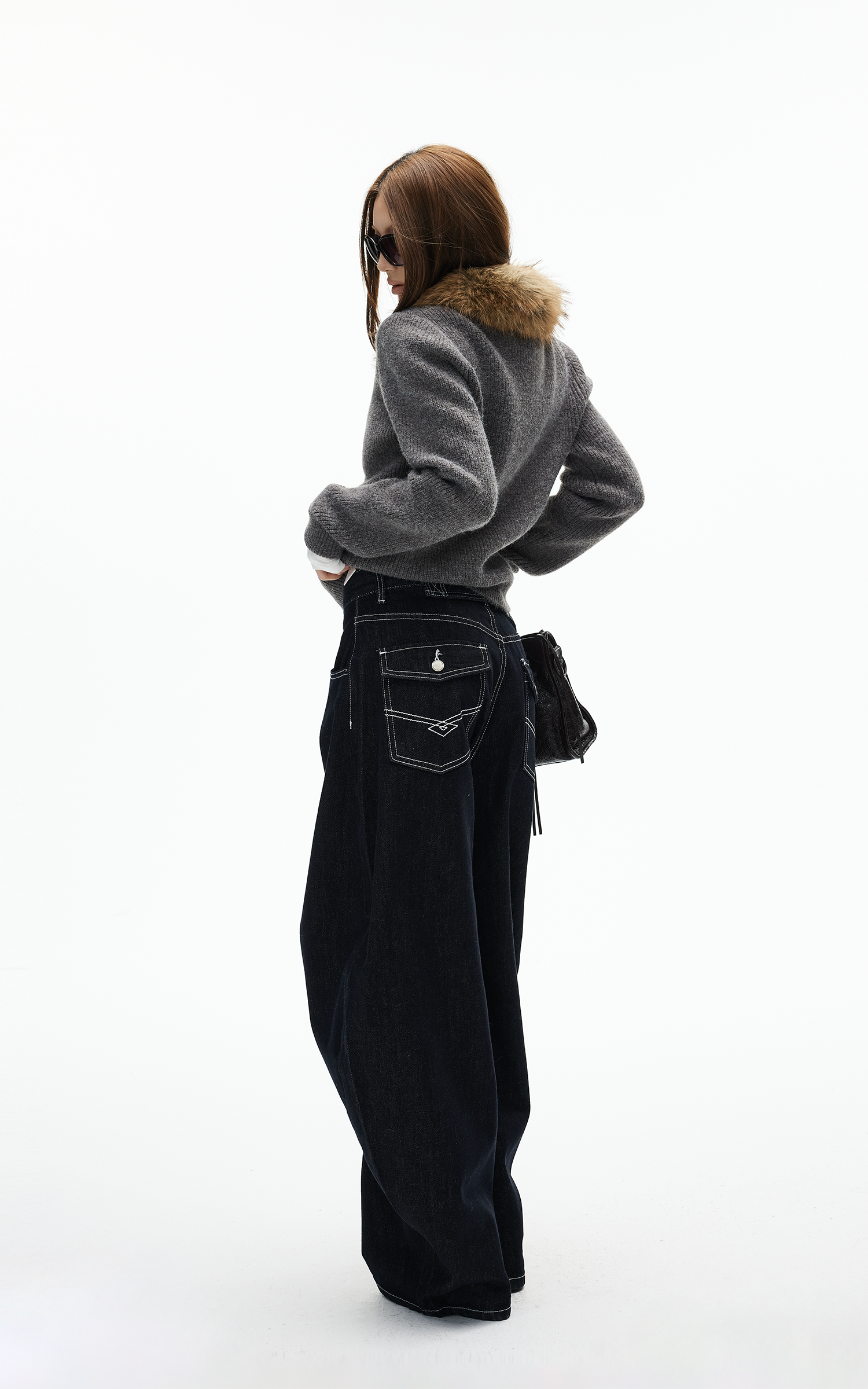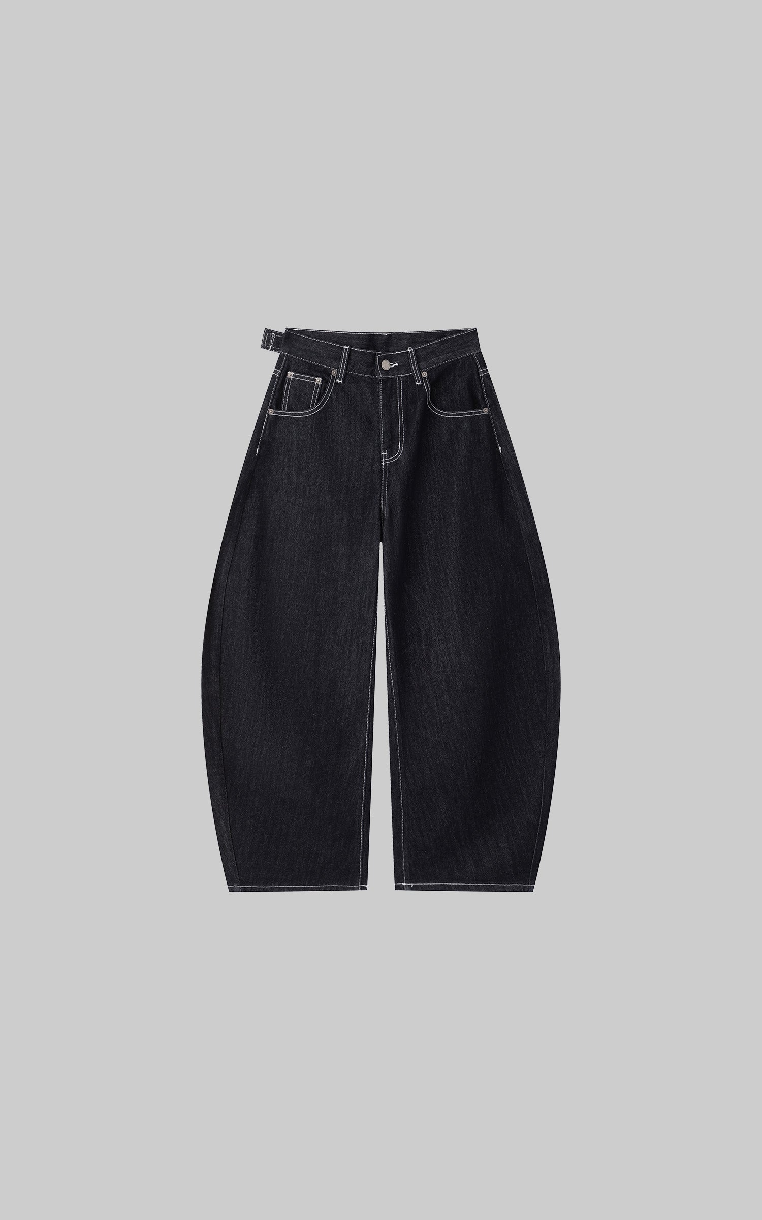 IAMXIAA ダブルバックポケット付きコントラストステッチワイドレッグデニムジーンズ