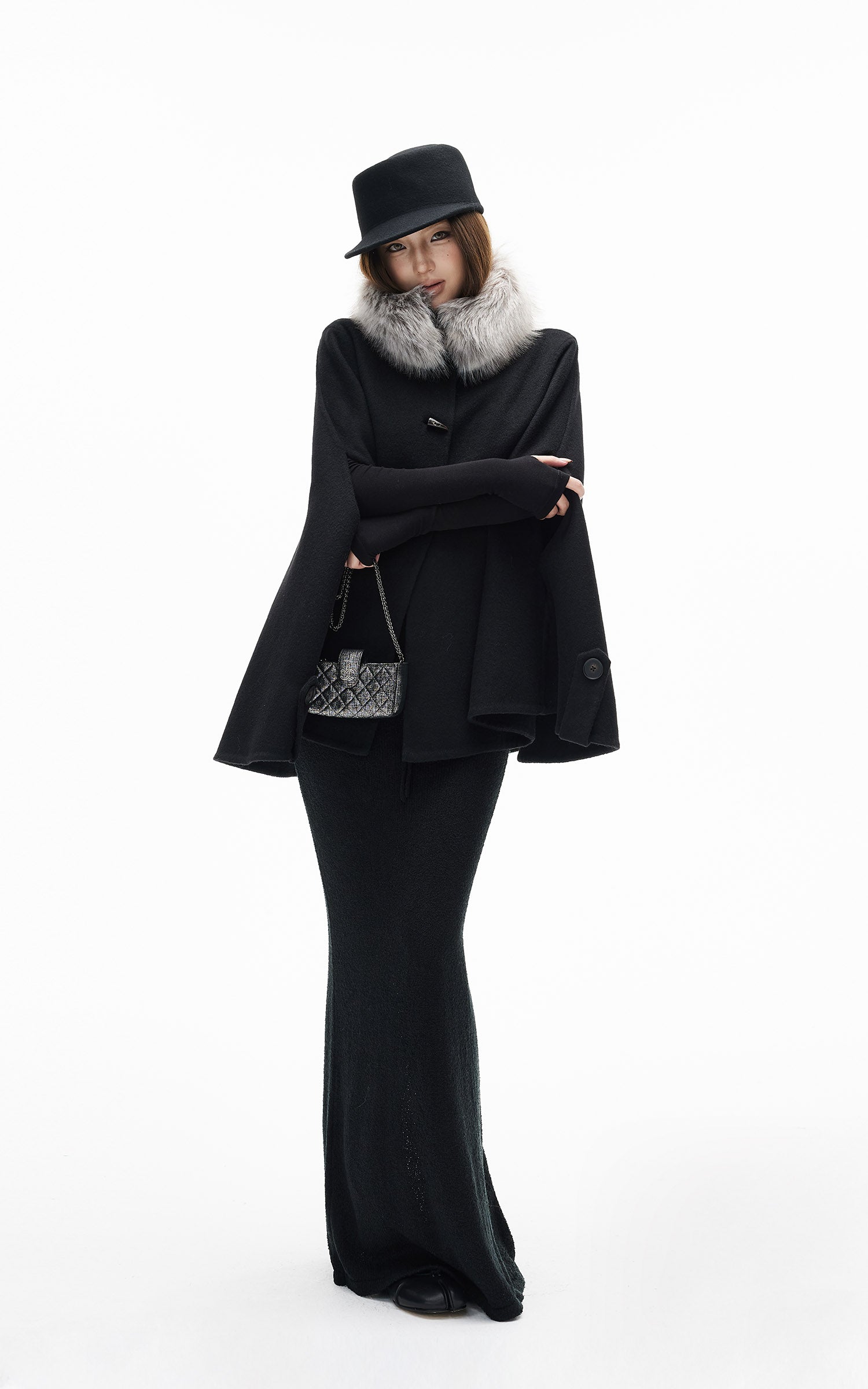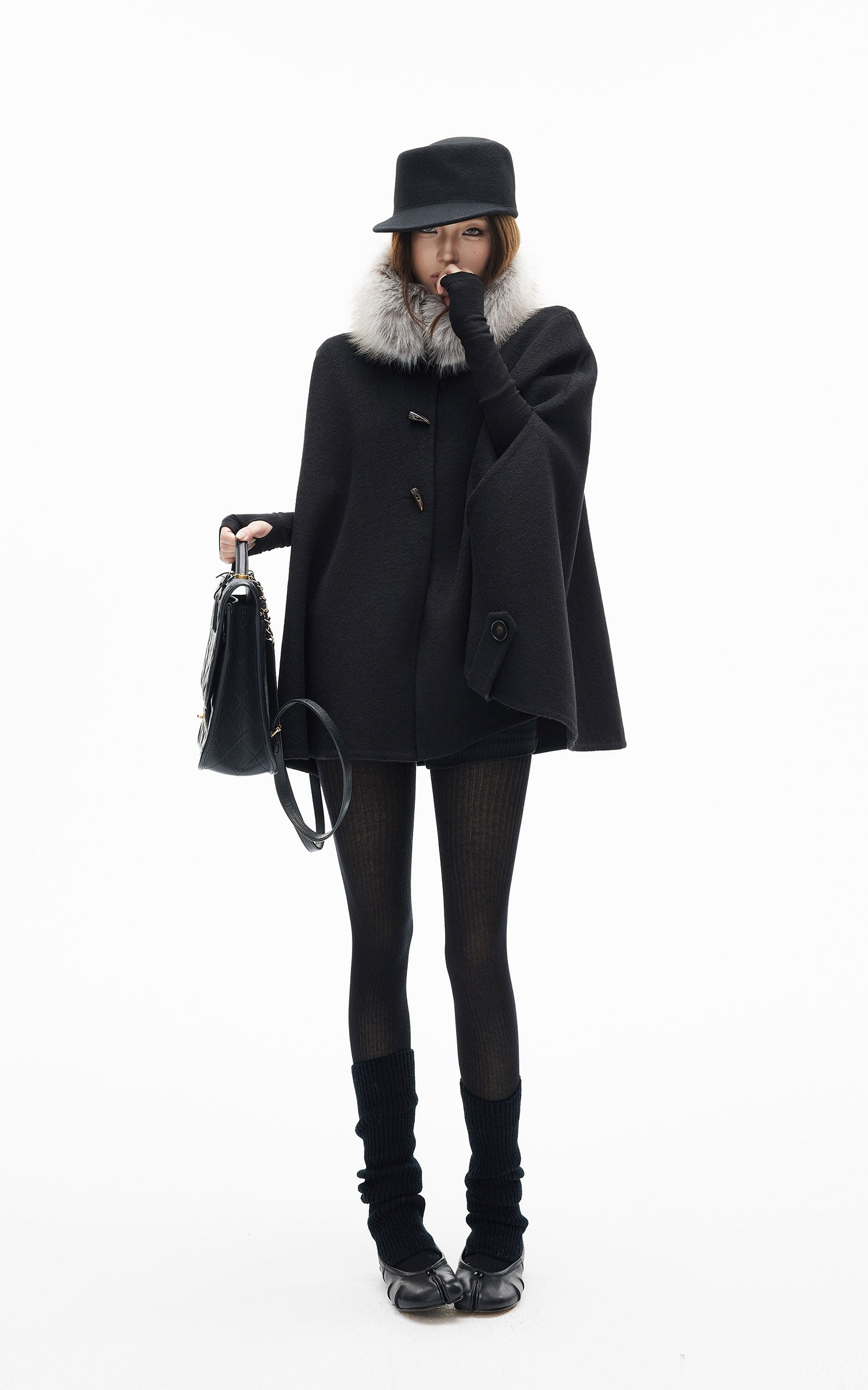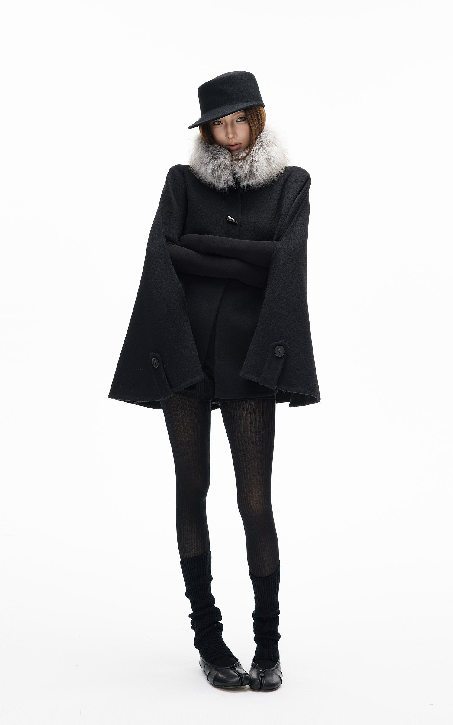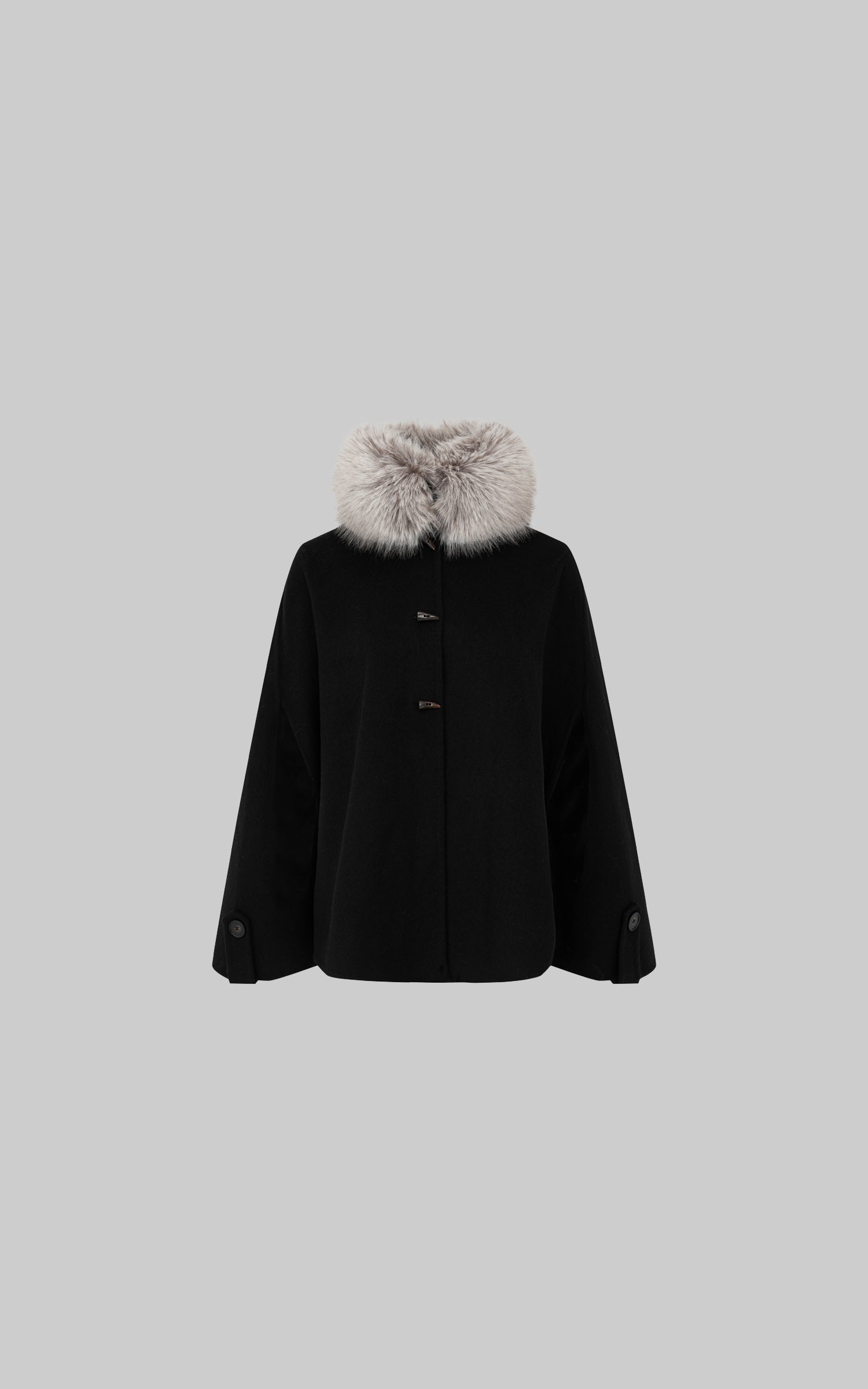 IAMXIAA フェイクファーの襟とトグルボタン付きウールケープコート