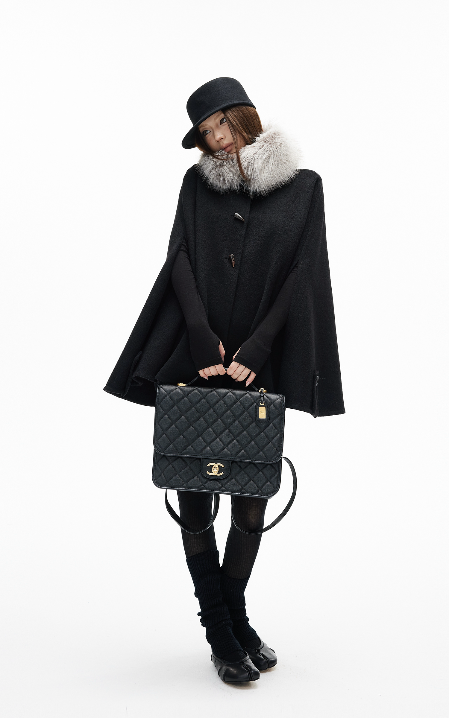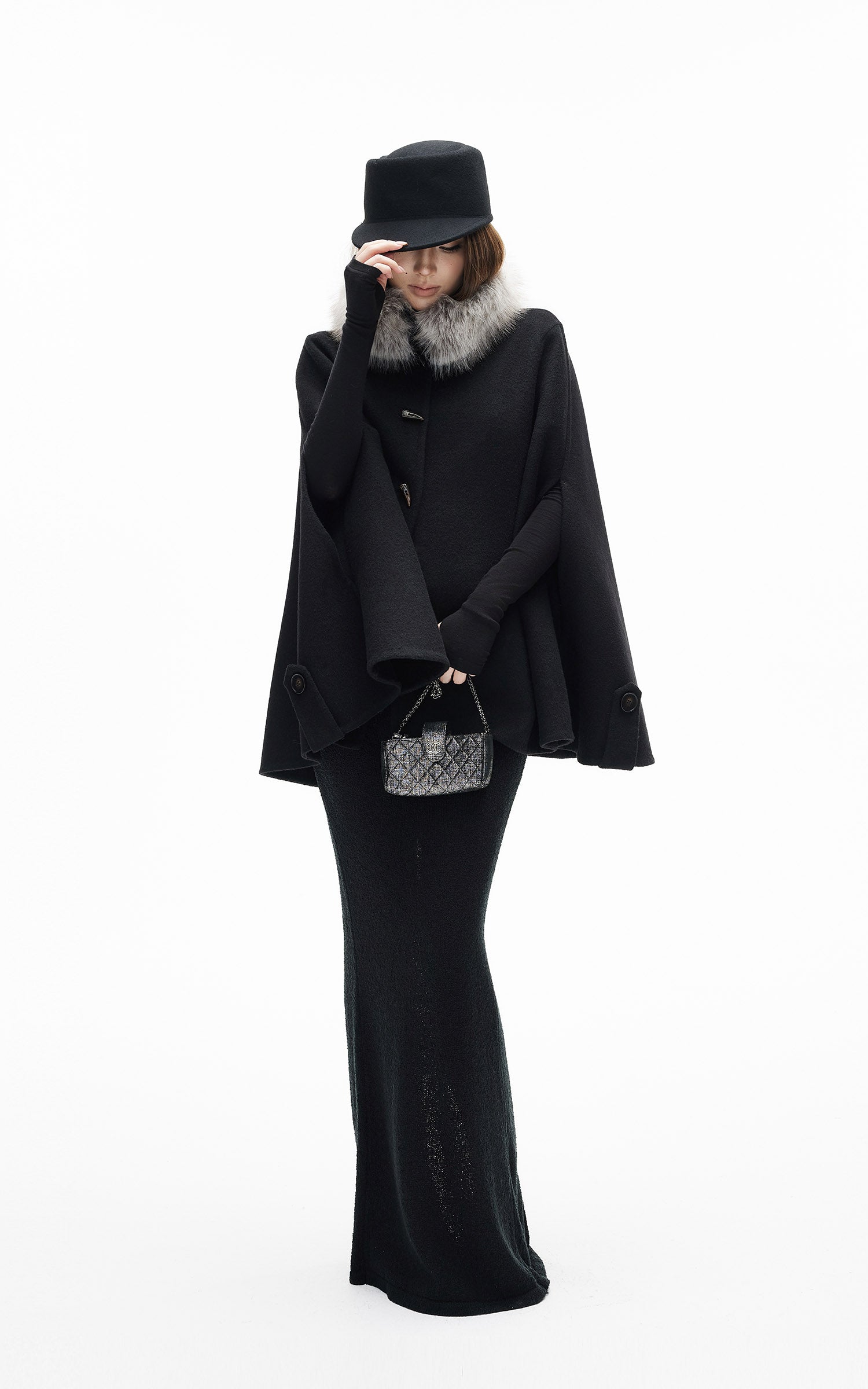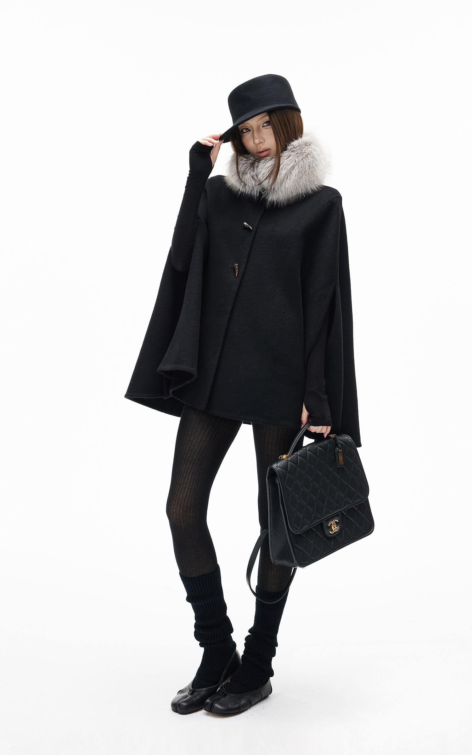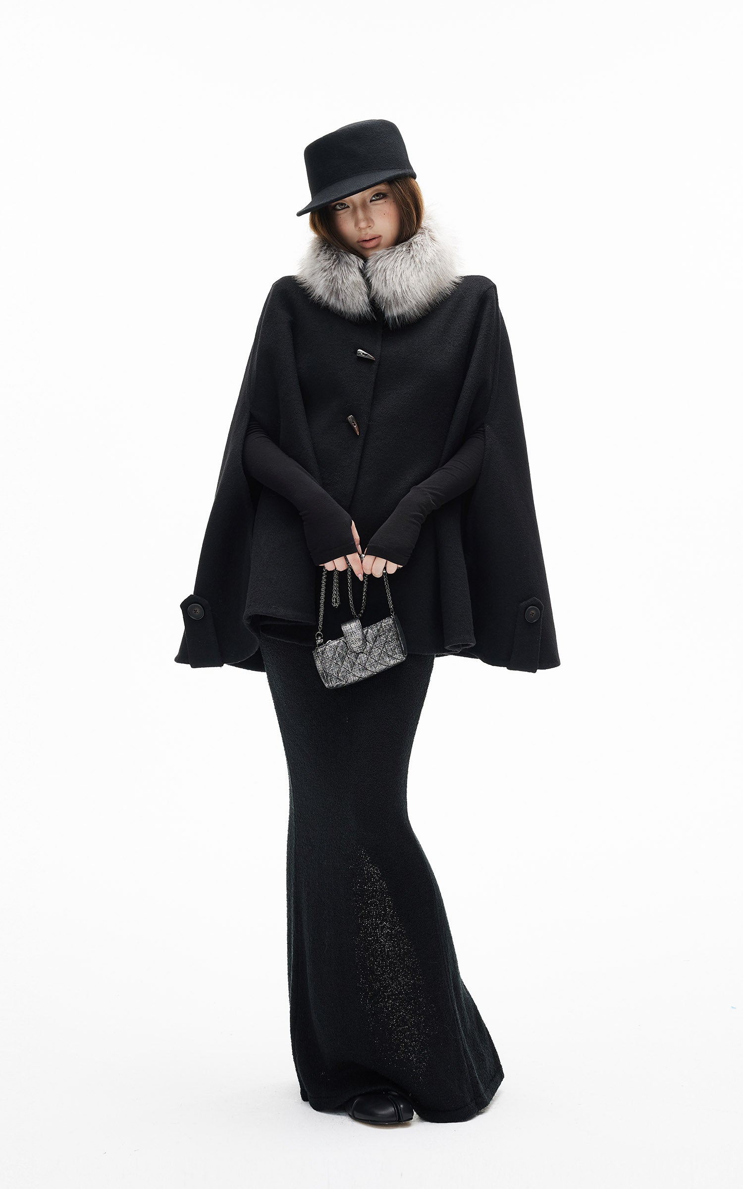IAMXIAA フェイクファーの襟とトグルボタン付きウールケープコート