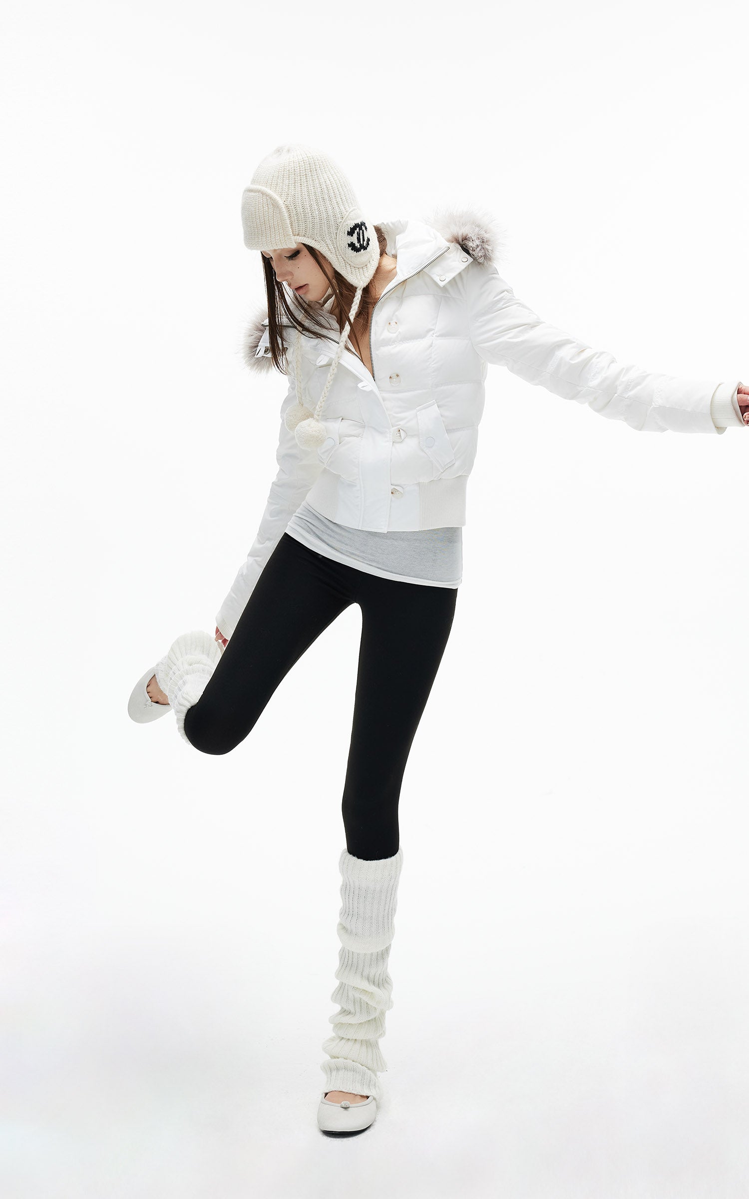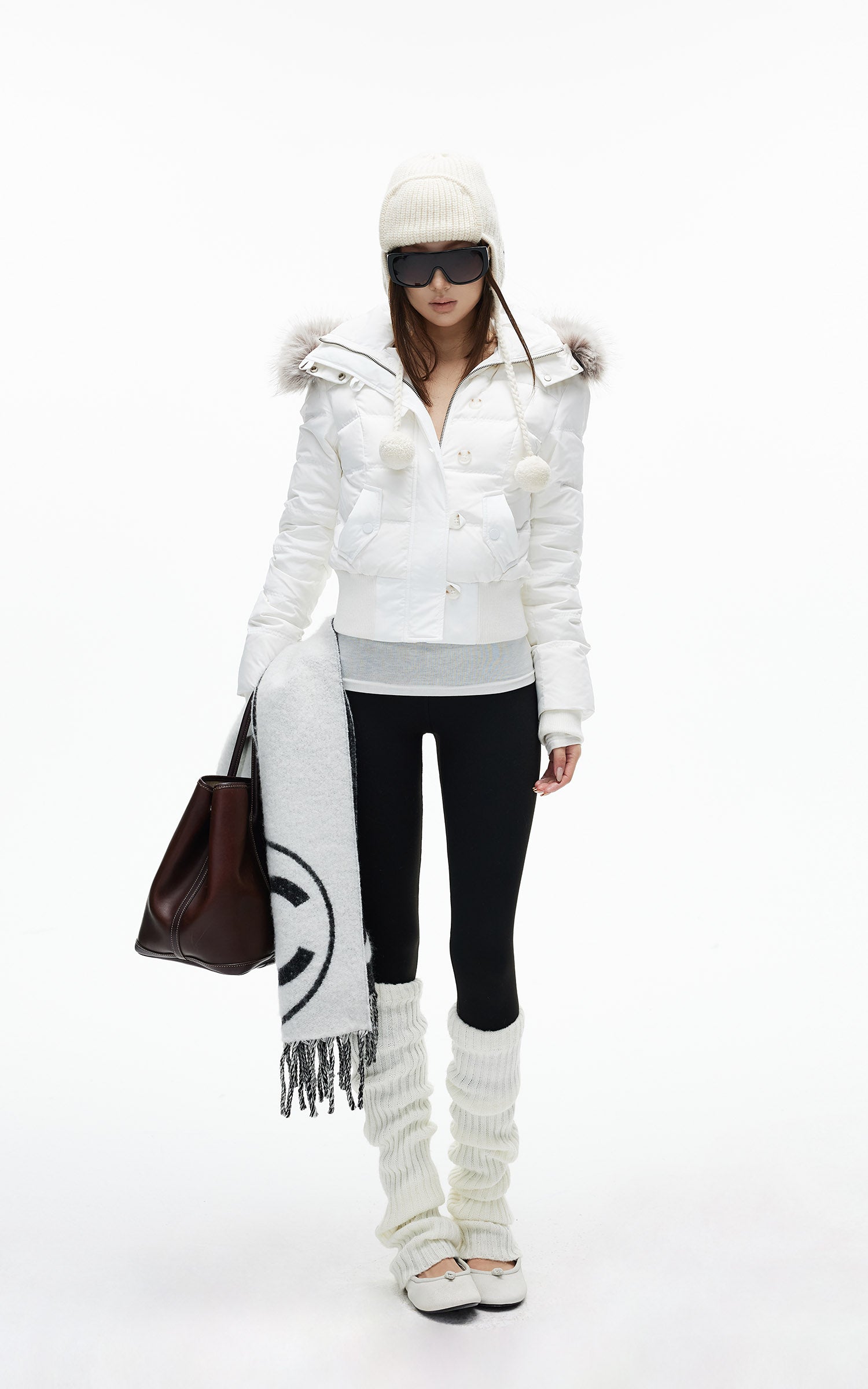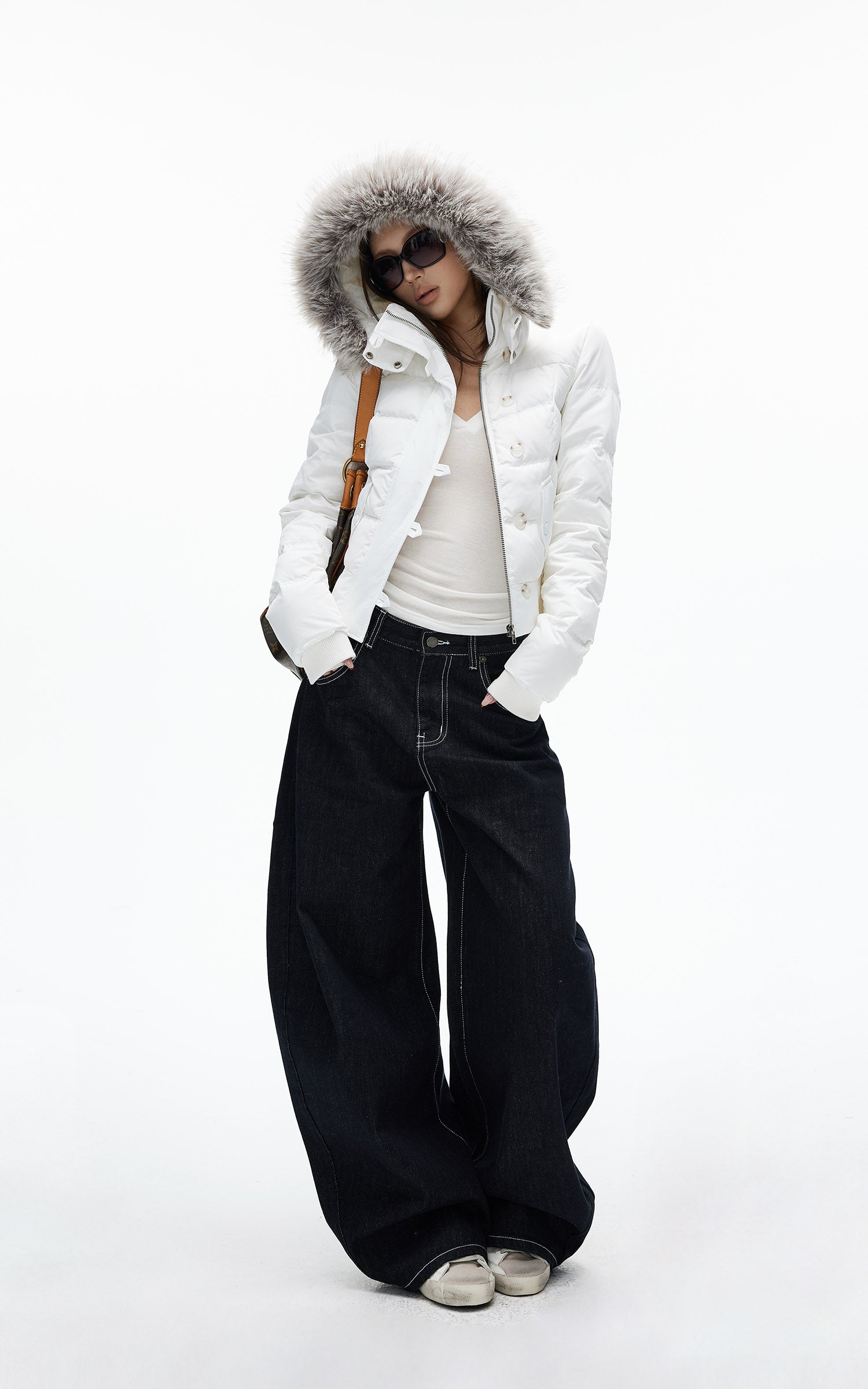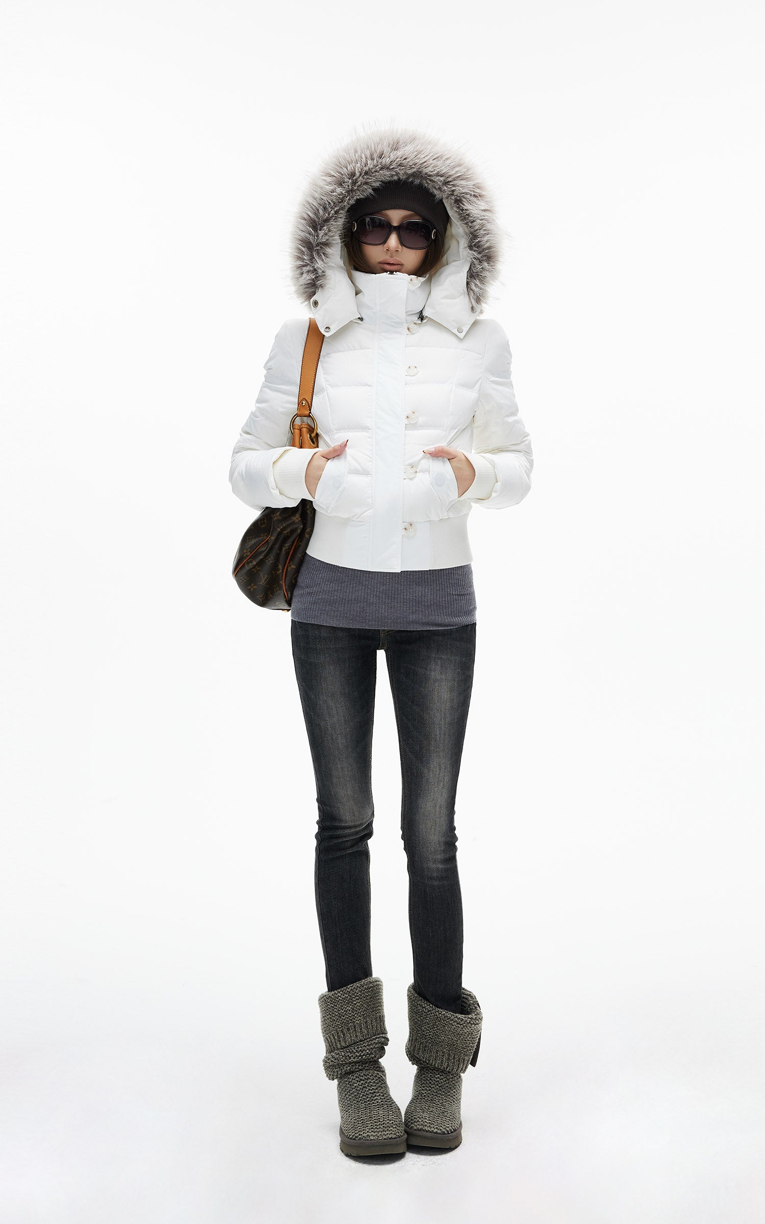 IAMXIAA フェイクファーのフードとボタンディテール付きのクロップドパファージャケット