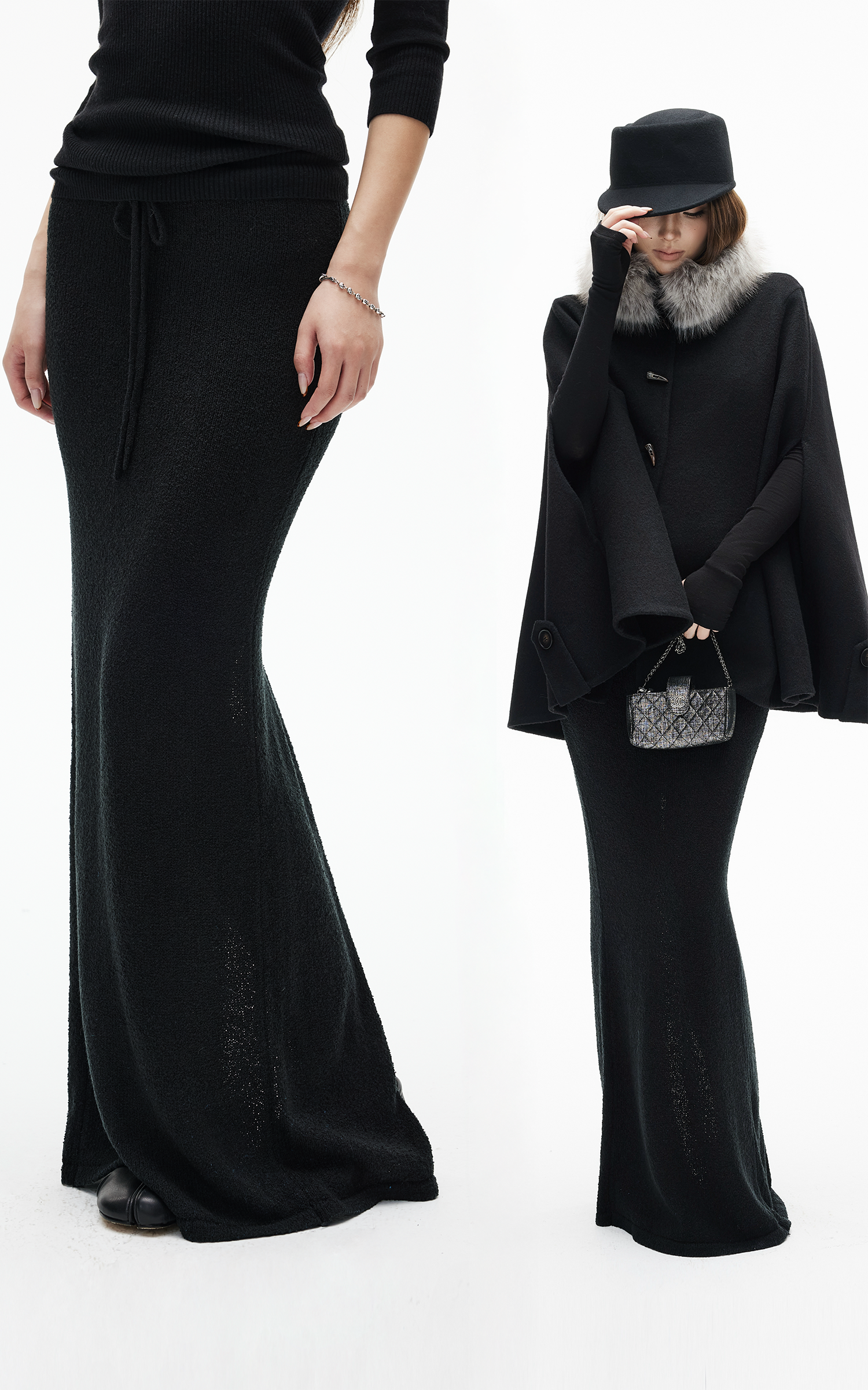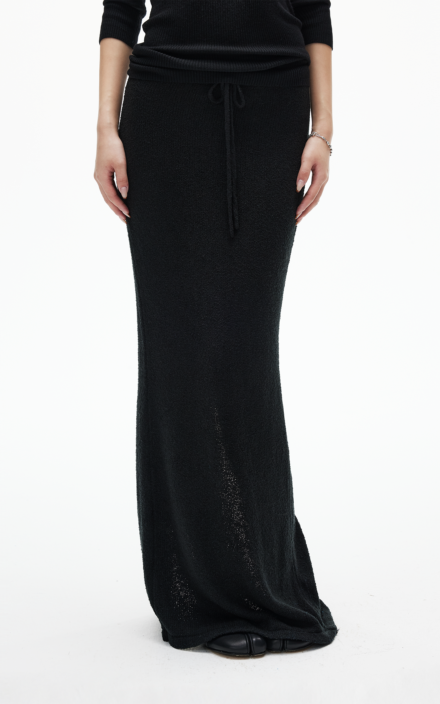IAMXIAA ドローストリングウエストとバックスリット付きニットマキシスカート