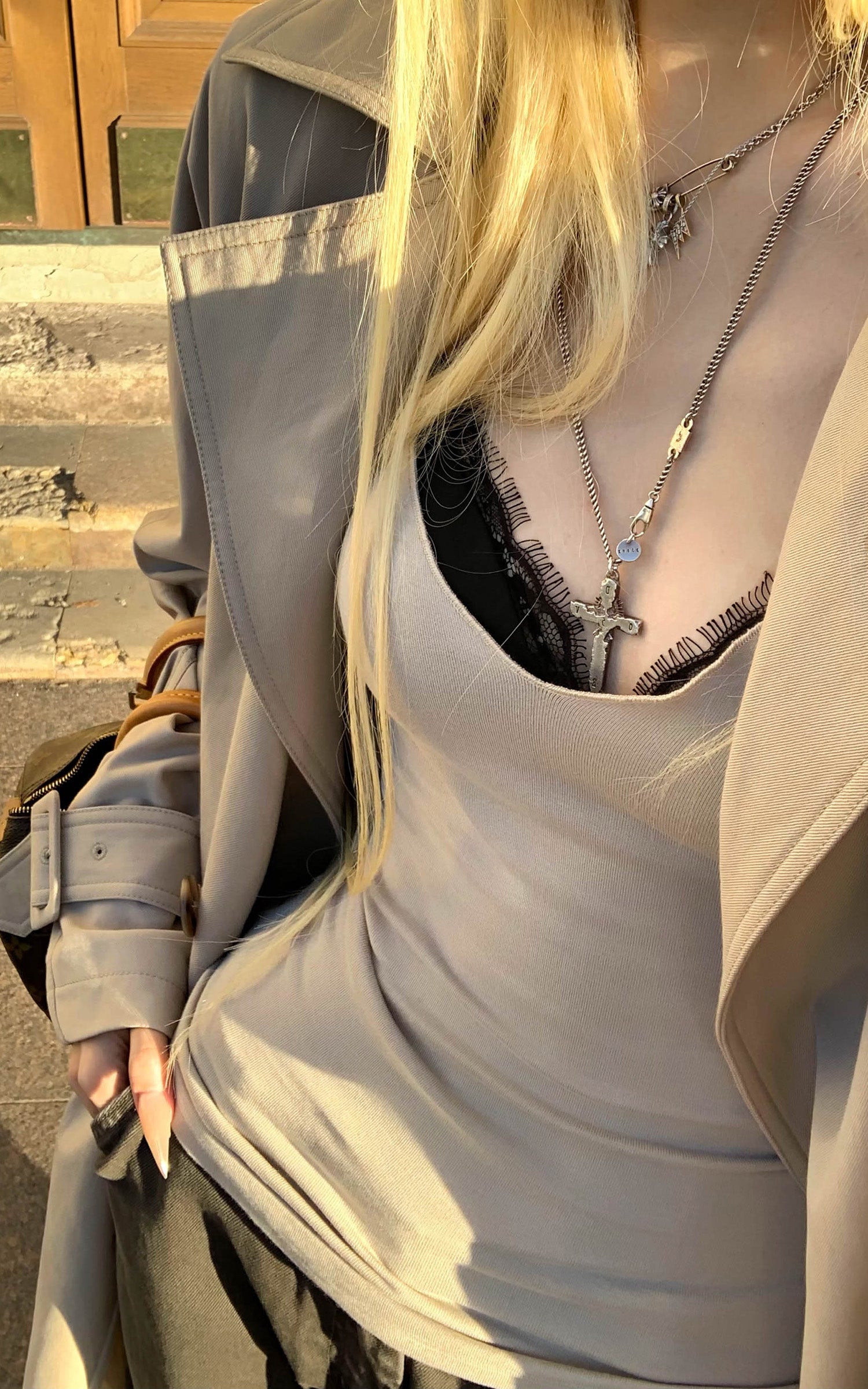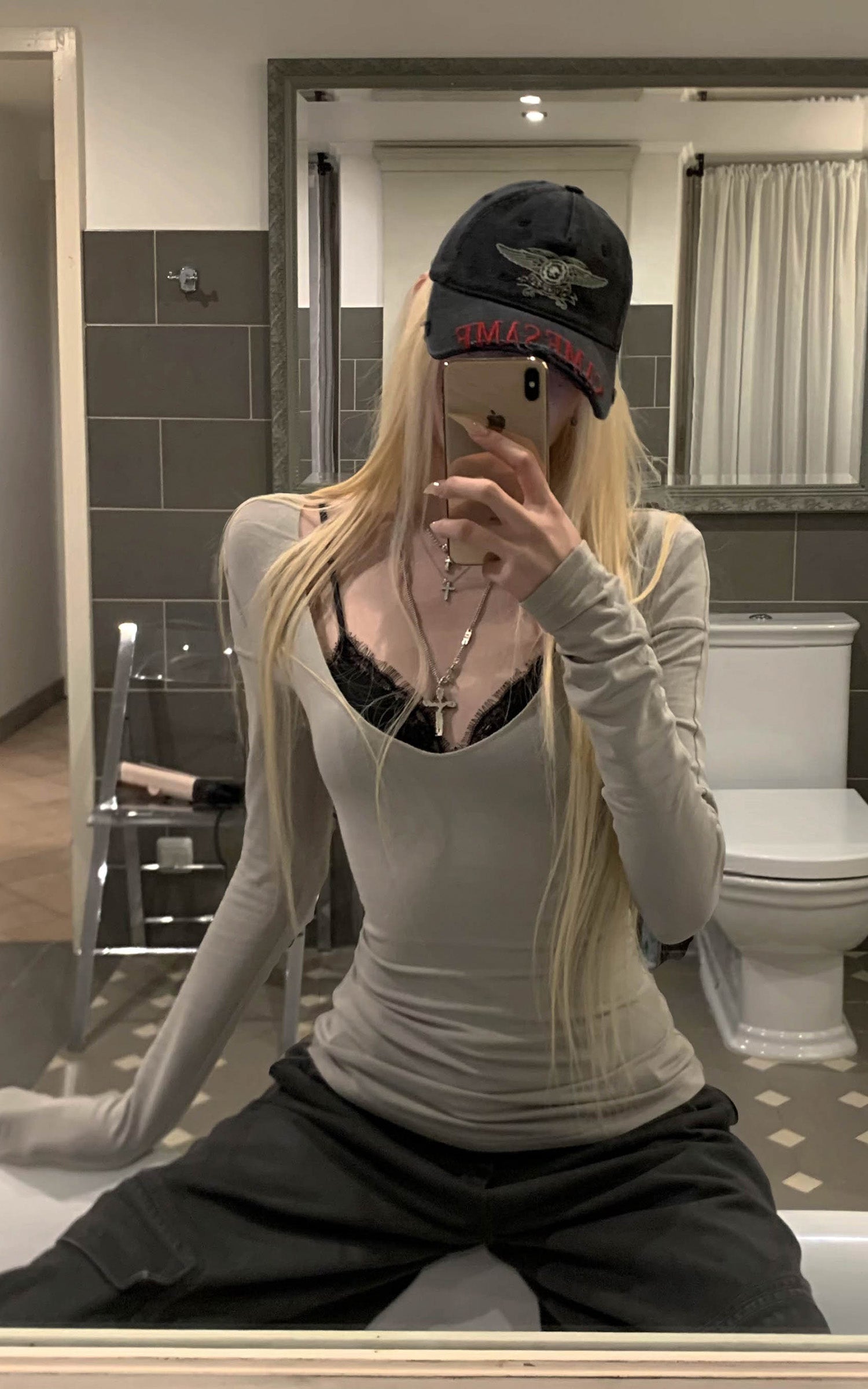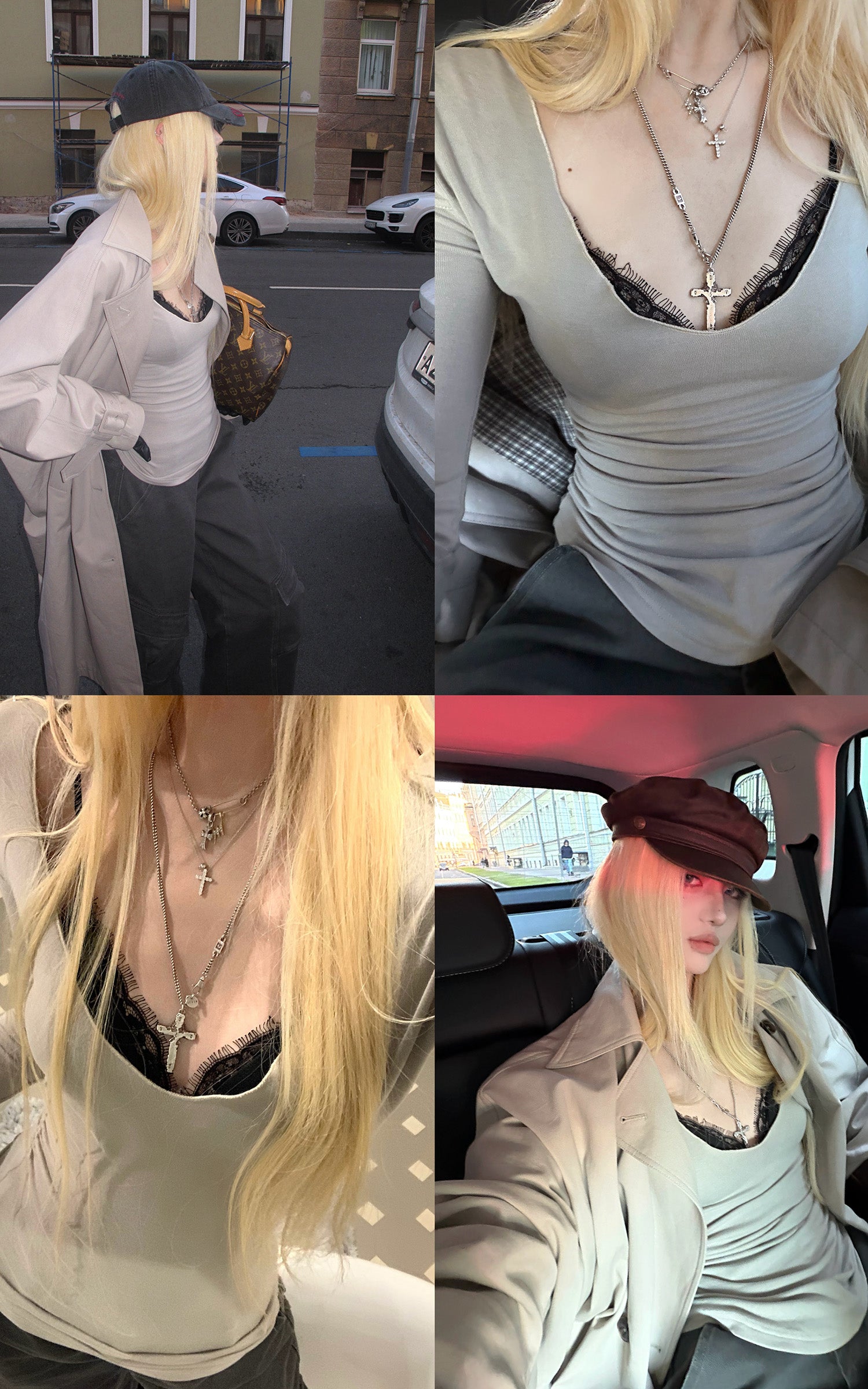 Rase le sol 레이스 트리밍이 돋보이는 골지 딥 V넥 긴팔 티 & 캐미솔 세트
